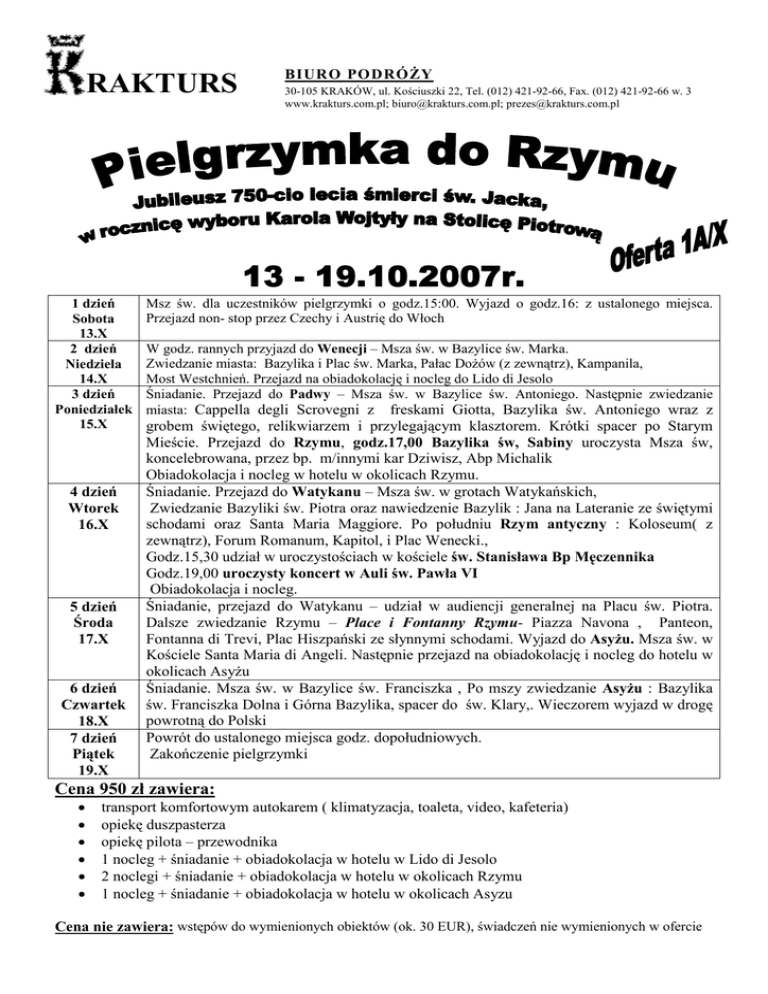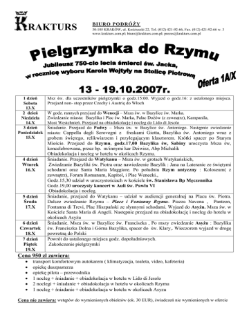 RAKTURS BIURO PODRÓŻY 30-105 KRAKÓW, ul. Kościuszki 22, Tel. (012) 421-92-66, Fax. (012) 421-92-66 w. 3 www.krakturs.com.pl; [email protected]; [email protected] 13 - 19.10.2007r. 1 dzień Sobota 13.X 2 dzień Niedziela 14.X 3 dzień Poniedziałek 15.X 4 dzień Wtorek 16.X 5 dzień Środa 17.X 6 dzień Czwartek 18.X 7 dzień Piątek 19.X Msz św. dla uczestników pielgrzymki o godz.15:00. Wyjazd o godz.16: z ustalonego miejsca. Przejazd non- stop przez Czechy i Austrię do Włoch W godz. rannych przyjazd do Wenecji – Msza św. w Bazylice św. Marka. Zwiedzanie miasta: Bazylika i Plac św. Marka, Pałac Dożów (z zewnątrz), Kampanila, Most Westchnień. Przejazd na obiadokolację i nocleg do Lido di Jesolo Śniadanie. Przejazd do Padwy – Msza św. w Bazylice św. Antoniego. Następnie zwiedzanie miasta: Cappella degli Scrovegni z freskami Giotta, Bazylika św. Antoniego wraz z grobem świętego, relikwiarzem i przylegającym klasztorem. Krótki spacer po Starym Mieście. Przejazd do Rzymu, godz.17,00 Bazylika św, Sabiny uroczysta Msza św, koncelebrowana, przez bp. m/innymi kar Dziwisz, Abp Michalik Obiadokolacja i nocleg w hotelu w okolicach Rzymu. Śniadanie. Przejazd do Watykanu – Msza św. w grotach Watykańskich, Zwiedzanie Bazyliki św. Piotra oraz nawiedzenie Bazylik : Jana na Lateranie ze świętymi schodami oraz Santa Maria Maggiore. Po południu Rzym antyczny : Koloseum( z zewnątrz), Forum Romanum, Kapitol, i Plac Wenecki., Godz.15,30 udział w uroczystościach w kościele św. Stanisława Bp Męczennika Godz.19,00 uroczysty koncert w Auli św. Pawła VI Obiadokolacja i nocleg. Śniadanie, przejazd do Watykanu – udział w audiencji generalnej na Placu św. Piotra. Dalsze zwiedzanie Rzymu – Place i Fontanny Rzymu- Piazza Navona , Panteon, Fontanna di Trevi, Plac Hiszpański ze słynnymi schodami. Wyjazd do Asyżu. Msza św. w Kościele Santa Maria di Angeli. Następnie przejazd na obiadokolację i nocleg do hotelu w okolicach Asyżu Śniadanie. Msza św. w Bazylice św. Franciszka , Po mszy zwiedzanie Asyżu : Bazylika św. Franciszka Dolna i Górna Bazylika, spacer do św. Klary,. Wieczorem wyjazd w drogę powrotną do Polski Powrót do ustalonego miejsca godz. dopołudniowych. Zakończenie pielgrzymki Cena 950 zł zawiera: • • • • • • transport komfortowym autokarem ( klimatyzacja, toaleta, video, kafeteria) opiekę duszpasterza opiekę pilota – przewodnika 1 nocleg + śniadanie + obiadokolacja w hotelu w Lido di Jesolo 2 noclegi + śniadanie + obiadokolacja w hotelu w okolicach Rzymu 1 nocleg + śniadanie + obiadokolacja w hotelu w okolicach Asyzu Cena nie zawiera: wstępów do wymienionych obiektów (ok. 30 EUR), świadczeń nie wymienionych w ofercie