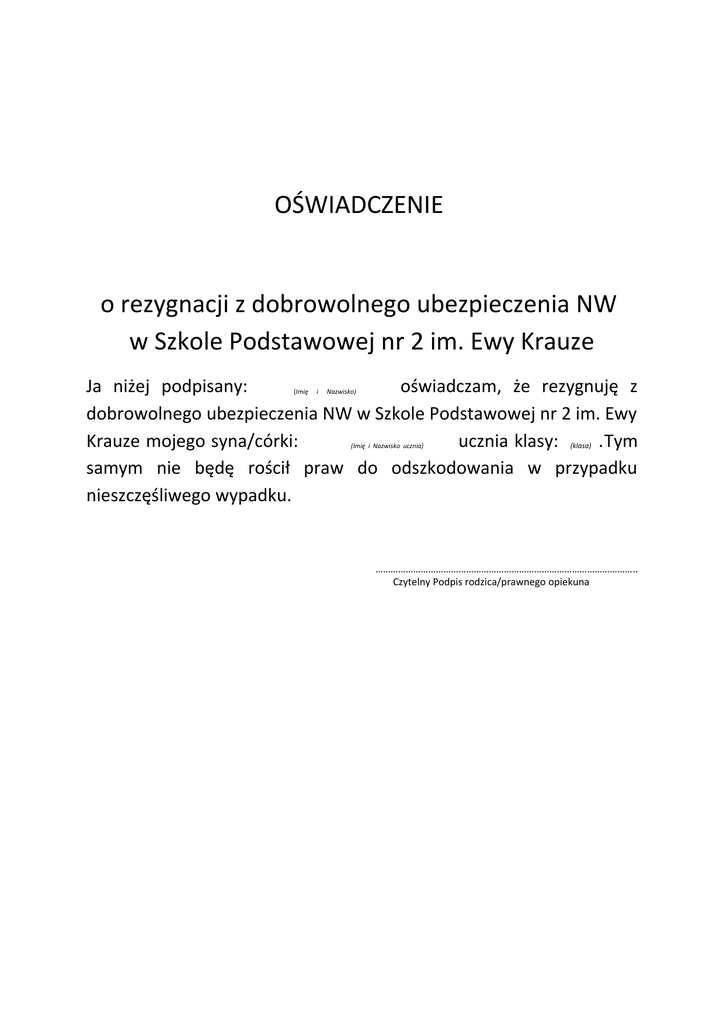OŚWIADCZENIE o rezygnacji z dobrowolnego ubezpieczenia NW w Szkole Podstawowej nr 2 im. Ewy Krauze Ja niżej podpisany: oświadczam, że rezygnuję z dobrowolnego ubezpieczenia NW w Szkole Podstawowej nr 2 im. Ewy Krauze mojego syna/córki: ucznia klasy: .Tym samym nie będę rościł praw do odszkodowania w przypadku nieszczęśliwego wypadku. (Imię i Nazwisko) (Imię i Nazwisko ucznia) (klasa) ………………………………………………………………………………………….. Czytelny Podpis rodzica/prawnego opiekuna