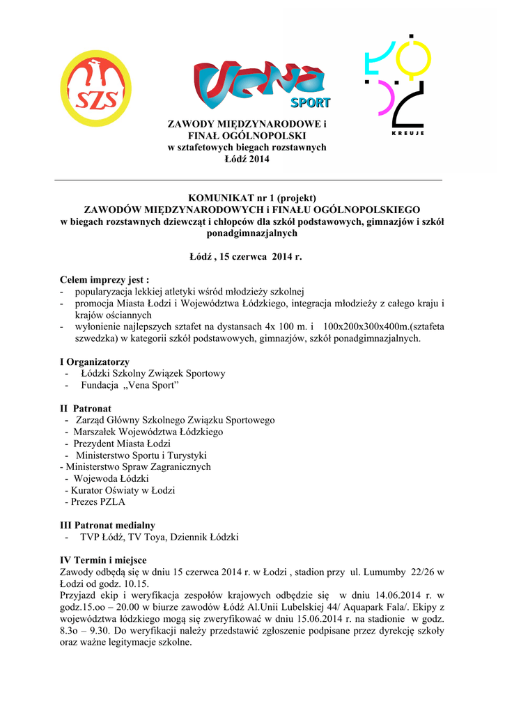 ZAWODY MIĘDZYNARODOWE i FINAŁ OGÓLNOPOLSKI w sztafetowych biegach rozstawnych Łódź 2014 KOMUNIKAT nr 1 (projekt) ZAWODÓW MIĘDZYNARODOWYCH i FINAŁU OGÓLNOPOLSKIEGO w biegach rozstawnych dziewcząt i chłopców dla szkół podstawowych, gimnazjów i szkół ponadgimnazjalnych Łódź , 15 czerwca 2014 r. Celem imprezy jest : - popularyzacja lekkiej atletyki wśród młodzieży szkolnej - promocja Miasta Łodzi i Województwa Łódzkiego, integracja młodzieży z całego kraju i krajów ościannych - wyłonienie najlepszych sztafet na dystansach 4x 100 m. i 100x200x300x400m.(sztafeta szwedzka) w kategorii szkół podstawowych, gimnazjów, szkół ponadgimnazjalnych. I Organizatorzy - Łódzki Szkolny Związek Sportowy - Fundacja „Vena Sport” II Patronat - Zarząd Główny Szkolnego Związku Sportowego - Marszałek Województwa Łódzkiego - Prezydent Miasta Łodzi - Ministerstwo Sportu i Turystyki - Ministerstwo Spraw Zagranicznych - Wojewoda Łódzki - Kurator Oświaty w Łodzi - Prezes PZLA III Patronat medialny - TVP Łódź, TV Toya, Dziennik Łódzki IV Termin i miejsce Zawody odbędą się w dniu 15 czerwca 2014 r. w Łodzi , stadion przy ul. Lumumby 22/26 w Łodzi od godz. 10.15. Przyjazd ekip i weryfikacja zespołów krajowych odbędzie się w dniu 14.06.2014 r. w godz.15.oo – 20.00 w biurze zawodów Łódź Al.Unii Lubelskiej 44/ Aquapark Fala/. Ekipy z województwa łódzkiego mogą się zweryfikować w dniu 15.06.2014 r. na stadionie w godz. 8.3o – 9.30. Do weryfikacji należy przedstawić zgłoszenie podpisane przez dyrekcję szkoły oraz ważne legitymacje szkolne. Jednocześnie prosimy ekipy z Łodzi i woj.łódzkiego o dokonanie weryfikacji w dniu 14.06 (sobota) w Aguaparku Fala V Uczestnictwo W zawodach prawo startu mają szkolne zespoły sztafetowe , które zajęły I miejsce w zawodach wojewódzkich dziewcząt i chłopców w kategoriach : - szkół podstawowych/ rocznik 2001 i młodsi/ - gimnazjów /rocznik 1998 i młodsi/ - szkół ponadgimnazjalnych / rocznik 1994 i młodsi/ W przypadku nie rozegrania przez województwo zawodów eliminacyjnych ZWSZS, po konsultacji z organizatorem, ma prawo wytypować szkołę , która będzie go reprezentować. Zgłoszony zespół składa się z 4 zawodników plus jeden opiekun. Zawodnikowi wolno startować tylko w jednej sztafecie. Zawody zostaną przeprowadzone zgodnie z aktualnymi przepisami PZLA Va Zapraszamy do udziału w zawodach najlepsze sztafety szkolne (po jednej w każdej z 12 konkurencji), z następujących krajów: Niemcy, Czechy, Słowacja, Wegry, Litwa. O zgłoszenia tych sztafet prosimy krajowe szkolne związki sportowe do Zarządu Głównego SZS ul. Ciołkosza 1/29, 03-134 Warszawa, telefon/fax: 22 621-85-93, telefon/fax: 22 84891-17, email: [email protected] Przyjazd ekip zagranicznych 13.06.2014 do biura zawodów Aquapark Fala w godzinach 17.00-22.00. VI Finansowanie Organizator zapewnia dla ekip przyjezdnych 5 osób / 4 zawodników plus opiekun/ zakwaterowanie, kolacje w dniu 14.06.2014,r oraz śniadanie i obiad w dniu 15.06.2014 r. Drużyny z województwa łódzkiego nie korzystają z noclegów, otrzymują obiad w dniu 15.06.2014 r. Opłata za osoby ponad w/w limit wynosi 100,- zł. od 1 osoby, płatne przy weryfikacji, dotyczy także kierowców. Organizator dla ekip przyjezdnych zapewnia 60 min. bezpłatny pobyt na pływalniach Aquaparku Fala tylko w dniu 14.06.2014 r. w godz.15,oo – 20.oo. Udział drużyn w zawodach jest bezpłatny. VI a Dla zespołów zagranicznych zapewniamy 1 godz. pobyt na pływalni w dniach 13 lub 14.06.2014 (konieczne kostiumy kąpielowe). Dla zespołów zagranicznych (5 osób) organizatorzy zapewniają: 2 noclegi (13/14 i 14/15.06), obiadokolację 13.06 w Aquaparku, 14 i 15.06 śniadania i obiadokolacje (9-11 i 14-16, ul.Pomorska 21). W dniu 14.06 (sobota) program pobytu dla sztafet zagranicznych zabezpieczy Biuro Promocji UMŁ i Departament Promocji i Współpracy Zagranicznej Urzędu Marszałkowskiego w Łodzi. Koszty przejazdu pokrywają ekipy zagraniczne. VII Zgłoszenia Zgłoszenia imienne na załączonym formularzu należy przesłać do dnia 6.06.2014 r. na adres Łódzkiego Szkolnego Związku Sportowego 90-542 Łódź ul. Żeromskiego 115 , e –mail dzialsportu@ lszs.pl , tel/fax 042 630-73-45 /46 Wstępne potwierdzenie udziału przez ZW SZS prosimy przekazać telefonicznie lub elektronicznie do dnia 15.05.2014 r. VIII Nagrody Każdy uczestnik finałów otrzymuje pakiet startowy ( upominki od sponsorów), oraz okolicznościową koszulkę. Każda drużyna otrzymuje pamiątkowy dyplom. Za miejsca I – III każda szkoła otrzymuje puchar i dyplom, a uczestnicy sztafet medale i nagrody rzeczowe. Opiekunowie zwycięskich sztafet otrzymają podwójne dwudniowe zaproszenia do COSA AZS Wilkasy. Łączna pula nagród i upominków wynosi ponad 100.000,- zł. Jednocześnie informujemy, że organizatorzy czynią starania w kierunku pozyskania kolejnych sponsorów i zwiększenia puli nagród. Sponsorzy nagród Rossmann, Społeczna Akademia Nauk, Torf Corporation, Aquapark Fala, Firma IS, Siemens AGD, COSA AZS Wilkasy, europosłanka Joanna Skrzydlewska, Tico-3000, Gronowalski Crystal Fashion, Lenora, Restauracja Polska, Enterprise Support. Urząd Miasta Łodzi, Urząd Marszałkowski Województwa Łódzkiego, Fundacja Vena Sport IX Program zawodów Dla wszystkich kategorii wiekowych dziewcząt i chłopców rozegrane zostaną sztafety 4x100 m. i sztafety szwedzkie /100 x 200x 300x 400 m/. Program minutowy ukaże się na naszej stronie www.lszs.pl w dniu 9.06.2014 r. , zostanie również przesłany do ZW SZS. X Różne - przyjazd ekip na koszt własny - organizator zastrzega sobie prawo do dokooptowania dodatkowych zespołów sztafetowych - ostateczna interpretacja regulaminu należy do organizatora - organizator zapewnia szatnie jedynie do przebrania się - organizator nie ponosi odpowiedzialności za rzeczy pozostawione bez opieki. Dodatkowych informacji udzielają - p.Jeziers