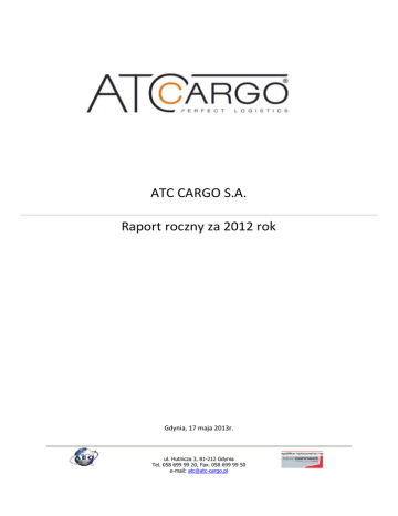 ATC CARGO S.A. Raport roczny za 2012 rok Gdynia, 17 maja 2013r. ul. Hutnicza 3, 81-212 Gdynia Tel. 058 699 99 20, Fax. 058 699 99 50 e-mail: [email protected] Raport roczny za 2012 rok SPIS TREŚCI 1. PISMO ZARZĄDU DO AKCJONARIUSZY 2. PODSTAWOWE POZYCJE SPRAWOZDANIA FINANSOWEGO PRZELICZONE NA EURO 3. ROCZNE SPRAWOZDANIE FINANSOWE ZA OKRES OBROTOWY OD DNIA 01 STYCZNIA DO DNIA 31 GRUDNIA 2012 ROKU 4. SPRAWOZDANIE ZARZĄDU Z DZIAŁALNOŚCI SPÓŁKI ATC CARGO S.A. W ROKU OBROTOWYM OD DNIA 01 STYCZNIA DO DNIA 31 GRUDNIA 2012 ROKU 5. OŚWIADCZENIA ZARZĄDU 6. OPINIA ORAZ RAPORT BIEGŁEGO REWIDENTA 7. INFORMACJA O STOSOWANIU ZASAD ŁADU KORPORACYJNEGO www.atc-cargo.pl 2|Strona Raport roczny za 2012 rok ATC CARGO S.A. Raport roczny za 2012 rok 1. Pismo Zarządu do Akcjonariuszy www.atc-cargo.pl 3|Strona Raport roczny za 2012 rok Szanowni Państwo, Akcjonariusze, Inwestorzy, Oddajemy w Państwa ręce raport oraz wyniki finansowe Spółki ATC CARGO za 2012 rok wraz z komentarzem. W 2012 roku zysk netto osiągnął prognozowany przez Zarząd ATC CARGO S.A. poziom 1.307.693,62 złotych. Rok 2012 był dla ATC CARGO S.A. rokiem przełomowych zmian w historii rozwoju Spółki. Wprowadzenie nowych usług do portfolio ATC CARGO S.A., ze szczególnym uwzględnieniem usług transportu intermodalnego, było bez wątpienia zdarzeniem kluczowym w utrwaleniu dominującej pozycji ATC CARGO S.A. na rynku. W omawianym okresie Spółka musiała sprostać konieczności rozwoju struktur organizacyjnych, zwiększenia zatrudnienia, czy chociażby wprowadzeniu odpowiednich narzędzi technicznych i informatycznych pozwalających realizować nowe usługi. Był to naturalny kierunek rozwoju, który w przekonaniu Zarządu ATC CARGO S.A. będzie czynnikiem decydującym o pozycji i kondycji Spółki w przyszłych latach. Równie istotnym czynnikiem w działalności Spółki w 2012 roku było położenie nacisku na główny produkt Spółki, jakim jest fracht morski. Informujemy, iż Spółka odnotowała wysokość przychodów ze sprzedaży usług spedycji morskiej w kwocie 29,4 mln złotych, co stanowi wzrost o 13% w stosunku do roku 2011 roku. Co więcej, Spółka odnotowała wzrost przychodów z udziału usług intermodalnych i spedycji lądowej kontenerowej o 5% w stosunku do roku 2011, przy czym w usłudze transportu intermodalnego odnotowano gwałtowny wzrost o 1922% w stosunku do roku 2011. Warty uwagi jest fakt, że najważniejszy dla Spółki miernik jej kondycji rynkowej, tj. ilość obsługiwanych kontenerów, wzrósł o 13% w stosunku do roku 2011. Przełomowym zdarzeniem w 2012 roku było wdrożenie usług transportu intermodalnego, do czego przyczynił się fakt, że coraz większe grono odbiorców usług spedycyjnych w Polsce warunkuje współpracę koniecznością realizacji usług w oparciu o przewozy intermodalne. Tendencja ta widoczna jest szczególnie wśród dużych międzynarodowych koncernów, gdzie znaczący nacisk kładziony jest na spełnianie unijnych wymogów środowiskowych, które postulują ograniczenie udziału transportu drogowego na rzecz transportu kolejowego. Zmiana oczekiwań klientów co do sposobu realizacji usługi transportu wiązała się z koniecznością implementacji przez Spółkę nowego rozwiązania polegającego na wprowadzeniu do wachlarza oferowanych usług nowej usługi transportu intermodalnego. Pozwoliło to ATC CARGO S.A. na utrzymanie dotychczasowych klientów warunkujących współpracę możliwością realizacji usług transportem intermodalnym, a także na poszerzenie portfolio klientów o nowe podmioty. Powyższy proces dostosowania dotychczasowych procesów logistycznych świadczenia usług transportowych na rzecz klientów do wymogów transportu intermodalnego miał niewątpliwy wpływ na poziom osiągniętego zysku netto. Nie bez znaczenia pozostały również wysokie koszty ogólne związane z działaniami polegającymi na wdrożeniu nowych usług: przede wszystkim serwisu lotniczego, morskich przesyłek drobnicowych oraz logistyki magazynowej. Wierzymy, że nasza strategia umożliwi wzrost pozycji ATC CARGO S.A. w sektorze Transport Spedycja Logistyka (TSL) w przyszłych latach. Jesteśmy przekonani, że oferowanie usług wpisujących się w politykę środowiskową i społeczną zainteresują większości największych przedsiębiorstw działających w Polsce pozwoli nam również na zbudowanie oraz poniesienie jakości relacji korporacyjnych z aktualnymi lub przyszłymi klientami. Strategia rozwoju przyjęta na najbliższe lata zakłada dalszy rozwój głównego obszaru działania ATC CARGO S.A. – spedycji morskiej – poprzez pozyskiwanie nowych klientów z jednoczesnym podjęciem działań prowadzących do uzyskania wyższych marż z tytułu świadczenia usług spedycji morskiej. Emitent planuje podjąć również intensywne działania marketingowe wpisujące się w trend obniżania kosztów zarządzania procesami logistycznymi wśród potencjalnych klientów Spółki. www.atc-cargo.pl 4|Strona Raport roczny za 2012 rok Jesteśmy przekonani, iż nasza strategia rozwoju będzie z pewnością miały wpływ na wyniki finansowe realizowane przez ATC Cargo S.A. w 2013 roku. Ciesząc się z zaufania, jakim już nas Państwo obdarzyli w czasie naszej obecności na rynku NewConnect, możemy zapewnić o pełnym zaangażowaniu na rzecz rozwoju Spółki. Zapraszamy Państwa do zapoznania się z treścią raportu. Z poważaniem, Artur Jadeszko Prezes Zarządu www.atc-cargo.pl Wiktor Bąk Wiceprezes Zarządu 5|Strona Raport roczny za 2012 rok ATC CARGO S.A. Raport roczny za 2012 rok 2. Podstawowe pozycje sprawozdania finansowego przeliczone na EURO www.atc-cargo.pl 6|Strona Raport roczny za 2012 rok www.atc-cargo.pl 7|Strona Raport roczny za 2012 rok www.atc-cargo.pl 8|Strona Raport roczny za 2012 rok www.atc-cargo.pl 9|Strona Raport roczny za 2012 rok www.atc-cargo.pl 10 | S t r o n a Raport roczny za 2012 rok www.atc-cargo.pl 11 | S t r o n a Raport roczny za 2012 r