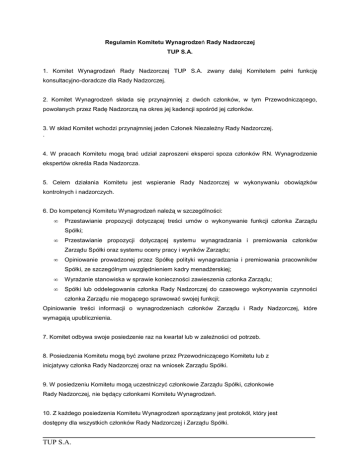 Regulamin Komitetu Wynagrodzeń Rady Nadzorczej TUP S.A. 1. Komitet Wynagrodzeń Rady Nadzorczej TUP S.A. zwany dalej Komitetem pełni funkcję konsultacyjno-doradcze dla Rady Nadzorczej. 2. Komitet Wynagrodzeń składa się przynajmniej z dwóch członków, w tym Przewodniczącego, powołanych przez Radę Nadzorczą na okres jej kadencji spośród jej członków. 3. W skład Komitet wchodzi przynajmniej jeden Członek NiezaleŜny Rady Nadzorczej. . 4. W pracach Komitetu mogą brać udział zaproszeni eksperci spoza członków RN. Wynagrodzenie ekspertów określa Rada Nadzorcza. 5. Celem działania Komitetu jest wspieranie Rady Nadzorczej w wykonywaniu obowiązków kontrolnych i nadzorczych. 6. Do kompetencji Komitetu Wynagrodzeń naleŜą w szczególności: • Przestawianie propozycji dotyczącej treści umów o wykonywanie funkcji członka Zarządu Spółki; • Przestawianie propozycji dotyczącej systemu wynagradzania i premiowania członków Zarządu Spółki oraz systemu oceny pracy i wyników Zarządu; • Opiniowanie prowadzonej przez Spółkę polityki wynagradzania i premiowania pracowników Spółki, ze szczególnym uwzględnieniem kadry menadŜerskiej; • WyraŜanie stanowiska w sprawie konieczności zawieszenia członka Zarządu; • Spółki lub oddelegowania członka Rady Nadzorczej do czasowego wykonywania czynności członka Zarządu nie mogącego sprawować swojej funkcji; Opiniowanie treści informacji o wynagrodzeniach członków Zarządu i Rady Nadzorczej, które wymagają upublicznienia. 7. Komitet odbywa swoje posiedzenie raz na kwartał lub w zaleŜności od potrzeb. 8. Posiedzenia Komitetu mogą być zwołane przez Przewodniczącego Komitetu lub z inicjatywy członka Rady Nadzorczej oraz na wniosek Zarządu Spółki. 9. W posiedzeniu Komitetu mogą uczestniczyć członkowie Zarządu Spółki, członkowie Rady Nadzorczej, nie będący członkami Komitetu Wynagrodzeń. 10. Z kaŜdego posiedzenia Komitetu Wynagrodzeń sporządzany jest protokół, który jest dostępny dla wszystkich członków Rady Nadzorczej i Zarządu Spółki. TUP S.A. 11. Co roku Komitet Wynagrodzeń przedkłada Radzie Nadzorczej sprawozdanie ze swej działalności w terminie, który umoŜliwi zapoznaniem się z nim przed sporządzeniem sprawozdania Rady Nadzorczej z corocznej oceny sytuacji Spółki. TUP S.A.