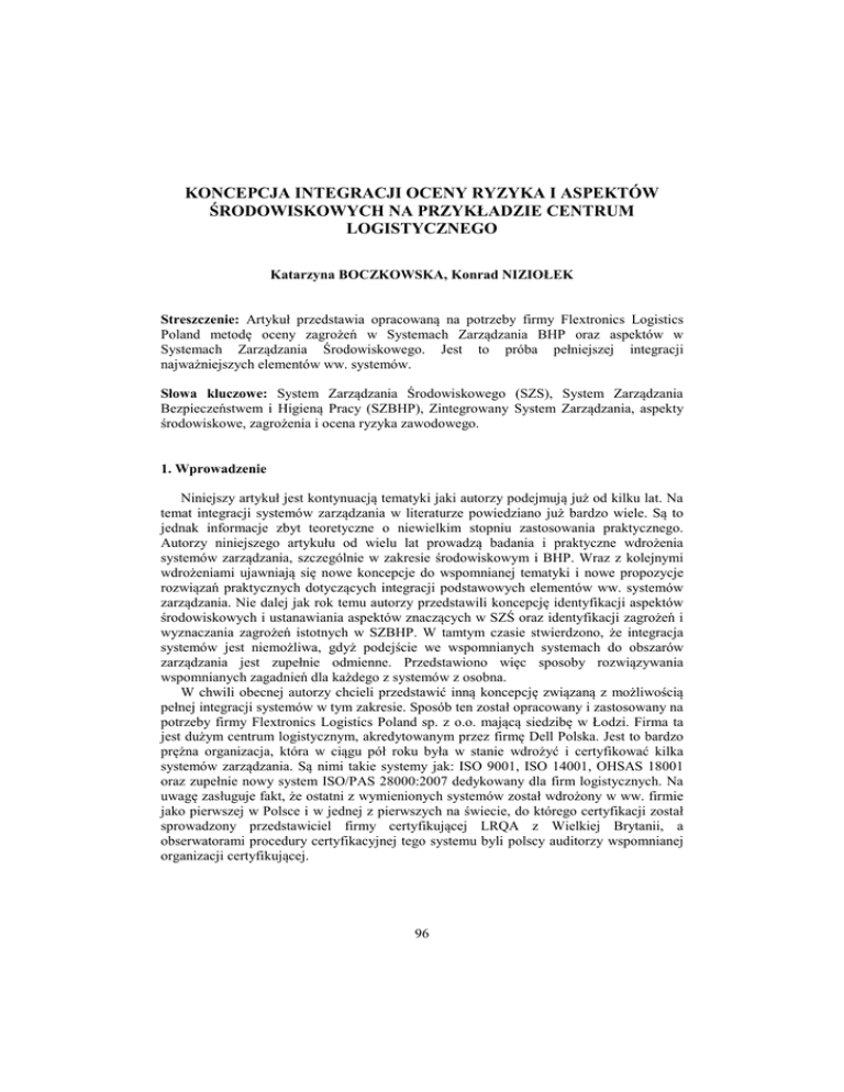 KONCEPCJA INTEGRACJI OCENY RYZYKA I ASPEKTÓW ŚRODOWISKOWYCH NA PRZYKŁADZIE CENTRUM LOGISTYCZNEGO Katarzyna BOCZKOWSKA, Konrad NIZIOŁEK Streszczenie: Artykuł przedstawia opracowaną na potrzeby firmy Flextronics Logistics Poland metodę oceny zagrożeń w Systemach Zarządzania BHP oraz aspektów w Systemach Zarządzania Środowiskowego. Jest to próba pełniejszej integracji najważniejszych elementów ww. systemów. Słowa kluczowe: System Zarządzania Środowiskowego (SZS), System Zarządzania Bezpieczeństwem i Higieną Pracy (SZBHP), Zintegrowany System Zarządzania, aspekty środowiskowe, zagrożenia i ocena ryzyka zawodowego. 1. Wprowadzenie Niniejszy artykuł jest kontynuacją tematyki jaki autorzy podejmują już od kilku lat. Na temat integracji systemów zarządzania w literaturze powiedziano już bardzo wiele. Są to jednak informacje zbyt teoretyczne o niewielkim stopniu zastosowania praktycznego. Autorzy niniejszego artykułu od wielu lat prowadzą badania i praktyczne wdrożenia systemów zarządzania, szczególnie w zakresie środowiskowym i BHP. Wraz z kolejnymi wdrożeniami ujawniają się nowe koncepcje do wspomnianej tematyki i nowe propozycje rozwiązań praktycznych dotyczących integracji podstawowych elementów ww. systemów zarządzania. Nie dalej jak rok temu autorzy przedstawili koncepcję identyfikacji aspektów środowiskowych i ustanawiania aspektów znaczących w SZŚ oraz identyfikacji zagrożeń i wyznaczania zagrożeń istotnych w SZBHP. W tamtym czasie stwierdzono, że integracja systemów jest niemożliwa, gdyż podejście we wspomnianych systemach do obszarów zarządzania jest zupełnie odmienne. Przedstawiono więc sposoby rozwiązywania wspomnianych zagadnień dla każdego z systemów z osobna. W chwili obecnej autorzy chcieli przedstawić inną koncepcję związaną z możliwością pełnej integracji systemów w tym zakresie. Sposób ten został opracowany i zastosowany na potrzeby firmy Flextronics Logistics Poland sp. z o.o. mającą siedzibę w Łodzi. Firma ta jest dużym centrum logistycznym, akredytowanym przez firmę Dell Polska. Jest to bardzo prężna organizacja, która w ciągu pół roku była w stanie wdrożyć i certyfikować kilka systemów zarządzania. Są nimi takie systemy jak: ISO 9001, ISO 14001, OHSAS 18001 oraz zupełnie nowy system ISO/PAS 28000:2007 dedykowany dla firm logistycznych. Na uwagę zasługuje fakt, że ostatni z wymienionych systemów został wdrożony w ww. firmie jako pierwszej w Polsce i w jednej z pierwszych na świecie, do którego certyfikacji został sprowadzony przedstawiciel firmy certyfikującej LRQA z Wielkiej Brytanii, a obserwatorami procedury certyfikacyjnej tego systemu byli polscy auditorzy wspomnianej organizacji certyfikującej. 96 2. Aspekt środowiskowy i ocena ryzyka (zagrożenie) jako kluczowe elementy systemów zarządzania Analizując wymagania znormalizowanych systemów zarządzania należy zauważyć, że każdy z nich kładzie nacisk na pewien, dla każdej normy inny, element. W Systemie Zarządzania Środowiskowego ISO 14001 bezwzględnie najistotniejszym elementem jest pojęcie aspektu środowiskowego i jego konsekwencji, tj. znaczącego aspektu środowiskowego. Przybliżając wspomniane pojęcia w rozumieniu definicji zawartej w normie aspekt środowiskowy rozumiany jest jako: „element działań organizacji, jej wyrobów lub usług, który może wzajemnie oddziaływać ze środowiskiem” [1]. Natomiast znaczący aspekt środowiskowy to: „… ten, który ma, lub może mieć, znaczący wpływ na środowisko” [1]. W Systemie Zarządzania Bezpieczeństwem i Higieną Pracy najistotniejszymi elementami są pojęcia: zagrożenia, znaczącego zagrożenia oraz ryzyka zawodowego i jego oceny. Zgodnie z SZBHP zagrożenie rozumiane jest jako: „stan środowiska pracy mogący spowodować wypadek lub chorobę” [2], natomiast jego identyfikacja to: „proces rozpoznawania tego czy zagrożenie istnieje oraz określenia jego charakterystyk” [2]. Konsekwencja powyższych, czyli zagrożenie znaczące, rozumiane jest jako: „zagrożenie mogące spowodować poważne i nieodwracalne uszkodzenie zdrowia lub śmierć, występujące w szczególności podczas wykonywania prac szczególnie niebezpiecznych lub w sytuacjach poważnych awarii” [1]. Przechodząc do ryzyka zawodowego, to zgodnie z normą PN-N 18001 rozumie się je jako: „prawdopodobieństwo wystąpienia niepożądanych zdarzeń związanych z wykonywaną pracą powodujących straty, w szczególności wystąpienia u pracowników niekorzystnych skutków zdrowotnych w wyniku zagrożeń zawodowych występujących w środowisku pracy lub sposobu wykonywania pracy” [1], natomiast ocena ryzyka zawodowego to: „proces analizowania ryzyka zawodowego i wyznaczania jego dopuszczalności” [1]. Powyższe elementy należy uznać za szczególnie istotne, gdyż po pierwsze prawidłowo dokonana ocena aspektów środowiskowych w SZŚ z uwzględnieniem kategoryzacji i ustaleniem gradacji aspektów, daje możliwość wyznaczenia tzw. aspektów środowiskowych znaczących. Najwyższe kierownictwo z grona znaczących aspektów przyjmuje cele środowiskowe, które w ramach ciągłego doskonalenia systemu zarządzania będą realizowane w założonym okresie czasu. Dla wszystkich z celów zgodnie z wymaganiami normy ISO 14001 należy opracować program środowiskowy dla każdego celu z osobna. Program taki powinien zawierać co najmniej: − obowiązki (zadania) dla osób, w ramach konkretnego programu; − wykaz osób realizujących dane zadanie (obowiązki) w ramach danego programu; − termin realizacji danego zadania (obowiązku), jak i celu środowiskowego; − środki potrzebne do realizacji danego zadania (obowiązku). Kolejnym elementem, do którego niezbędne jest znajomość aspektów i znaczących aspektów środowiskowych są działania i procedury: − gotowości i reagowanie na awarie środowiskowe; − monitorowanie i pomiary; 