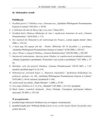 dr Aleksandra Arndt – sylwetka dr Aleksandra Arndt Publikacje 1. Przekład pieśni I 1 Tibullusa wraz z komentarzem, „Symbolae Philologorum Posnaniensium Graecae et Latinae” XXI 2011, s. 49-58. 2. L’utilisation du latin du Moyen Âge à nos jours, Tuluza 2011. 3. Przekład listów Pliniusza Młodszego do żony i współczesny komentarz do nich, „Classica Wratislaviensia”, XXX/2010, s. 7-13. 4. Der Ausdruck der Romantik in der Liebeselegie des Properz, „Laetae segetes iterum”, Brno 2008, s. 118-125. 5. A duch jego był napięty jak łuk – Diodor, Biblioteka XX 36 (przekład z j. greckiego), „Symbolae Philologorum Posnaniensium Graecae et Latinae” XVIII 2008, s. 220-221. 6. Amor i Wenus w elegiach Tibullusa, „Classica Wratislaviensia” XXVIII 2008, s. 203-209. 7. Zmysłowość poskromiona. Antyczny poeta Tibullus we współczesnych przekładach polskich, „Między oryginałem a przekładem. Wzniosłość i styl wysoki w przekładzie” XIV 2008, s. 3754. 8. Marathus, czyli żart poetycki Tibullusa, „Classica Wratislaviensia” XXVII 2007, s. 7-19. (artykuł i przekład elegii I 4; I 8; I 9). 9. Hellenistyczny wizerunek bogów w „Wyprawie Argonautów” Apolloniosa Rodyjskiego (na podstawie epylionu z ks. III), „Symbolae Philologorum Posnanienisum Graecae et Latinae” XVII 2007, s. 49-56. (artykuł i przekład III 1-150). 10. Anakreontyki (przekład), „Śląski filomata”, 1/2006, s. 67-69. 11. Trzy elegie Tibullusa (I 3, I 6, II 4), „Meander” LXI 2006, s. 213-219. (przekład) 12. Śląski badacz rzymskich katakumb, „Nowy Filomata. Czasopismo poświęcone kulturze antycznej” IX 2005, s. 155-156. W przygotowaniu 1. przekład elegii miłosnych Tibullusa wraz ze wstępem i komentarzem. 2. przekład książki prof. Wilfrieda Stroha Latein ist tot, es lebe Latein! Kleine Geschichte einer großen Sprache. ***