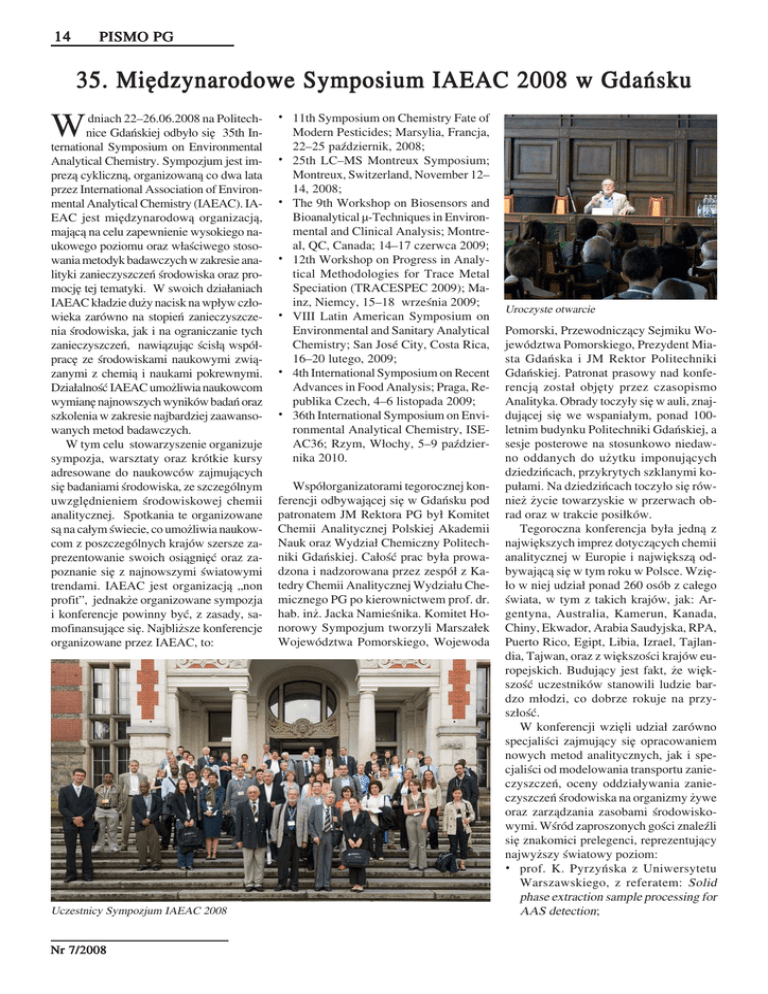 14 PISMO PG 35. Międzynarodowe Symposium IAEAC 2008 w Gdańsku W dniach 22–26.06.2008 na Politech− nice Gdańskiej odbyło się 35th In− ternational Symposium on Environmental Analytical Chemistry. Sympozjum jest im− prezą cykliczną, organizowaną co dwa lata przez International Association of Environ− mental Analytical Chemistry (IAEAC). IA− EAC jest międzynarodową organizacją, mającą na celu zapewnienie wysokiego na− ukowego poziomu oraz właściwego stoso− wania metodyk badawczych w zakresie ana− lityki zanieczyszczeń środowiska oraz pro− mocję tej tematyki. W swoich działaniach IAEAC kładzie duży nacisk na wpływ czło− wieka zarówno na stopień zanieczyszcze− nia środowiska, jak i na ograniczanie tych zanieczyszczeń, nawiązując ścisłą współ− pracę ze środowiskami naukowymi zwią− zanymi z chemią i naukami pokrewnymi. Działalność IAEAC umożliwia naukowcom wymianę najnowszych wyników badań oraz szkolenia w zakresie najbardziej zaawanso− wanych metod badawczych. W tym celu stowarzyszenie organizuje sympozja, warsztaty oraz krótkie kursy adresowane do naukowców zajmujących się badaniami środowiska, ze szczególnym uwzględnieniem środowiskowej chemii analitycznej. Spotkania te organizowane są na całym świecie, co umożliwia naukow− com z poszczególnych krajów szersze za− prezentowanie swoich osiągnięć oraz za− poznanie się z najnowszymi światowymi trendami. IAEAC jest organizacją „non profit”, jednakże organizowane sympozja i konferencje powinny być, z zasady, sa− mofinansujące się. Najbliższe konferencje organizowane przez IAEAC, to: · · · · · · · 11th Symposium on Chemistry Fate of Modern Pesticides; Marsylia, Francja, 22–25 październik, 2008; 25th LC–MS Montreux Symposium; Montreux, Switzerland, November 12– 14, 2008; The 9th Workshop on Biosensors and Bioanalytical µ−Techniques in Environ− mental and Clinical Analysis; Montre− al, QC, Canada; 14–17 czerwca 2009; 12th Workshop on Progress in Analy− tical Methodologies for Trace Metal Speciation (TRACESPEC 2009); Ma− inz, Niemcy, 15–18 września 2009; VIII Latin American Symposium on Environmental and Sanitary Analytical Chemistry; San José City, Costa Rica, 16–20 lutego, 2009; 4th International Symposium on Recent Advances in Food Analysis; Praga, Re− publika Czech, 4–6 listopada 2009; 36th International Symposium on Envi− ronmental Analytical Chemistry, ISE− AC36; Rzym, Włochy, 5–9 paździer− nika 2010. Współorganizatorami tegorocznej kon− ferencji odbywającej się w Gdańsku pod patronatem JM Rektora PG był Komitet Chemii Analitycznej Polskiej Akademii Nauk oraz Wydział Chemiczny Politech− niki Gdańskiej. Całość prac była prowa− dzona i nadzorowana przez zespół z Ka− tedry Chemii Analitycznej Wydziału Che− micznego PG po kierownictwem prof. dr. hab. inż. Jacka Namieśnika. Komitet Ho− norowy Sympozjum tworzyli Marszałek Województwa Pomorskiego, Wojewoda Uroczyste otwarcie Pomorski, Przewodniczący Sejmiku Wo− jewództwa Pomorskiego, Prezydent Mia− sta Gdańska i JM Rektor Politechniki Gdańskiej. Patronat prasowy nad konfe− rencją został objęty przez czasopismo Analityka. Obrady toczyły się w auli, znaj− dującej się we wspaniałym, ponad 100− letnim budynku Politechniki Gdańskiej, a sesje posterowe na stosunkowo niedaw− no oddanych do użytku imponujących dziedzińcach, przykrytych szklanymi ko− pułami. Na dziedzińcach toczyło się rów− nież życie towarzyskie w przerwach ob− rad oraz w trakcie posiłków. Tegoroczna konferencja była jedną z największych imprez dotyczących chemii analitycznej w Europie i największą od− bywającą się w tym roku w Polsce. Wzię− ło w niej udział ponad 260 osób z całego świata, w tym z takich krajów, jak: Ar− gentyna, Australia, Kamerun, Kanada, Chiny, Ekwador, Arabia Saudyjska, RPA, Puerto Rico, Egipt, Libia, Izrael, Tajlan− dia, Tajwan, oraz z większości krajów eu− ropejskich. Budujący jest fakt, że więk− szość uczestników stanowili ludzie bar− dzo młodzi, co dobrze rokuje na przy− szłość. W konferencji wzięli udział zarówno specjaliści zajmujący się opracowaniem nowych metod analitycznych, jak i spe− cjaliści od modelowania transportu zanie− czyszczeń, oceny oddziaływania zanie− czyszczeń środowiska na organizmy żywe oraz zarządzania zasobami środowisko− wymi. Wśród zaproszonych gości znaleźli się znakomici prelegenci, reprezentujący najwyższy światowy poziom: prof. K. Pyrzyńska z Uniwersytetu Warszawskiego, z referatem: Solid phase extraction sample processing for AAS detection; · Uczestnicy Sympozjum IAEAC 2008 Nr 7/2008 PISMO PG · prof. I. Holoubek z Research Centre for Environmental Chemistry and Ecotoxicology (RECETOX) (RECETOX) (Faculty of Science), Brno, Czechy, z referatem: Integrated approches for determination of environmental and human risks of persistent toxic substances; prof. Ph. Quevauviller z Vrije Univer− siteit Brussel, Dept. of Hydrology, Bel− gia, z referatem: From risk assessment to evaluation of effective measures – implications of monitoring analyses in the implementation of EU environmen− tal policies; prof. F. H. Frimmel z Uniwersytetu w Karlsruhe, z referatem: Water Analy− sis: Key for Understanding Aquatic Systems; prof. D. Knopp z Uniwersytetu w Mo− nachium, z referatem: Immunoanaly− sis in environmental and food chemi− stry; prof. J. Broekaert z Uniwersytetu w Hamburgu, z referatem: Advanced mi− niaturized plasmas as atomic spectro− metric detectors for elemental deter− minations and speciation in environ− mental sciences. W referatach zaproszonych gości, jak i w ponad 60 wystąpieniach prezentowanych przez pozostałych uczestników sympo− zjum, omawiane były najnowsze trendy w analityce zanieczyszczeń środowiska. Wzbudziły one duże zainteresowanie słu− chaczy i