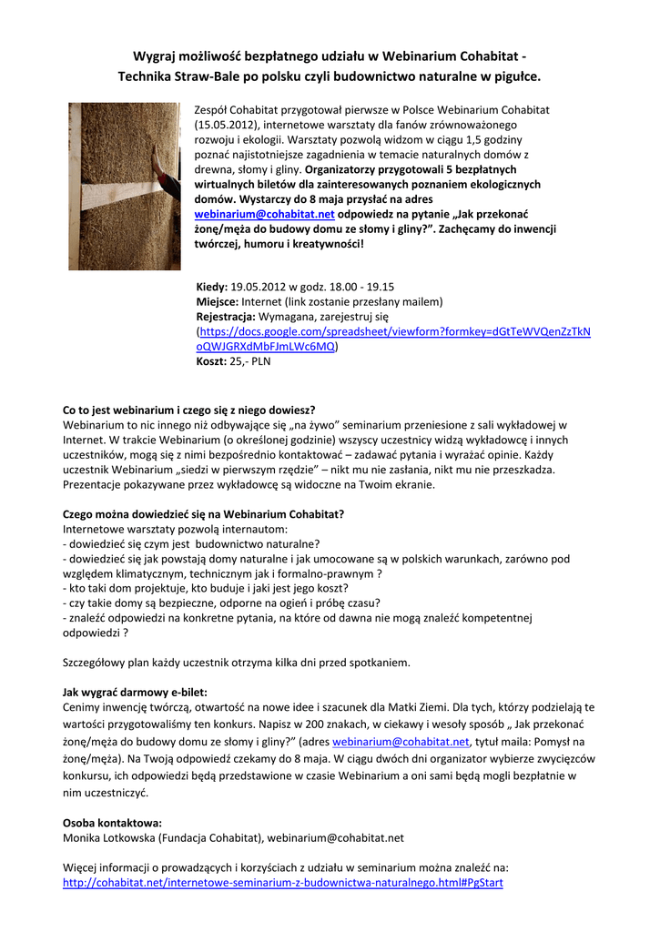 Wygraj możliwość bezpłatnego udziału w Webinarium Cohabitat Technika Straw-Bale po polsku czyli budownictwo naturalne w pigułce. Zespół Cohabitat przygotował pierwsze w Polsce Webinarium Cohabitat (15.05.2012), internetowe warsztaty dla fanów zrównoważonego rozwoju i ekologii. Warsztaty pozwolą widzom w ciągu 1,5 godziny poznać najistotniejsze zagadnienia w temacie naturalnych domów z drewna, słomy i gliny. Organizatorzy przygotowali 5 bezpłatnych wirtualnych biletów dla zainteresowanych poznaniem ekologicznych domów. Wystarczy do 8 maja przysłać na adres [email protected] odpowiedz na pytanie „Jak przekonać żonę/męża do budowy domu ze słomy i gliny?”. Zachęcamy do inwencji twórczej, humoru i kreatywności! Kiedy: 19.05.2012 w godz. 18.00 - 19.15 Miejsce: Internet (link zostanie przesłany mailem) Rejestracja: Wymagana, zarejestruj się (https://docs.google.com/spreadsheet/viewform?formkey=dGtTeWVQenZzTkN oQWJGRXdMbFJmLWc6MQ) Koszt: 25,- PLN Co to jest webinarium i czego się z niego dowiesz? Webinarium to nic innego niż odbywające się „na żywo” seminarium przeniesione z sali wykładowej w Internet. W trakcie Webinarium (o określonej godzinie) wszyscy uczestnicy widzą wykładowcę i innych uczestników, mogą się z nimi bezpośrednio kontaktować – zadawać pytania i wyrażać opinie. Każdy uczestnik Webinarium „siedzi w pierwszym rzędzie” – nikt mu nie zasłania, nikt mu nie przeszkadza. Prezentacje pokazywane przez wykładowcę są widoczne na Twoim ekranie. Czego można dowiedzieć się na Webinarium Cohabitat? Internetowe warsztaty pozwolą internautom: - dowiedzieć się czym jest budownictwo naturalne? - dowiedzieć się jak powstają domy naturalne i jak umocowane są w polskich warunkach, zarówno pod względem klimatycznym, technicznym jak i formalno-prawnym ? - kto taki dom projektuje, kto buduje i jaki jest jego koszt? - czy takie domy są bezpieczne, odporne na ogień i próbę czasu? - znaleźć odpowiedzi na konkretne pytania, na które od dawna nie mogą znaleźć kompetentnej odpowiedzi ? Szczegółowy plan każdy uczestnik otrzyma kilka dni przed spotkaniem. Jak wygrać darmowy e-bilet: Cenimy inwencję twórczą, otwartość na nowe idee i szacunek dla Matki Ziemi. Dla tych, którzy podzielają te wartości przygotowaliśmy ten konkurs. Napisz w 200 znakach, w ciekawy i wesoły sposób „ Jak przekonać żonę/męża do budowy domu ze słomy i gliny?” (adres [email protected], tytuł maila: Pomysł na żonę/męża). Na Twoją odpowiedź czekamy do 8 maja. W ciągu dwóch dni organizator wybierze zwycięzców konkursu, ich odpowiedzi będą przedstawione w czasie Webinarium a oni sami będą mogli bezpłatnie w nim uczestniczyć. Osoba kontaktowa: Monika Lotkowska (Fundacja Cohabitat), [email protected] Więcej informacji o prowadzących i korzyściach z udziału w seminarium można znaleźć na: http://cohabitat.net/internetowe-seminarium-z-budownictwa-naturalnego.html#PgStart