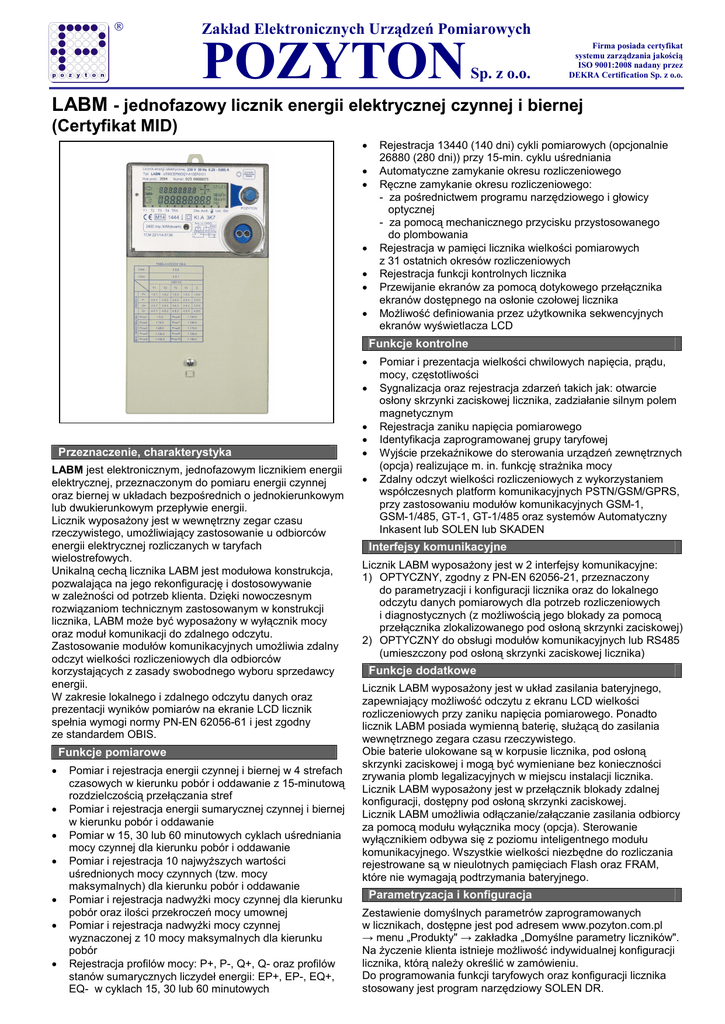 Zakład Elektronicznych Urządzeń Pomiarowych POZYTON Sp. z o.o. Firma posiada certyfikat systemu zarządzania jakością ISO 9001:2008 nadany przez DEKRA Certification Sp. z o.o. LABM - jednofazowy licznik energii elektrycznej czynnej i biernej (Certyfikat MID) • • • • • • • Rejestracja 13440 (140 dni) cykli pomiarowych (opcjonalnie 26880 (280 dni)) przy 15-min. cyklu uśredniania Automatyczne zamykanie okresu rozliczeniowego Ręczne zamykanie okresu rozliczeniowego: - za pośrednictwem programu narzędziowego i głowicy optycznej - za pomocą mechanicznego przycisku przystosowanego do plombowania Rejestracja w pamięci licznika wielkości pomiarowych z 31 ostatnich okresów rozliczeniowych Rejestracja funkcji kontrolnych licznika Przewijanie ekranów za pomocą dotykowego przełącznika ekranów dostępnego na osłonie czołowej licznika MoŜliwość definiowania przez uŜytkownika sekwencyjnych ekranów wyświetlacza LCD Funkcje kontrolne • • Przeznaczenie, charakterystyka LABM jest elektronicznym, jednofazowym licznikiem energii elektrycznej, przeznaczonym do pomiaru energii czynnej oraz biernej w układach bezpośrednich o jednokierunkowym lub dwukierunkowym przepływie energii. Licznik wyposaŜony jest w wewnętrzny zegar czasu rzeczywistego, umoŜliwiający zastosowanie u odbiorców energii elektrycznej rozliczanych w taryfach wielostrefowych. Unikalną cechą licznika LABM jest modułowa konstrukcja, pozwalająca na jego rekonfigurację i dostosowywanie w zaleŜności od potrzeb klienta. Dzięki nowoczesnym rozwiązaniom technicznym zastosowanym w konstrukcji licznika, LABM moŜe być wyposaŜony w wyłącznik mocy oraz moduł komunikacji do zdalnego odczytu. Zastosowanie modułów komunikacyjnych umoŜliwia zdalny odczyt wielkości rozliczeniowych dla odbiorców korzystających z zasady swobodnego wyboru sprzedawcy energii. W zakresie lokalnego i zdalnego odczytu danych oraz prezentacji wyników pomiarów na ekranie LCD licznik spełnia wymogi normy PN-EN 62056-61 i jest zgodny ze standardem OBIS. Funkcje pomiarowe • • • • • • • Pomiar i rejestracja energii czynnej i biernej w 4 strefach czasowych w kierunku pobór i oddawanie z 15-minutową rozdzielczością przełączania stref Pomiar i rejestracja energii sumarycznej czynnej i biernej w kierunku pobór i oddawanie Pomiar w 15, 30 lub 60 minutowych cyklach uśredniania mocy czynnej dla kierunku pobór i oddawanie Pomiar i rejestracja 10 najwyŜszych wartości uśrednionych mocy czynnych (tzw. mocy maksymalnych) dla kierunku pobór i oddawanie Pomiar i rejestracja nadwyŜki mocy czynnej dla kierunku pobór oraz ilości przekroczeń mocy umownej Pomiar i rejestracja nadwyŜki mocy czynnej wyznaczonej z 10 mocy maksymalnych dla kierunku pobór Rejestracja profilów mocy: P+, P-, Q+, Q- oraz profilów stanów sumarycznych liczydeł energii: EP+, EP-, EQ+, EQ- w cyklach 15, 30 lub 60 minutowych • • • • Pomiar i prezentacja wielkości chwilowych napięcia, prądu, mocy, częstotliwości Sygnalizacja oraz rejestracja zdarzeń takich jak: otwarcie osłony skrzynki zaciskowej licznika, zadziałanie silnym polem magnetycznym Rejestracja zaniku napięcia pomiarowego Identyfikacja zaprogramowanej grupy taryfowej Wyjście przekaźnikowe do sterowania urządzeń zewnętrznych (opcja) realizujące m. in. funkcję straŜnika mocy Zdalny odczyt wielkości rozliczeniowych z wykorzystaniem współczesnych platform komunikacyjnych PSTN/GSM/GPRS, przy zastosowaniu modułów komunikacyjnych GSM-1, GSM-1/485, GT-1, GT-1/485 oraz systemów Automatyczny Inkasent lub SOLEN lub SKADEN Interfejsy komunikacyjne Licznik LABM wyposaŜony jest w 2 interfejsy komunikacyjne: 1) OPTYCZNY, zgodny z PN-EN 62056-21, przeznaczony do parametryzacji i konfiguracji licznika oraz do lokalnego odczytu danych pomiarowych dla potrzeb rozliczeniowych i diagnostycznych (z moŜliwością jego blokady za pomocą przełącznika zlokalizowanego pod osłoną skrzynki zaciskowej) 2) OPTYCZNY do obsługi modułów komunikacyjnych lub RS485 (umieszczony pod osłoną skrzynki zaciskowej licznika) Funkcje dodatkowe Licznik LABM wyposaŜony jest w układ zasilania bateryjnego, zapewniający moŜliwość odczytu z ekranu LCD wielkości rozliczeniowych przy zaniku napięcia pomiarowego. Ponadto licznik LABM posiada wymienną baterię, słuŜącą do zasilania wewnętrznego zegara czasu rzeczywistego. Obie baterie ulokowane są w korpusie licznika, pod osłoną skrzynki zaciskowej i mogą być wymieniane bez konieczności zrywania plomb legalizacyjnych w miejscu instalacji licznika. Licznik LABM wyposaŜony jest w przełącznik blokady zdalnej konfiguracji, dostępny pod osłoną skrzynki zaciskowej. Licznik LABM umoŜliwia odłączanie/załączanie zasilania odbiorcy za pomocą modułu wyłącznika mocy (opcja). Sterowanie wyłącznikiem odbywa się z poziomu inteligentnego modułu komunikacyjnego. Wszystkie wielkości niezbędne do rozliczania rejestrowane są w nieulotnych pamięciach Flash oraz FRAM, które nie wymagają podtrzymania bateryjnego. Parametryzacja i konfiguracja Zestawienie domyślnych parametrów zaprogramowanych w licznikach, dostępne jest pod adresem www.pozyton.com.pl → menu „Produkty" → zakładka „Domyślne parametry liczników". Na Ŝyczenie klienta istnieje moŜliwość indywidualnej konfiguracji licznika, którą naleŜy określić w zamówieniu. Do programowania funkcji taryfowych oraz konfiguracji licznika stosowany jest program narzędziowy SOLEN DR. Licznik posiada Certyfikat Badania Typu WE nr TCM 221/14 - 5136 i podlega ocenie zgodności wg dyrektywy UE MID. ZEUP POZYTON zastrzega sobie prawo dokonywania zmian parametrów technicznych i funkcjonalnych licznika, wynikających z postępu technicznego. Podstawowe dane techniczne Typ licznika Klasa dokładności energii czynnej wg norm energii biernej Napięcie odniesienia Un Prąd odniesienia Iref Prąd maksymalny Imax Prąd rozruchu Ist / Prąd minimalny Imin