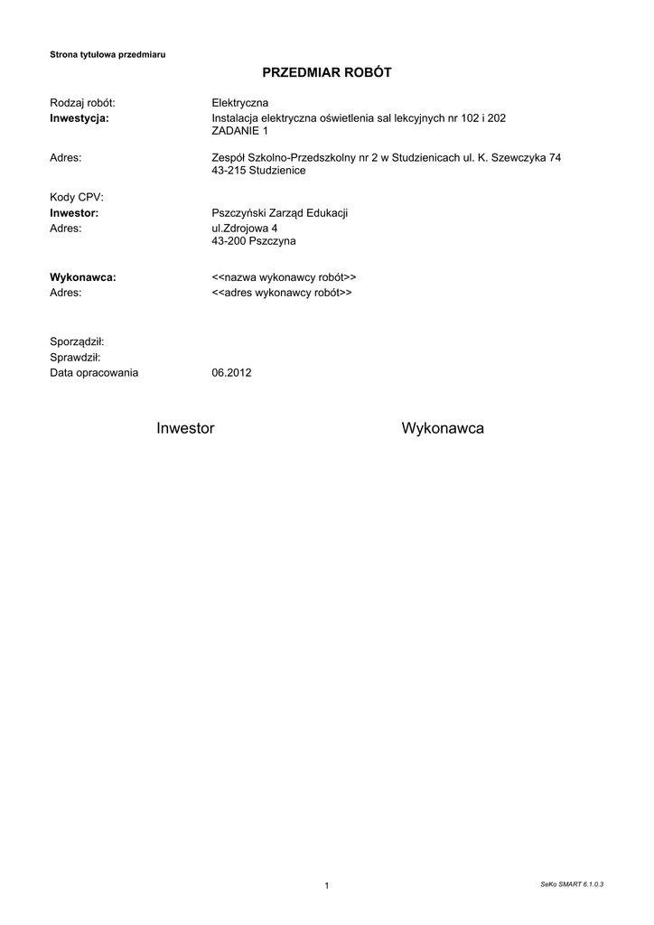 Strona tytułowa przedmiaru PRZEDMIAR ROBÓT Rodzaj robót: Inwestycja: Elektryczna Instalacja elektryczna oświetlenia sal lekcyjnych nr 102 i 202 ZADANIE 1 Adres: Zespół Szkolno-Przedszkolny nr 2 w Studzienicach ul. K. Szewczyka 74 43-215 Studzienice Kody CPV: Inwestor: Adres: Pszczyński Zarząd Edukacji ul.Zdrojowa 4 43-200 Pszczyna Wykonawca: Adres: <<nazwa wykonawcy robót>> <<adres wykonawcy robót>> Sporządził: Sprawdził: Data opracowania 06.2012 Inwestor Wykonawca 1 SeKo SMART 6.1.0.3 Przedmiar Lp 1 Kod 2 1 45310000-3 CPV 1.1 KNR-W 4-03 1134-02 Opis Jm 3 4 Ilości Ilość robót składowe 5 6 Demontaże Demontaż belek montażowych dla opraw świetlówkowych szt. 24 Demontaż przewodów wtynkowych z podłoża ceglanego lub betonowego szt. m 24,000 21 Demontaż łączników instalacyjnych podtynkowych o natężeniu prądu do 10 A - 1 wylot (wyłącznik lub przełącznik 2 biegunowy lub grupowy) 2 1.4 KNR 4-03 1122-02 Demontaż gniazd wtyczkowych podtynkowych o natężeniu prądu do 63 A - ilość biegunów 2 + 0 6 2 45311200-2 Oprawy oświetleniowe CPV m szt. 21,000 szt. szt. 2,000 szt. 6,000 2.1 KNR 5-08 0501-04 Przygotowanie podłoża pod oprawy oświetleniowe zawieszane na kołkach plastikowych lub kotwiących na podłożu betonowym (il. mocowań 2) 24 2.2 KNR 5-08 0514-09 Montaż z podłączeniem na gotowym podłożu opraw świetlówkowych zwykłychzwieszanych typ oprawy świetlówkowej z rastrem 2x36 TCS098/236 C3 + 2xTL-D36W 22 2.3 KNR 5-08 0513-09 Montaż z podłączeniem na gotowym podłożu belek montażowych w układzie symetrycznym i asymetrycznym dla opraw zawieszanych typ oprawy świetlówkowej z rastrem 1x36 TCS098/136 A + 1xTL-D36W 2 2.4 KNR-W 5-08 Pomiar rezystancji izolacji instalacji elektrycznych - obwód 3-fazowy, pierwszy 0901-03 pomiar 1 kpl. 1.2 KNR-W 4-03 1116-03 1.3 KNR-W 4-03 1124-02 2.5 KNR-W 4-03 1001-01 2.6 KNR-W 4-03 1012-02 2.7 KNR-W 4-03 1014-01 3 45311000-0 CPV Mechaniczne wykucie bruzd dla przewodow wtynkowych w cegle 24,000 21,000 2,000 6,000 24,000 kpl. szt. 24,000 szt. szt. 22,000 szt. pomi ar pomi ar m 2,000 22,000 2,000 1,000 1,000 120,000 120 Zaprawianie bruzd o szerokości do 50 mm m m 120,000 120 Ręczne przygotowanie zaprawy - podłoże cementowo-wapienne m m3 120,000 0.20 Roboty w zakresie przewodów instalacji elektrycznej m3 0,200 3.1 KNR 5-08 0210-01 Przewody kabelkowe o łącznym przekroju żył YDY4x1,5mm2-750V układane w gotowych bruzdach bez zaprawiania bruzd na podłożu nie-betonowym 150 3.2 KNR 5-08 0210-02 Przewody kabelkowe o łącznym przekroju żył YDY3x2,5mm2-750V układane w gotowych bruzdach bez zaprawiania bruzd na podłożu nie-betonowym 120 3.3 KNR 5-08 0210-02 Przewody kabelkowe o łącznym przekroju żył YDY3x1,5mm2-750V układane w gotowych bruzdach bez zaprawiania bruzd na podłożu nie-betonowym 45 3.4 KNR 5-08 0226-03 Montaż listew ściennych DLP o wym. 32x25mm2 na ścianach i sufitach ceglanych za pomocą kołków rozporowych 14 4 45311100-1 Osprzęt instalacyjny CPV 4.1 KNR 5-08 0301-02 Przygotowanie podłoża pod mocowanie osprzętu przez przykręcenie do kołków plastikowych w podłożu z cegły 14 4.2 KNR 5-08 0302-01 Montaż na gotowym podłożu puszek bakelitowych o śr. do 60mm 12 4.3 KNR 5-08 0303-06 Montaż na gotowym podłożu puszek 75x75 i 85x105 z tworzywa sztucznego o ilości wylotów 4 i przekroju przewodów do 4 mm2 - mocowanych bezśrubowo 2 4.4 KNR 5-08 0309-03 Montaż do gotowego podłoża gniazd wtyczkowych podtynkowych 2-biegunowych z uziemieniem w puszkach z podłączeniem 2 120,000 0,200 m 150,000 m m 150,000 m m 120,000 m m 45,000 m 14,000 120,000 45,000 14,000 szt. 14,000 szt. szt. szt. szt. 14,000 szt. szt. 2,000 12,000 12,000 2,000 6,000 SeKo SMART 6.1.0.3 Lp Kod Opis 1 2 3 6 4.5 KNR 5-08 0307-03 Montaż na gotowym podłożu łączników instalacyjnych podtynkowych świecznikowych w puszce instalacyjnej z podłączeniem 6 4.6 KNR 5-08 0307-02 Montaż na gotowym podłożu łączników instalacyjnych podtynkowych jednobiegunowych, przycisków w puszce instalacyjnej z podłączeniem 2 5 45310000-3 Badania i Pomiary CPV 5.1 KNR-W 5-08 0901-01 5.2 KNR-W 5-08 0901-03 5.3 KNR-W 5-08 0902-05 5.4 KNR-W 5-08 0902-01 5.5 KNR-W 5-08 0902-02 5.6 Pomiar rezystancji izolacji instalacji elektrycznych - obwód 1-fazowy, pierwszy pomiar 6 Pomiar rezystancji izolacji instalacji elektrycznych - obwód 3-fazowy, pierwszy pomiar 1 Sprawdzenie samoczynnego wyłączenia zasilania - próby działania wyłącznika różnicowoprądowego - pierwszy 1 Sprawdzenie samoczynnego wyłączenia zasilania - pomiar impedancji pętli zwarciowej - pierwszy 1 Sprawdzenie samoczynnego wyłączenia zasilania - pomiar impedancji pętli zwarciowej - każdy następny 4 Pomiary natężenia oświetlenia w salach lekcyjnych 2 6 45310000-3 CPV 6.3 KNR 4-03 1003-22 Mechaniczne przebijanie otworów w ścianach lub stropach z cegły o długości przebicia do 2 1/2 ceg. - śr. rury do 40 mm 4 6.4 KNR 4-03 1008-02 Montaż przepustów rurowych w ścianie - długość przepustu do 1 m śr.zewnętrzna rury do 40 mm 4 7 40 7.2 KNR-W 5-08 0407-01 7.3 KNR-W 5-08 0407-04 4 Ilości Ilość robót składowe 5 6 szt. szt. 6,000 szt. szt. 6,000 szt. 2,000 pomi ar pomi ar pomi ar pomi ar pomi ar pomi ar pomi ar pomi ar pomi ar pomi ar pomi ar pomi ar 6,000 2,000 6,000 6,000 1,000 1,000 1,000 1,000 1,000 1,000 4,000 4,000 2,000 2,000 Wykonanie przebić i przepustów 6.1 KNR 4-03 1003-06 Mechaniczne przebijanie otworów w ścianach lub stropach z cegły o długości przebicia do 1 ceg. - śr. rury do 25 mm 2 6.2 KNR 4-03 1008-01 Montaż przepustów rurowych w ścianie - długość przepustu do 1 m śr.zewnętrzna rury do 25 mm 2 7.1 KNR-W 5-08 0407-01 Jm otw. 2,000 otw. prze pust. prze pust. otw. 2,000 otw. prze pust. prze pust. 4,000 2,000 2,000 4,000 4,000 4,000 Tablica TPOS Montaż osprzętu modułowego w rozdzielnicach - wyłącznik nadprądowy 1-bieg. S301 B16 2 Montaż osprzętu modułowego w rozdzielnicach - wyłącznik nadprądowy 1