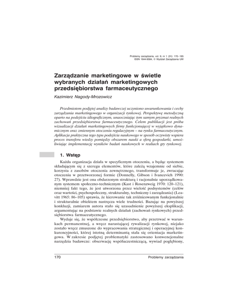Problemy zarzÈdzania, vol. 9, nr 1 (31): 170 – 185 ISSN 1644-9584, © Wydziaï ZarzÈdzania UW ZarzÈdzanie marketingowe w Ăwietle wybranych dziaïañ marketingowych przedsiÚbiorstwa farmaceutycznego Kazimierz Nagody-Mrozowicz Przedmiotem podjÚtej analizy badawczej uczyniono uwarunkowania i cechy zarzÈdzania marketingowego w organizacji rynkowej. PerspektywÚ metodycznÈ oparto na podejĂciu idiograficznym, unaoczniajÈc tym samym pryzmat realnych zachowañ przedsiÚbiorstwa farmaceutycznego. Celem publikacji jest próba wizualizacji dziaïañ marketingowych firmy funkcjonujÈcej w wyjÈtkowo dynamicznym oraz zmiennym otoczeniu regulacyjnym – na rynku farmaceutycznym. Aplikacja praktyczna tego typu podejĂcia naukowego w sposób oczywisty wspiera proces transferu wiedzy pomiÚdzy obszarem nauki a sferÈ gospodarki, umoĝliwiajÈc implementacjÚ wyników badañ naukowych w realiach gry rynkowej. 1. WstÚp Kaĝda organizacja dziaïa w specyficznym otoczeniu, a bÚdÈc systemem skïadajÈcym siÚ z szeregu elementów, które zaleĝÈ wzajemnie od siebie, korzysta z zasobów otoczenia zewnÚtrznego, transformuje je, zwracajÈc otoczeniu w przetworzonej formie (Donnelly, Gibson i Ivancevich 1990: 27). Wprawdzie jest ona obdarzonym strukturÈ i racjonalnie uporzÈdkowanym systemem spoïeczno-technicznym (Kast i Rosenzweig 1970: 120–121), niemniej fakt tego, ĝe jest utworzona przez wieloĂÊ podsystemów (celów oraz wartoĂci, psychospoïeczny, strukturalny, techniczny i zarzÈdzania) (Leavitt 1965: 86–105) sprawia, ĝe kierowanie tak zróĝnicowanym funkcjonalnie i strukturalnie obiektem nastrÚcza wiele trudnoĂci. BazujÈc na powyĝszej konkluzji, zamiarem autora staïo siÚ uzasadnienie powyĝszej eksplikacji, argumentujÈc na podstawie realnych dziaïañ (zachowañ rynkowych) przedsiÚbiorstwa farmaceutycznego. Wydaje siÚ, ĝe wspóïczesne przedsiÚbiorstwo, aby przetrwaÊ w warunkach permanentnej, a wrÚcz narastajÈcej rywalizacji rynkowej, niejako zostaïo wrÚcz zmuszone do wypracowania strategicznej i operacyjnej konkurencyjnoĂci, której istotnÈ determinantÈ staïa siÚ orientacja marketingowa. W zakresie podjÚtej problematyki zastosowano konwencjonalne narzÚdzia badawcze: obserwacjÚ wspóïuczestniczÈcÈ, wywiad pogïÚbiony, 170 Problemy zarzÈdzania ZarzÈdzanie marketingowe w Ăwietle wybranych dziaïañ... a takĝe kwerendÚ materiaïów ěródïowych. Przedmiotem analizy badawczej uczyniono wybrane dziaïania marketingowe polskiego przedsiÚbiorstwa farmaceutycznego1. 2. Badane przedsiÚbiorstwo Firma Biofarm jest spóïkÈ z ograniczonÈ odpowiedzialnoĂciÈ2 zaïoĝonÈ w 1988 r. przez farmaceutów. ZarzÈd firmy stanowiÈ menedĝerowie posiadajÈcy dorobek naukowy oraz wieloletnie doĂwiadczenie w prowadzeniu dziaïalnoĂci gospodarczej. W 2004 r. w firmie zostaïa przeprowadzona inspekcja przez Gïówny Inspektorat Farmaceutyczny Departamentu Inspekcji ds. Wytwarzania. Na podstawie przeprowadzonej wizytacji spóïka otrzymaïa Certyfikat Nr 19/2004 potwierdzajÈcy, ĝe produkcja i kontrola jakoĂci w firmie speïnia wymagania GMP rekomendowane przez ¥wiatowÈ OrganizacjÚ Zdrowia i zapisane w Dyrektywie 91/356/EEC. ZarzÈd firmy skïada siÚ z dwóch osób: prezesa zarzÈdu i czïonka zarzÈdu. LiniÚ ĂredniÈ tworzy 30 kierowników kontrolujÈcych pracÚ przedstawicieli farmaceutycznych oraz medycznych. Biofarm zatrudnia 180 przedstawicieli medycznych oraz 50 przedstawicieli farmaceutycznych w caïej Polsce odpowiedzialnych za róĝne grupy leków. Za promocjÚ leków wydawanych na receptÚ odpowiedzialne sÈ zespoïy kardiologiczne, internistyczne, a takĝe psychiatryczno-neurologiczne. Przedstawiciele medyczni firmy odpowiadajÈ za bezpoĂredniÈ sprzedaĝ leków do aptek na podlegïym im terenie dziaïania, natomiast przedstawiciele farmaceutyczni odpowiedzialni sÈ za sprzedaĝ leków wydawanych bez recepty do aptek. W dziaïach: produkcji, transportu, rozwoju i ksiÚgowoĂci zatrudnionych jest okoïo 100 osób. Ècznie firma zatrudnia w Polsce okoïo 360 pracowników w przedziale wieku 24–50 lat. W zarzÈdzaniu zasobami ludzkimi firma wyznaje orientacjÚ zasobowÈ, stosujÈc system szkoleñ pracowniczych i nowoczesne metody premiowania pracy. W dalszej czÚĂci publikacji zaprezentowane zostanÈ pewne charakterystyczne dziaïania marketingowe przedsiÚbiorstw farmaceutycznych z uwzglÚdnieniem poczynañ analizowanej firmy. 3. Teleologia marketingu Zrozumienie istoty marketingu i jego pragmatycznego znaczenia w uzyskiwaniu przewagi konkurencyjnej wymaga ukazania ewolucji, jakÈ przechodziïa koncepcja marketingowa od samego poczÈtku aĝ do ostatniej dekady bieĝÈcego stulecia (Kotler 1994). W okresie tym marketing staï siÚ uniwersalnÈ koncepcjÈ prowadzenia dziaïalnoĂci gospodarczej w kaĝdej vol. 9, nr 1 (31), 2011 171 Kazimierz Nagody-Mrozowicz dziedzinie i w kaĝdej formie wïasnoĂci, niezaleĝnie od wielkoĂci i domeny przedsiÚbiorstwa (Altkorn 2003). AnalizujÈc drogÚ dochodzenia do wspóïczesnej koncepcji marketingu, naleĝy wyodrÚbniÊ cztery podstawowe orientacje przedsiÚbiorstw (Meffert 1986: 445): orientacjÚ produkcyjnÈ, sprzedaĝowÈ, marketingowÈ, marketing strategiczny oraz orientacjÚ spoïecznÈ. Orientacja marketingowa wiÈĝe siÚ z wchodzeniem pañstw wysoko rozwiniÚtych w fazÚ cywilizacji okreĂlonÈ mianem ,,spoïeczeñstwa obfitoĂci” (Altkorn 1993: 19), czego wyrazem jest aktualnie zjawisko ,,nadkonsumpcji”. Coraz wiÚcej rynków przeksztaïca siÚ w rynki ponadnarodowe i globalne. Zjawiska te zdeterminowane sÈ poprzez staïy postÚp techniczny oraz rozwój nauki, stymulujÈce skracanie cyklu ĝycia produktów na rynku, zwiÚkszanie kapitaïochïonnoĂci prac badawczych i inwestycji zwiÈzanych z uruchomieniem produkcji i wprowadzaniem na rynek nowych produktów. Pojawia siÚ tym samym koniecznoĂÊ prognozowania juĝ na wczesnym etapie produkcji moĝliwoĂci póěniejszego ulokowania (pozycjonowa