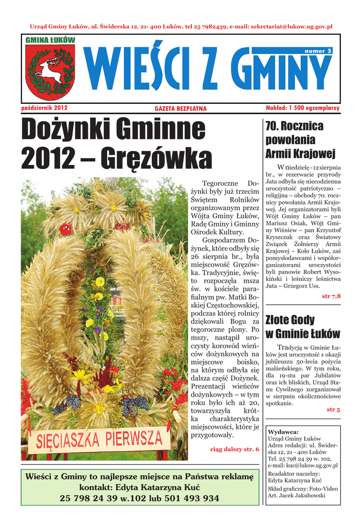 Urząd Gminy Łuków, ul. Świderska 12, 21- 400 Łuków, tel 25 7982439, e-mail: [email protected] wieści z gminy numer 3 październik 2012 GAZETA BEZPŁATNA Dożynki Gminne 2012 – Gręzówka Tegoroczne Dożynki były już trzecim Świętem Rolników organizowanym przez Wójta Gminy Łuków, Radę Gminy i Gminny Ośrodek Kultury. Gospodarzem Dożynek, które odbyły się 26 sierpnia br., była miejscowość Gręzówka. Tradycyjnie, święto rozpoczęła msza św. w kościele parafialnym pw. Matki Boskiej Częstochowskiej, podczas której rolnicy dziękowali Bogu za tegoroczne plony. Po mszy, nastąpił uroczysty korowód wieńców dożynkowych na miejscowe boisko, na którym odbyła się dalsza część Dożynek. Prezentacji wieńców dożynkowych – w tym roku było ich aż 20, towarzyszyła krótka charakterystyka miejscowości, które je przygotowały. ciąg dalszy str. 6 Wieści z Gminy to najlepsze miejsce na Pañstwa reklamę kontakt: Edyta Katarzyna Kuć 25 798 24 39 w.102 lub 501 493 934 Nakład: 1 500 egzemplarzy 70. Rocznica powołania Armii Krajowej W niedzielę - 12 sierpnia br., w rezerwacie przyrody Jata odbyła się niecodzienna uroczystość patriotyczno – religijna – obchody 70. rocznicy powołania Armii Krajowej. Jej organizatorami byli Wójt Gminy Łuków – pan Mariusz Osiak, Wójt Gminy Wiśniew – pan Krzysztof Kryszczuk oraz Światowy Związek Żołnierzy Armii Krajowej – Koło Łuków, zaś pomysłodawcami i współorganizatorami uroczystości byli panowie Robert Wysokiński i leśniczy leśnictwa Jata – Grzegorz Uss. str 7,8 Złote Gody w Gminie Łuków Tradycją w Gminie Łuków jest uroczystość z okazji jubileuszu 50-lecia pożycia małżeńskiego. W tym roku, dla 19-stu par Jubilatów oraz ich bliskich, Urząd Stanu Cywilnego zorganizował w sierpniu okolicznościowe spotkanie. str 5 Wydawca: Urząd Gminy Łuków Adres redakcji: ul. Świderska 12, 21 - 400 Łuków Tel. 25 798 24 39 w. 102, e-mail: [email protected] Readaktor naczelny: Edyta Katarzyna Kuć Skład graficzny: Foto-Video Art. Jacek Jakubowski Urząd Gminy Łuków, ul. Świderska 12, 21- 400 Łuków, tel 25 7982439, e-mail: [email protected] Rada Gminy Łuków Z prac Rady Gminy Łuków Ważnym zakresem prac Rady Gminy Łuków w okresie wakacji było sprawdzenie stanu technicznego oraz funkcjonowania świetlic wiejskich. Rada Gminy dokonała wizytacji świetlic znajdujących się na terenie Gminy Łuków oraz świetlic będących obecnie w budowie tj. świetlic w Gołąbkach i Krynce. Łącznie wizytowała 31 obiektów. Świetlice wiejskie, jako swego rodzaju centra kultury, są miejscami spotkań i integracji mieszkańców, miejscami organizacji czasu wolnego i rozwijania zainteresowań dzieci i młodzieży. Z tego względu ważne jest wykazywanie troski i dbałości zarówno o ich stan techniczny, odpowiednie wyposaże- Świetlica wiejska w Sięciaszce Drugiej, fot. A. Pulik nie oraz sposób ich wykorzystywania. W ocenie Rady Gminy, stan techniczny świetlic oraz ich wygląd są bardzo dobre. Rada Gminy uznała również za prawidłowe i gospodarne dysponowanie funduszem sołeckim. W tym zakresie, zwróciła uwagę na zasadność przeznaczenia go w wielu przypadkach na drobne pra- ce remontowe świetlic i ich wyposażenie. Rada Gminy wyraziła także zadowolenie z faktu, że mieszkańcy Gminy w coraz większym stopniu są zainteresowani życiem społecznym i kulturalnym swoich miejscowości i wykazują dbałość o istniejące obiekty, które tym celom służą. Świetlica wiejska w Jadwisinie, fot. A. Pulik Lokalna Grupa Działania „RAZEM KU LEPSZEJ PRZYSZŁOŚCI” z siedzibą w Łukowie, informuje o trwającym konkursie fotograficznym pt. „NIEZWYKLI LUDZIE I CIEKAWE MIEJSCA OBSZARU LGD” Przewidywane zakończenie konkursu nastąpi 30 listopada 2012 roku. Celem konkursu jest promocja obszaru LGD, obejmującego 12 gmin: Adamów, Kłoczew, Krzywda, Łuków, Nowodwór, Serokomla, Stanin, Stoczek Łukowski, Miasto Stoczek Łukowski, Trzebieszów, Wojcieszków, Wola Mysłowska. Konkurs podzielony jest na trzy kategorie tematyczne: a) architektura budownictwa wiejskiego na obszarze LGD, b) mieszkańcy obszaru LGD, c) pejzaż i krajobraz obszaru LGD. Do udziału w konkursie zapraszamy wszystkich chętnych. Szczegóły (regulamin, karta zgłoszenia, zgoda na wykorzystanie wizerunku, opis prac) na stronie internetowej www.lgdrazem.pl w zakładce Konkurs fotograficzny lub w biurze LGD przy ulicy Świderskiej 12 w Łukowie (tel. 25 798 24 39, wew. 160, email: [email protected]). Lokalna Grupa Działania „RAZEM KU LEPSZEJ PRZYSZŁOŚCI” ul. Świderska 12, 21-400 Łuków tel. 25 798 24 39, wew. 160 [email protected] www.lgdrazem.pl Urząd Gminy Łuków, ul. Świderska 12, 21- 400 Łuków, tel 25 7982439, e-mail: [email protected] Spotkanie po latach Spotkanie absolwentów po latach W niedzielę 8 lipca 2012 r. odbyła się uroczystość związana z 50 rocznicą ukończenia siedmiu klas Szkoły Podstawowej w Rolach w czerwcu 1962 roku. Zorganizował ją absolwent tego rocznika - ks. kan. Eugeniusz Rola, proboszcz parafii w Górznie w powiecie garwolińskim. Na spotkanie po latach zaprosił żyjących absolwentów - kolegów i koleżanki z klasy oraz nauczycieli i wychowawców klas. We wspomnianym 1962 r. Szkołę Podstawową w Rolach ukończyło 12 osób. Spotkanie rozpoczęła msza św. celebrowana przez inicjatora uroczystości – ks. Eugeniusza Rolę w intencji absolwentów oraz dwóch zmarłych nauczycielek – Anny Szczęśniak i Jadwigi Szczygielskiej. Dalsza część uroczystości odbyła się w szkole w Rolach, dzięki czemu wspomnienia szkolnych lat odżyły ze zdwojona siłą. Na wstępie każdy z uczest- W pierwszym rzędzie stoją od prawej: Henryk Szczęśniak – były kierownik i nauczyciel szkoły w Rolach, Elżbieta Wereszczyńska z d. Celińska, Wiesława Radomyska z d. Zakrzewska, Krystyna Domańska z d. Ławecka. W drugim rzędzie stoją od prawej: Ks. Kanonik Eu