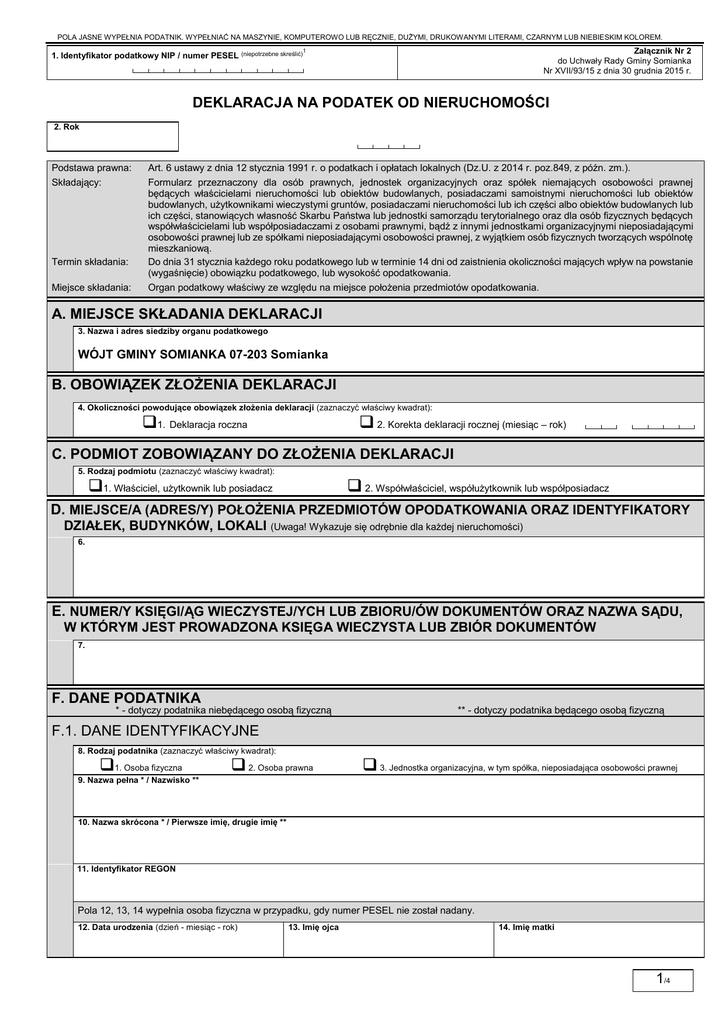 POLA JASNE WYPEŁNIA PODATNIK. WYPEŁNIAĆ NA MASZYNIE, KOMPUTEROWO LUB RĘCZNIE, DUŻYMI, DRUKOWANYMI LITERAMI, CZARNYM LUB NIEBIESKIM KOLOREM. 1. Identyfikator podatkowy NIP / numer PESEL (niepotrzebne skreślić) Załącznik Nr 2 do Uchwały Rady Gminy Somianka Nr XVII/93/15 z dnia 30 grudnia 2015 r. 1 DEKLARACJA NA PODATEK OD NIERUCHOMOŚCI 2. Rok Podstawa prawna: Art. 6 ustawy z dnia 12 stycznia 1991 r. o podatkach i opłatach lokalnych (Dz.U. z 2014 r. poz.849, z późn. zm.). Składający: Formularz przeznaczony dla osób prawnych, jednostek organizacyjnych oraz spółek niemających osobowości prawnej będących właścicielami nieruchomości lub obiektów budowlanych, posiadaczami samoistnymi nieruchomości lub obiektów budowlanych, użytkownikami wieczystymi gruntów, posiadaczami nieruchomości lub ich części albo obiektów budowlanych lub ich części, stanowiących własność Skarbu Państwa lub jednostki samorządu terytorialnego oraz dla osób fizycznych będących współwłaścicielami lub współposiadaczami z osobami prawnymi, bądź z innymi jednostkami organizacyjnymi nieposiadającymi osobowości prawnej lub ze spółkami nieposiadającymi osobowości prawnej, z wyjątkiem osób fizycznych tworzących wspólnotę mieszkaniową. Do dnia 31 stycznia każdego roku podatkowego lub w terminie 14 dni od zaistnienia okoliczności mających wpływ na powstanie (wygaśnięcie) obowiązku podatkowego, lub wysokość opodatkowania. Termin składania: Miejsce składania: Organ podatkowy właściwy ze względu na miejsce położenia przedmiotów opodatkowania. A. MIEJSCE SKŁADANIA DEKLARACJI 3. Nazwa i adres siedziby organu podatkowego WÓJT GMINY SOMIANKA 07-203 Somianka B. OBOWIĄZEK ZŁOŻENIA DEKLARACJI 4. Okoliczności powodujące obowiązek złożenia deklaracji (zaznaczyć właściwy kwadrat): 1. Deklaracja roczna 2. Korekta deklaracji rocznej (miesiąc – rok) C. PODMIOT ZOBOWIĄZANY DO ZŁOŻENIA DEKLARACJI 5. Rodzaj podmiotu (zaznaczyć właściwy kwadrat): 1. Właściciel, użytkownik lub posiadacz 2. Współwłaściciel, współużytkownik lub współposiadacz D. MIEJSCE/A (ADRES/Y) POŁOŻENIA PRZEDMIOTÓW OPODATKOWANIA ORAZ IDENTYFIKATORY DZIAŁEK, BUDYNKÓW, LOKALI (Uwaga! Wykazuje się odrębnie dla każdej nieruchomości) 6. E. NUMER/Y KSIĘGI/ĄG WIECZYSTEJ/YCH LUB ZBIORU/ÓW DOKUMENTÓW ORAZ NAZWA SĄDU, W KTÓRYM JEST PROWADZONA KSIĘGA WIECZYSTA LUB ZBIÓR DOKUMENTÓW 7. F. DANE PODATNIKA * - dotyczy podatnika niebędącego osobą fizyczną ** - dotyczy podatnika będącego osobą fizyczną F.1. DANE IDENTYFIKACYJNE 8. Rodzaj podatnika (zaznaczyć właściwy kwadrat): 1. Osoba fizyczna 9. Nazwa pełna * / Nazwisko ** 2. Osoba prawna 3. Jednostka organizacyjna, w tym spółka, nieposiadająca osobowości prawnej 10. Nazwa skrócona * / Pierwsze imię, drugie imię ** 11. Identyfikator REGON Pola 12, 13, 14 wypełnia osoba fizyczna w przypadku, gdy numer PESEL nie został nadany. 12. Data urodzenia (dzień - miesiąc - rok) 13. Imię ojca 14. Imię matki 1/4 POLA JASNE WYPEŁNIA PODATNIK. WYPEŁNIAĆ NA MASZYNIE, KOMPUTEROWO LUB RĘCZNIE, DUŻYMI, DRUKOWANYMI LITERAMI, CZARNYM LUB NIEBIESKIM KOLOREM. F.2. ADRES SIEDZIBY * / ADRES ZAMIESZKANIA ** 16. Województwo 15. Kraj 18. Gmina 17. Powiat 19. Ulica 20. Nr domu 22. Miejscowość 23. Kod pocztowy 21. Nr lokalu 24. Poczta F.3. ADRES DO KORESPONDENCJI Należy wypełnić tylko wówczas, gdy adres do korespondencji jest inny niż w części F.2. 26. Województwo 25. Kraj 28. Gmina 27.Powiat 29. Ulica 30. Nr domu 32. Miejscowość 33. Kod pocztowy 31. Nr lokalu 34. Poczta F.4. KONTAKT 35. Telefon (pole nieobowiązkowe) 36. Faks (pole nieobowiązkowe) 37. E-mail (pole nieobowiązkowe) G. DANE DOTYCZĄCE PRZEDMIOTÓW OPODATKOWANIA NIEPODLEGAJĄCYCH ZWOLNIENIU G.1. POWIERZCHNIA GRUNTÓW Podstawa opodatkowania w m2 (ha) z dokładnością do 1 m2 1. Związanych z prowadzeniem działalności gospodarczej, bez względu na sposób zakwalifikowania w ewidencji gruntów i budynków 38. 2. Pod wodami powierzchniowymi stojącymi lub wodami powierzchniowymi płynącymi jezior i zbiorników sztucznych2 41. 3. Pozostałych, w tym zajętych na prowadzenie odpłatnej statutowej działalności pożytku publicznego przez organizacje pożytku publicznego 44. 4. Niezabudowanch objętych obszarem rewitalizacji, o którym mowa w ustawie z dnia 9 października 2015 r. o rewitalizacji (Dz. U. z 2015 r. poz. 1777), i położonych na terenach, dla których miejscowy plan zagospodarowania przestrzennego przewiduje przeznaczenie pod zabudowę mieszkaniową, usługową albo zabudowę o przeznaczeniu mieszanym obejmującym wyłącznie te rodzaje zabudowy, jeżeli od dnia wejścia w życie tego planu w odniesieniu do tych gruntów upłynął okres 4 lat, a w tym czasie nie zakończono budowy zgodnie z przepisami prawa budowlanego 47. Stawka podatku Kwota podatku zł, gr 39. m2 , gr zł, gr , 42. , zł, 40. 43. , ha , 45. 46. , m2 , 48. 49. , m2 , G.2. POWIERZCHNIA UŻYTKOWA BUDYNKÓW LUB ICH CZĘŚCI Stawka podatku Podstawa opodatkowania w m2 1. Budynków mieszkalnych - ogółem 50. zł, 51. m2 w tym kondygnacji o wysokości: - od 1,40 do 2,20 m (zaliczyć 50% powierzchni) gr 52. , , 53. m2 54. - powyżej 2,20 m 2. Związanych z prowadzeniem działalności gospodarczej oraz od budynków mieszkalnych lub ich części zajętych na prowadzenie działalności gospodarczej - ogółem w tym kondygnacji o wysokości: Kwota podatku - od 1,40 do 2,20 m (zaliczyć 50% powierzchni) m2 55. 56. m2 57. , , 58. m2 59. - powyżej 2,20 m m2 2/4 POLA JASNE WYPEŁNIA PODATNIK. WYPEŁNIAĆ NA MASZYNIE, KOMPUTEROWO LUB RĘCZNIE, DUŻYMI, DRUKOWANYMI LITERAMI, CZARNYM LUB NIEBIESKIM KOLOREM. 3. Zajętych na prowadzenie działalności gospodarczej w zakresie obrotu kwalifikowanym materiałem siewnym - ogółem w tym kondygnacji o wysokości: - od 1,40 do 2,20 m (zaliczyć 50% powierzchni) 61. 62. , m2 , 63. m2 64. - powyżej 2,20 m 4. Związanych z udzielaniem 