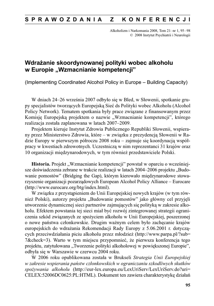 Wdra¿anie skoordynowanej polityki wobec alkoholu w Europie Wzmacnianie kompetencji S P R A W O Z D A N I A Z K O N F E R E N C J I Alkoholizm i Narkomania 2008, Tom 21: nr 1, 9598 © 2008 Instytut Psychiatrii i Neurologii Wdra¿anie skoordynowanej polityki wobec alkoholu w Europie Wzmacnianie kompetencji (Implementing Coordinated Alcohol Policy in Europe Building Capacity) W dniach 2426 wrzenia 2007 odby³o siê w Bled, w S³owenii, spotkanie grupy specjalistów tworz¹cych Europejsk¹ Sieæ ds Polityki wobec Alkoholu (Alcohol Policy Network). Tematem spotkania by³y prace zwi¹zane z finansowanym przez Komisjê Europejsk¹ projektem o nazwie Wzmacnianie kompetencji, którego realizacja zosta³a zaplanowana w latach 20072009. Projektem kieruje Instytut Zdrowia Publicznego Republiki S³owenii, wspierany przez Ministerstwo Zdrowia, które w zwi¹zku z prezydencj¹ S³owenii w Radzie Europy w pierwszym pó³roczu 2008 roku zajmuje siê koordynacj¹ wspó³pracy w kwestiach zdrowotnych. Uczestnicz¹ w nim reprezentanci 31 krajów oraz 10 organizacji miêdzynarodowych, w tym równie¿ przedstawiciele Polski. Historia. Projekt Wzmacnianie kompetencji powsta³ w oparciu o wczeniejsze dowiadczenia zebrane w trakcie realizacji w latach 20042006 projektu Budowanie pomostów (Bridging the Gap), którym kierowa³o miêdzynarodowe stowarzyszenie organizacji pozarz¹dowych European Alcohol Policy Alliance Eurocare (http://www.eurocare.org/btg/index.html). W zwi¹zku z przyst¹pieniem do Unii Europejskiej nowych krajów (w tym równie¿ Polski), autorzy projektu Budowanie pomostów jako g³ówny cel przyjêli utworzenie dynamicznej sieci partnerów zajmuj¹cych siê polityk¹ w zakresie alkoholu. Efektem powstania tej sieci mia³ byæ rozwój zintegrowanej strategii ograniczenia szkód zwi¹zanych ze spo¿yciem alkoholu w Unii Europejskiej, poszerzonej o nowe pañstwa cz³onkowskie. Drugim wa¿nym celem by³o zachêcanie krajów europejskich do wdra¿ania Rekomendacji Rady Europy z 5.06.2001 r. dotycz¹cych przeciwdzia³ania piciu alkoholu przez m³odzie¿ (http://www.parpa.pl/?sub= 7&check=3). Warto w tym miejscu przypomnieæ, ¿e pierwsza konferencja tego projektu, zatytu³owana Tworzenie polityki alkoholowej w powiêkszonej Europie, odby³a siê w Warszawie w czerwcu 2004 roku. W 2006 roku opublikowana zosta³a w Brukseli Strategia Unii Europejskiej w zakresie wspierania pañstw cz³onkowskich w ograniczaniu szkodliwych skutków spo¿ywania alkoholu (http://eur-lex.europa.eu/LexUriServ/LexUriServ.do?uri= CELEX:52006DC0625:PL:HTML). Dokument ten zawiera charakterystykê dzia³añ 95 Agnieszka Pisarska s³u¿¹cych zapobieganiu szkodliwemu i niebezpiecznemu spo¿ywaniu alkoholu, podjêtych ju¿ przez Komisjê Europejsk¹ i pañstwa cz³onkowskie oraz wskazuje dziedziny dalszego rozwoju w tym zakresie. Okrelono w nim 5 tematów priorytetowych, takich jak: ● ochrona m³odzie¿y i dzieci (tak¿e w okresie prenatalnym), ● zmniejszenie liczby rannych i zabitych w wypadkach drogowych spowodowanych przez osoby nietrzewe, ● zapobieganie szkodliwym skutkom nadu¿ywania alkoholu przez doros³ych (w tym picia alkoholu w miejscu pracy), ● informowanie, szkolenie i podnoszenie wiadomoci spo³ecznej w zakresie skutków szkodliwego i niebezpiecznego picia oraz krzewienie kultury picia, ● opracowanie i prowadzenie wspólnej bazy danych na poziomie Unii Europejskiej. Cele projektu Wzmacnianie kompetencji to wspieranie Komisji Europejskiej oraz pañstw cz³onkowskich (a tak¿e regionów i spo³ecznoci lokalnych) we wdra¿aniu wspomnianej wy¿ej strategii UE oraz zapewnienie pe³nego udzia³u i podkrelenie wagi uczestnictwa wszystkich krajów Unii starych i nowych, a tak¿e krajów akcesyjnych we wprowadzaniu skutecznej polityki wobec alkoholu. Kolejnym celem projektu jest wspieranie realizacji Strategii Lizboñskiej, programu spo³eczno-gospodarczego, zmierzaj¹cego do uczynienia z Unii Europejskiej wiod¹cej gospodarki wiata (http://www.strategializbonska.pl/). Tak wiêc, zgodnie z wytycznymi tej strategii projekt Wzmacnianie kompetencji ma siê przyczyniæ do zmniejszenia szkód spo³ecznych, ekonomicznych oraz zdrowotnych, spowodowanych piciem alkoholu, a w szczególnoci przeciwdzia³aæ wykluczeniu i nierównociom w zakresie zdrowia ludnoci poszczególnych krajów oraz grup spo³ecznych. Cele strategiczne projektu Wzmacnianie kompetencji koncentruj¹ siê na rozwoju potencja³u, sprzyjaj¹cego rozwi¹zywaniu problemów zwi¹zanych z alkoholem. Te cele to: ● Zwiêkszenie liczby agencji rz¹dowych, organizacji i instytucji zaanga¿owanych w rozwój i wdra¿anie polityki wobec alkoholu oraz stworzenie ruchu obejmuj¹cego poszczególne kraje oraz organizacje pozarz¹dowe, dzia³aj¹ce na rzecz zdrowia publicznego i promocji zdrowia, stworzenie sieci obejmuj¹cej przedstawicieli rodowisk medycznych i naukowych, osoby pracuj¹ce z m³odzie¿¹, przedstawicieli organizacji zajmuj¹cych siê ochron¹ konsumentów, transportem, informacj¹ handlow¹ (commercial communication) oraz innymi kwestiami zwi¹zanymi z rynkiem wewnêtrznym. ● Utworzenie bazy danych na temat polityki wobec alkoholu, programów oraz dowiadczeñ zebranych zarówno na poziomie krajowym, regionalnym jak i lokalnym. ● Upowszechnianie bazy danych na temat krajowych, regionalnych i lokalnych infrastruktur, rozwi¹zañ prawnych i regulacji dotycz¹cych kwestii zwi¹zanych z alkoholem. 96 Wdra¿anie skoordynowanej polityki wobec alkoholu w Europie Wzmacnianie kompetencji ● ● Wspieranie procesu tworzenia i wprowadzania skutecznej polityki wobec alkoholu poprzez seriê ekspertyz na temat wp³ywu rozmaitych rozwi¹zañ z tej dziedziny na gospodarkê i zdrowie publiczne. Wspieranie procesu tworzenia krajowych koalicji na rzecz skutecznej polityki wobec alkoholu poprzez szkolenia na temat lobbingu oraz zorganizowanie konferencji powiêconej europejskiej polityce wobec alkoholu. Pakiety Robocze Podczas spotkania w Bled omawiane by³y zadania, 