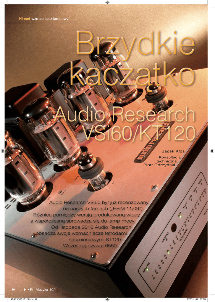 Hi-end wzmacniacz lampowy Brzydkie VSi60/KT120 40 40-45 VSi60-KT120.indd 40 9/26/11 6:21:37 PM Hi-end wzmacniacz lampowy związku z wymianą lamp poprzedni i obecny model VSi60 różnią się mocą. Wcześniejszy oferował około 50 W na kanał. Teraz osiągi wzrosły do 2 x 57 W. Posiadacze starszych egzemplarzy mogą się zaopatrzyć w dwie dobierane pary KT120 i zainstalować je w dotychczas użytkowanym urządzeniu. Operacja nie wymaga specjalistycznej wiedzy; wystarczy stanowczo, ale z wyczuciem wyjąć stare lampy z podstawek, a na ich miejsce wcisnąć nowe. Później ustawić prąd spoczynkowy zgodnie ze wskazówkami podanymi poniżej i cieszyć się nowym wzmacniaczem. Koszt upgrade’u zamyka się kwotą 1920 zł. Za kwartet KT120 to sporo, ale lampy kupowane od Audio Researcha nigdy nie należały do tanich. Wysoka cena nie wynika z nadprzyrodzonych właściwości ani sekretnych metod produkcji. Przeciwnie – jest efektem przyziemnie rzetelnej selekcji oraz żmudnej, ale skutecznej procedury pomiarowej. Spora część każdej dostawy przychodzącej od producenta lamp nie nadaje się do wykorzystania i ląduje w koszu. To, co zostaje, jest mierzone według zasad opracowanych przez ARC, a następnie dobierane w pary. Można kupić lampy gdzie indziej i zapłacić mniej. Nie ma jednak gwarancji, że będą równie dobre. Poza tym i tak trzeba dopłacić za parowanie. ARC deklaruje, że pierwszego etapu selekcji nie przechodzi od 40 do 60 % z każdej dostawy. Musi jednak za nie zapłacić, podobnie jak za kilkadziesiąt godzin wygrzewania i pomiarów. I te koszty przerzuca na odbiorcę detalicznego. Płacimy więc za dobre i złe lampy, pracę techników i energię elektryczną, ale w zamian otrzymujemy towar najwyższej jakości. Budowa VSi60 to skromnie wyglądający wzmacniacz zintegrowany o mocy 2 x 57 W. Jest dostępny ze srebrnym albo czarnym pa- nelem frontowym. Do poprzedniej wersji producent oferował klatkę ochronną, która zakrywała lampy. KT120 są na tyle duże, że stara konstrukcja nie pasuje, a nowej na razie nie ma. Należy mieć nadzieję, że Audio Research wkrótce uzupełni ten brak. Klatka nie wygląda może ślicznie, ale bez niej użytkowanie VSi60 wymaga większej uwagi. Trochę strach zostawić odsłonięte lampy, kiedy mają do nich dostęp dzieci i zwierzęta. W takim przypadku o nieszczęście – w najlepszym razie oparzenie – nietrudno. Przednia ścianka zawiera włącznik, wybierak źródeł, regulację głośności, przyciski trybów „mute” i „mono” oraz następuje pełna aktywacja, ale przełączenie urządzenia w tryb czuwania. To typowe dla Audio Researcha. Producent chroni w ten sposób użytkownika przed… nim samym. VSi60 zapamiętuje wejście i poziom głośności, z którym ostatnio słuchaliśmy. Jeżeli wyłączyliśmy go nie ściszając, po ponownym uruchomieniu kolumny mogłyby od razu dostać bardzo głośny sygnał. Automatyczne wyciszenie eliminuje przykre niespodzianki. Regulacja głośności jest sygnalizowana 20 diodami, ale w rzeczywistości odbywa się w 103 krokach. Przydałaby się lepsza rozdzielczość na początku skali. VSi60 pracuje z bardzo wysokim wzmocnieniem 32,5 dB (0,47 V dla pełnego wysterowania), w związku z czym szybko robi się głośno. W normalnej eksploatacji to nie przeszkadza, ale wie- Audio Research VSi60 odpowiadający im zestaw zielonych diod. Wskazują aktualnie aktywne źródło i poziom wysterowania. Zrezygnowano ze sterowania mechanicznego. Wszystkie funkcje aktywujemy przyciskami, które współpracują z układem logicznym bazującym na mikroprocesorze. Kontroluje on nie tylko uruchamianie prostych komend, ale też czuwa nad prawidłowością działania wzmacniacza. We współpracy z przekaźnikiem realizuje m.in. opóźnione załączanie napięcia anodowego, które korzystnie wpływa na żywotność lamp. Po włączeniu wzmacniacz nie od razu jest gotowy do pracy. Należy odczekać 30 sekund, ponieważ w tym czasie bańki są wstępnie ogrzewane. Potem też nie z lampami KT120. czorem dobrze by było nieco zwolnić. Wszystkie funkcje zdublowano na pilocie. Choć skromny i plastikowy, wygodnie się go używa. Do VSi60 podłączymy pięć źródeł liniowych. Posiadacze gramofonów muszą dokupić osobny przedwzmacniacz korekcyjny. Przewidziano za to monofoniczne wyjście sygnału do aktywnego subwoofera. Wszystkie gniazda są solidne, złocone, z teflonową izolacją. Bez problemu można zainstalować nawet masywne końcówki kabli. Mniej wygodne, zwłaszcza dla użytkowników z Europy, okazują się terminale głośnikowe. W zasadzie przyjmują tylko wtyki widełkowe. Teoretycznie da się w nich też umieścić gołe przewody, ale dziurka jest na tyle mała, że operacja będzie przypominać nawlekanie igły. O bananach można zapomnieć. Nawet 41 40-45 VSi60-KT120.indd 41 9/26/11 6:21:42 PM Hi-end wzmacniacz lampowy jeśli w gniazdach tkwią tylko zaślepki, to są nieusuwalne. Z transformatorów wyprowadzono odczepy dla kolumn 4- i 8-omowych. W przypadkach nieoczywistych warto wypróbować obie opcje i wybrać tę, która brzmi lepiej. Nic się nie zepsuje. Gniazdo zasilania to standardowe IEC. Łatwo wypróbować sieciówki inne niż fabryczna. Pamiętajmy, że prawidłową polaryzację zachowamy, podłączając żyłę gorącą do lewego styku w gnieździe wzmacniacza (nad falką oznaczającą prąd zmienny). mogłyby zniekształcać odczyt. Końcówki multimetru należy umieścić w gniazdach opisanych jako V3 i ustawić śrubokrętem napięcie 0,60 VDC trymerem przyporządkowanym lampie V3. Tę samą czynność powtarzać dla pozostałych. Kalibrację przeprowadzamy bez sygnału na wejściu, żeby nie modulował wskazań. Warto to robić, gdy bańki porządnie się rozgrzeją, po około godzinie odsłuchu. Po dwóch tygodniach czynność powtarzamy. Później wystarczy kontrola co trzy miesiące. Częściej to już lekkie natręctwo, bo trymery są dobre i będą utrzymywać