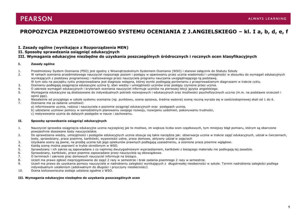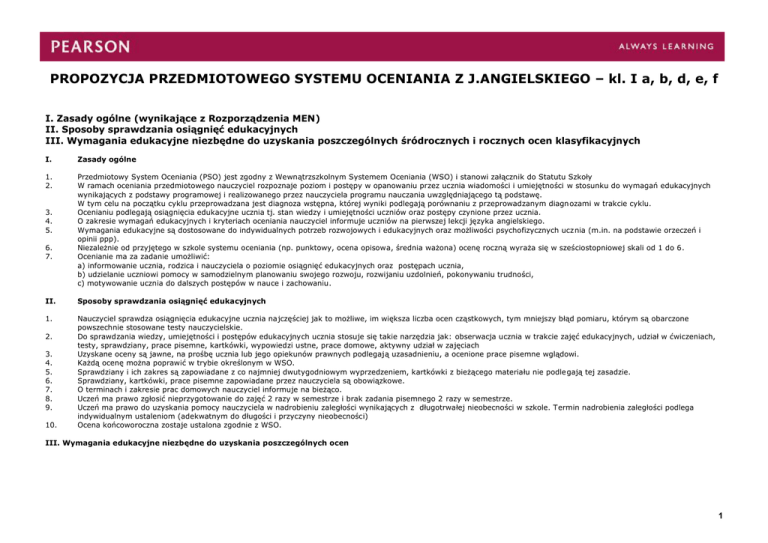 PROPOZYCJA PRZEDMIOTOWEGO SYSTEMU OCENIANIA Z J.ANGIELSKIEGO – kl. I a, b, d, e, f I. Zasady ogólne (wynikające z Rozporządzenia MEN) II. Sposoby sprawdzania osiągnięć edukacyjnych III. Wymagania edukacyjne niezbędne do uzyskania poszczególnych śródrocznych i rocznych ocen klasyfikacyjnych I. Zasady ogólne 1. 2. Przedmiotowy System Oceniania (PSO) jest zgodny z Wewnątrzszkolnym Systemem Oceniania (WSO) i stanowi załącznik do Statutu Szkoły W ramach oceniania przedmiotowego nauczyciel rozpoznaje poziom i postępy w opanowaniu przez ucznia wiadomości i umiejętności w stosunku do wymagań edukacyjnych wynikających z podstawy programowej i realizowanego przez nauczyciela programu nauczania uwzględniającego tą podstawę. W tym celu na początku cyklu przeprowadzana jest diagnoza wstępna, której wyniki podlegają porównaniu z przeprowadzanym diagn ozami w trakcie cyklu. Ocenianiu podlegają osiągnięcia edukacyjne ucznia tj. stan wiedzy i umiejętności uczniów oraz postępy czynione przez ucznia. O zakresie wymagań edukacyjnych i kryteriach oceniania nauczyciel informuje uczniów na pierwszej lekcji języka angielskiego. Wymagania edukacyjne są dostosowane do indywidualnych potrzeb rozwojowych i edukacyjnych oraz możliwości psychofizycznych ucznia (m.in. na podstawie orzeczeń i opinii ppp). Niezależnie od przyjętego w szkole systemu oceniania (np. punktowy, ocena opisowa, średnia ważona) ocenę roczną wyraża się w sześciostopniowej skali od 1 do 6. Ocenianie ma za zadanie umożliwić: a) informowanie ucznia, rodzica i nauczyciela o poziomie osiągnięć edukacyjnych oraz postępach ucznia, b) udzielanie uczniowi pomocy w samodzielnym planowaniu swojego rozwoju, rozwijaniu uzdolnień, pokonywaniu trudności, c) motywowanie ucznia do dalszych postępów w nauce i zachowaniu. 3. 4. 5. 6. 7. II. Sposoby sprawdzania osiągnięć edukacyjnych 1. Nauczyciel sprawdza osiągnięcia edukacyjne ucznia najczęściej jak to możliwe, im większa liczba ocen cząstkowych, tym mniejszy błąd pomiaru, którym są obarczone powszechnie stosowane testy nauczycielskie. Do sprawdzania wiedzy, umiejętności i postępów edukacyjnych ucznia stosuje się takie narzędzia jak: obserwacja ucznia w trakcie zajęć edukacyjnych, udział w ćwiczeniach, testy, sprawdziany, prace pisemne, kartkówki, wypowiedzi ustne, prace domowe, aktywny udział w zajęciach Uzyskane oceny są jawne, na prośbę ucznia lub jego opiekunów prawnych podlegają uzasadnieniu, a ocenione prace pisemne wglądowi. Każdą ocenę można poprawić w trybie określonym w WSO. Sprawdziany i ich zakres są zapowiadane z co najmniej dwutygodniowym wyprzedzeniem, kartkówki z bieżącego materiału nie podle gają tej zasadzie. Sprawdziany, kartkówki, prace pisemne zapowiadane przez nauczyciela są obowiązkowe. O terminach i zakresie prac domowych nauczyciel informuje na bieżąco. Uczeń ma prawo zgłosić nieprzygotowanie do zajęć 2 razy w semestrze i brak zadania pisemnego 2 razy w semestrze. Uczeń ma prawo do uzyskania pomocy nauczyciela w nadrobieniu zaległości wynikających z długotrwałej nieobecności w szkole. Termin nadrobienia zaległości podlega indywidualnym ustaleniom (adekwatnym do długości i przyczyny nieobecności) Ocena końcoworoczna zostaje ustalona zgodnie z WSO. 2. 3. 4. 5. 6. 7. 8. 9. 10. III. Wymagania edukacyjne niezbędne do uzyskania poszczególnych ocen 1 NEXT MOVE 2 1. POZIOM KOMPETENCJI JĘZYKOWEJ WG ESOKJ – A2, KTÓRA JEST MOŻLIWA DO OSIĄGNIĘCIA W WYNIKU REALIZACJI PODRĘCZNIKA NEXT MOVE 2 UMIEJĘTNOŚCI WIEDZA Uczeń posługuje się zakresem środków językowych pozwalających mu na realizację działań językowych w wybranych aspektach następujących bloków tematycznych: Człowiek Dom Praca Życie rodzinne i towarzyskie Podróżowanie i turystyka Kultura Sport Świat przyrody Elementy wiedzy o krajach anglojęzycznych RECEPCJA INTERAKCJA PRODUKCJA SŁUCHANIE: MÓWIENIE: MÓWIENIE: Uczeń rozumie wyrażenia i najczęściej używane słowa, związane ze sprawami dla niego ważnymi (np. podstawowe informacje, dotyczące ucznia i jego rodziny, zakupów, miejsca i regionu zamieszkania, zatrudnienia). Rozumie główny sens zawarty w krótkich, prostych komunikatach i ogłoszeniach. Uczeń posługuje się ciągiem wyrażeń i zdań, by w prosty sposób opisać swoją rodzinę, innych ludzi, warunki życia, swoje wykształcenie, swoją obecną i poprzednią pracę. Uczeń bierze udział w zwykłej, typowej rozmowie wymagającej prostej i bezpośredniej wymiany informacji na znane mu tematy. Potrafi sobie radzić w bardzo krótkich rozmowach towarzyskich, nawet jeśli nie rozumie wystarczająco dużo, by samemu podtrzymać rozmowę. CZYTANIE: PISANIE: Uczeń czyta ze zrozumieniem bardzo krótkie, proste teksty. Potrafi znaleźć konkretne, przewidywalne informacje w prostych tekstach dotyczących, życia codziennego, takich jak ogłoszenia, reklamy, prospekty, karty dań, rozkłady jazdy. Rozumie krótkie, proste listy prywatne. Uczeń pisze krótkie i proste notatki lub wiadomości wynikające z doraźnych potrzeb. Potrafi napisać bardzo prosty list prywatny, na przykład dziękując komuś za coś. Osoba posługująca się językiem na tym poziomie rozumie wypowiedzi i często używane wyrażenia związane z najistotniejszymi sprawami (np.: podstawowe informacje dotyczące rozmówcy, jego rodziny, zakupów, otoczenia, pracy). Potrafi porozumiewać się w typowych, prostych sytuacjach komunikacyjnych, wymagających jedynie bezpośredniej wymiany zdań na tematy znane i powtarzające się. Potrafi w prosty sposób opisywać środowisko, z którego się wywodzi, i bezpośrednie otoczenie, a także wypowiadać się w sposób bardzo prosty na tematy związane z najważniejszymi potrzebami. Opracowane na podstawie: http://europass.cedefop.europa.eu/pl/resources/european-language-levels-cefr 2 Kryteria oceniania ogólne POZIOM PODSTAWOWY OCENA NIEDOSTATECZNA Wiadomo