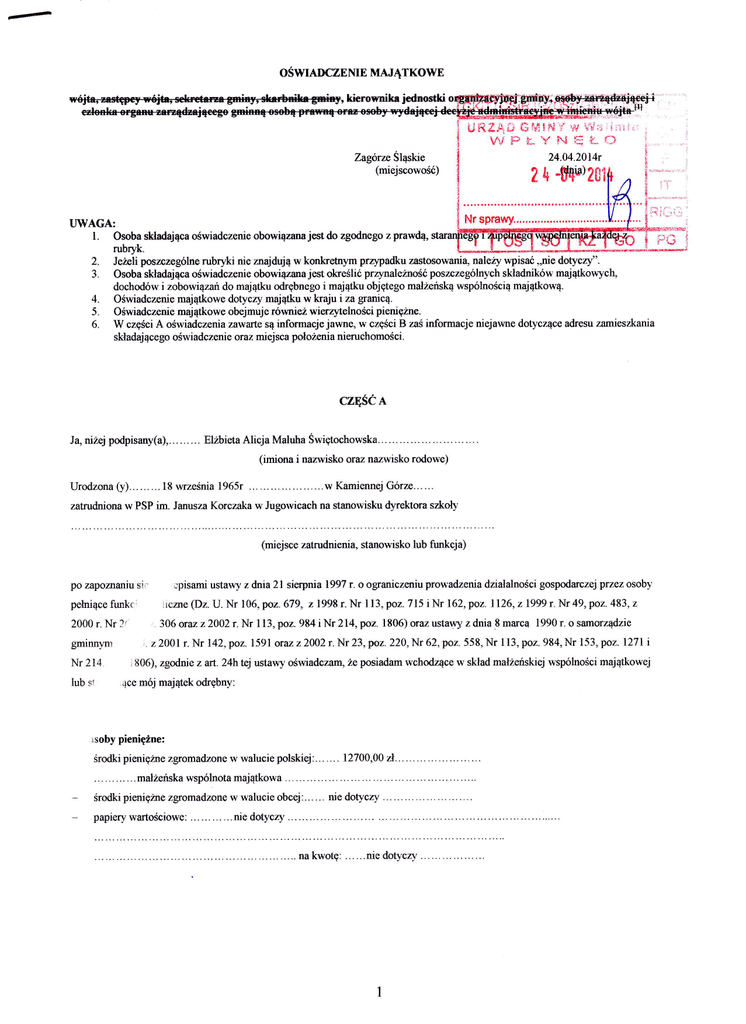 oŚ\ryIADczEME MAlĄTKolvE ł.ó kierownika jedna*tki €złenka-oĘoartaaJfiłdr*ią€Ęo łJ R3Ą,* \rć P Zagórze Śąstie (miejscowość) Gr*iĘY -vł t§li ŁYNĘŁ 24.M.20l4r 2ą-ff)281 i t, a t §",§ § ,j" IIWAGA: l. 2. J_ 4. 5. 6. Osóa sHadająca oświadczenię obowiązana jest do zgodnego z prawdą, rubryk. Jezeli poszczególne rubryki nie znajdują w konlaetnym prąpadku zastosow-anią należy rłpisać .,nie dotyczy". Osoba składająca oświadczenie obowiązana jest ol§eślić przynalea:ość poszłzególny,ch składniliów majątkowycĘ dochodów i zobowiązń do majątku odrębnego i majątku objętego malżeńsĘ wspólnością majątkową. OświadczeŃe majątkowe dotyczy majątlu w kraju i za granicą. Oświadczenię majątkowe obejmuje ró*nież wierzytelności pieniężne. .rł,częsci B zaśinformacje niejawne dotyczące adresu zamieszkania W częściA oświadczenia zawmle są informacje jawne, składającego oświadczenie oraz miejsca pcłożenia nieruchomości. czĘŚCA (imiona i nazrłisko oraz nazwisko rodowe) Urodzona (v). .. ... 18 września 1965r . ., w Kamiennej Górzę... .,, zatrudniona w PSP im. Janusza Korczaka w Jugorvicach na stanov,isku dyrektora szkĄ (miejsce zatrudnienia, stanowisko lub funkcja) sir .;pisami u§taw},z dnia 21 sierpnia 1997 r. o ograniczeniuprowadzeńa działalnościgospodarczej przez osoby pekriące funkc: liciane (Dz. U, Nr 106, poz,679, z t998 r. Nr l13. poz. 715 i Nr l6ż,poz. l|26, z 1999 r, Nr 49, poz, 483- z 2000r.Nr?l 306orazz2002r.Nrl13,poz.984iNr2l4,poz. 1806)orazustayyzdnia8mąrcą 1990r.o§amorządzię gminrynr ), z 200l r, Nr |42,poz. 1591 oraz z2a02 r. Nr 23, poz. 220, Nr 62,poz.558, Nr Il3,poz.984. Nr 153,poz. l27l i 1806), zgodnie z ut.24htej ustaw}"oświadczam, że posiadam wchodzące w skład małżeńskiej wspólności majątkowej Nr 214 lub s1 .ące mój majątek odrębny: po zapoananiu lsoby pieniqżne: środkipienięzne zgromadzone * *, i ra,| ]lt r,v walucie polskiej:....... 12700,00 ż ,.. ... ... ..,malżeńska wspólnota majątkowa środkipieniężre zgromadzone rv walucie obcej;...... nie doĘcry na krł"otę: ...,..nię doĘcz_t n. l. Dom o powierzrhń: 176,2 rn}, o wariości:..,350 tys. ń...... ......... ʧrł prałrny: rvłasnośćwspólnota mająlkowa 2, Mieszkanieopowierzchni:...niedoĘcz1 m2,owartości:...niedoĘczy Ętulprawny: ...nie dotyczy.....,... 3. do§czy Gospodarstworolne: rodzajgospodarstwa:._....nie ......,powierzchnia: ...,..nie dotyczy........... owartości:......niędotyczy......rodzajzabudowy:......niedołczy..,._... §tuł pravrny: 4. ... ... nię dotycz"v... Z tego Ętułu osiągnąłem(ęłam)w roku ubiegĘm przy-chód i dochód w wysokości:... nie dotyczy Innę nieruchomqści: działki: tu 379ll powierzchnia: 940 m2 o warlości60 Ęsięcy złoĘch t w 379/3 powierzchnia 974 m2 o wańości60 tysięcy źoĘch Ętuł prawny; .., . .. własnościowe- wspólnota mają*owa ln. Posiadam udziĄ w spółkach handlowych - nalezy podać liczbę i emitenta udziałów: ... ......nie udzia}y te stanowią pakiet większy niż l0% udzidów w spółce: . . . . . . . . . nie do§czy ... ,.. do§czy Ztegotytufuosiągnąłem(łam)wrokuubieg|"mdochódwwysokości:,........niedoĘczy.,.. Iv. Posiadam akcje w spółkach handlowych - nalezy podać liczĘ i emitenta akcji: ...nie dotl,cz1 akcje te stanowią pa}iiet większy ńż l0% akcji w spółce: . . . . . . . , . nie dotyczy ZtegoĘtułuosiągnąłem(łam)wrokuubiegłymdocho<lwwysokości: ..,...niedoĘczy..,,..... v. Nab1,,lem(łam) (nóył mój małżoneĘz wyłączeniem mienia przynależnego do jego majątku odrębnego) od Skarbu Panstwa, innej paristilowej osoby prawnej, jednostek samorządu terytorialnego, ich złłiązków lub od komwalnej osoby prawnej nastryujące nrienie, które podlegało zbyciu w drodze przetargu - należy podać opis mienia i daĘ nabycia, od kogo: ... ... ....,,...nię daĘczy...... .. . vr. l. Prowadzędziałalnośćgospodarczątzl(nalęłpodacformęprawnąiprzedmiotdziałalności):......... ..,......niedotyczr,......... osobiście...........nicdotygży..........-., Z tego §tułu osiągnąłem(łam)w roku ubiegĘm przychód i dochód w wysokości: .........nie dotyczy 2. Zaraądzalldziałatnościągospodarczą lub jestem przedstawicielem, pehromocnikiem taliiej działalności (naleĘ podać formę prawną i przedmiot działalności): - osobiście ......niedotycą,.. - wspólnie z innymi osobami "..ńe dotycry. Z tego §trrłu osiągąlem(łam) w roku ubiegłym dochod w wysokości: ,,. ...,,. ...nię dotl,czy.. YII. społkr): nie dotycą jestem członkiem zarądu (od kiedy):...., nie do§czy nie doĘcry - jestem członkiem raĄ nadzorczej (od kiedy):... .,. nie dotyczy - jestem członkiem komisji rewizyjnej (od kiedy} l.W spółkach handlowych (nazwa, siedziba Z tego Ętułu osiągnąłem(ęłam)w roku ubiegbm dochód w ąvsokości: . . . . , . . .. nię dotycz"v2. - . . nie do§czy W spółdzielniach jestem członkil :rclv nadzorczejt3l tięay): (od kiedy): (oa człcn' i,ornisji rewizyjnej Z tego tyfułu ol :tem (łam) w roku ńiegĘrn dochód jestem 3. W fund: - : } zarządu(odkiedy): Jln członkiem rady lńzsrczej (od kiedy): ,członkięm rll. ,, . nie nie do§czy do§czy w ł_łsokości:... ... nie dotvczy prowadzącyoh działalnośćgospodarcą: ;lein członkiem komisji rewizyjnej (od kiedyi: .:o .. ...... nie doĘcą niedo§cz_v _.. ... . .. nie doĘczy ... nie do§czy §tułu osiąpąłem(łam) wrokuubiegllrn dochod w wysokości: ...... niedotycąv ...,, Inne dochody osiągane z Ętułu zatrudnienia lub imej działalności zarobkowej lub zaięć, z podaniem kwot uzyskiwanych z ,iażdego tytułu: ,.. ..,z Ę,tulu zatrudnienia: 80 576" 84 złofych ; umowy zlecęnia; 14 558,08, wspóknałżonek z §tułu zatrudrrienia: 147 179,5l zło§rh, umowy zlecenia : 11631,93- małźeńskawspólnota majątkowa Ix. Skladniki mie,tia ruchomego o wartościpowyżrj l0 000 żotych (w przypadku pojazdów męchanicznych model i ro