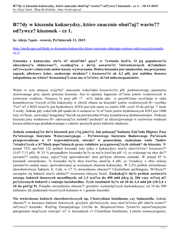 B??dy w kiszeniu kukurydzy, które znacznie obni?aj? warto?? od?ywcz? kiszonek - cz 1. - 10-13-2015 by Alicja ?epek - Blog dla Rolnika - http://strefa.agro.pl B??dy w kiszeniu kukurydzy, które znacznie obni?aj? warto?? od?ywcz? kiszonek - cz 1. by Alicja ?epek - wtorek, Pa?dziernik 13, 2015 http://strefa.agro.pl/bledy-w-kiszeniu-kukurydzy-ktore-znacznie-obnizaja-wartosc-odzywcza-kiszonekcz-1/ Kiszonka z kukurydzy sta?a si? niezb?dn? pasz? w ?ywieniu byd?a. O jej popularno?ci zdecydowa?a efektywno??, wynikaj?ca z du?ej zawarto?ci ?atwostrawnych sk?adników od?ywczych i relatywnie niskie koszty wytwarzania. Dobra kiszonka jest smakowita, ma przyjemny zapach, oliwkowy kolor, zachowuje struktur? i kwasowo?ci ok 4,2 pH, jest stabilna tlenowo (niepodatna na wtórn? fermentacj?) oraz ma w?a?ciwy sk?ad mikroorganizmów. Warto w tym miejscu wyja?ni? znaczenie wska?nika kwasowo?ci pH, podstawowego parametru stosowanego przy opisie procesu kiszenia. Jest to ujemny logarytm st??enia jonów wodorowych w roztworze wodnym. Oznacza ?e przy pH =7 wi?c takim jaki w przybli?eniu wyst?puje w soku komórkowym ?ywych ro?lin kukurydzy w chwili zbioru na kiszonk? jonów wodorowych H+ (szybko ??cz? si? z H2O tworz?c jon hydroniowy H3O) jest tyle samo co jonów OH- czyli 10 do pot?gi -7 mola /l wody. Jednak gdy wska?nik pH spada do 4 oznacza to ?e st??enie jonów hydroniowych H3O jest 1000 razy wi?ksze, powoduj? koagulacj? bia?ek na powierzchni b?ony komórkowej drobnoustrojów. Podczas kiszenia jony wodorowe H+ zakwaszaj?ce zielonk? pochodz? ze zdysocjowanego w roztworze wodnym kwasu mlekowego produkowanego z cukrów prostych przez bakterie mlekowe. Jednak zaskakuj?co du?o kiszonek jest z?ej jako?ci. Jak pokazuj? badania Zak?adu Higieny Pasz Pa?stwowego Instytutu Weterynaryjnego – Pa?stwowego Instytutu Badawczego Pu?awach przeprowadzone w 13 województwach, równie? w pomorskim, znaleziono wiele ?ladów ?wiadcz?cych o b??dach pope?nianych przez rolników przygotowuj?cych zielonk? do kiszenia. W ponad 75% spo?ród 122 próbek kiszonki (nie tylko z kukurydzy) mia?o niew?a?ciw? kwasowo?? (3,07-7,13 pH). W 33 % przypadków kiszonka by?a za ma?o kwa?na pH >5, co wskazuje na zbyt du?? zawarto?? suchej masy, najcz??ciej spowodowan? zbyt pó?nym zbiorem zielonki. W ponad 45 % kiszonek stwierdzono, ?e kiszonka by?a zbyt kwa?na, poni?ej 4 pH, co ?wiadczy o zbyt niskiej zawarto?ci suchej masy, spowodowanej za wczesnym zbiorem kukurydzy. W 3,3% próbek stwierdzono chorobotwórcze bakterie E. Coli, w 17 % stwierdzono obecno?? Clostridium perfringens. Wi?kszo?? szczepów tej bakterii mia?a zdolno?? tworzenia toksyny beta2. Zaskakuj?c du?o próbek zawiera?o szczepy bakterii tlenowych mezofilnych; od 1,3 tysi?ca do 490 mld jtk/g tj. 204 razy wi?cej ni? po?ytecznych bakterii z rodzaju lactobacillus. Tych ostattnich by?o od 10 do 2,4 mld jtk (10-2,4 x 10 do pot?gi 9). Ponadto stwierdzono obecno?? grzybów wydzielaj?cych mykotoksyny; od 10 do 500 milionów jtk (jednostek tworz?cych kolonie) w 1 gramie kiszonki. Nie stwierdzono bakterii chorobotwórczych np. Clostrydium botulinum, czy Salmonella. Jednak obecno?? w kiszonce bakterii tlenowych, grzybów ple?niowych, oraz niew?a?ciwe pH obni?a warto?? od?ywcz? kiszonki. Wed?ug Europejskiego Urz?du ds. Bezpiecze?stwa ?ywno?ci najwa?niejszymi patogenami mog?cymi rozwija? si? w kiszonkach s? Clostrdium botulinum, Listeria monocytogenes, 1/2 B??dy w kiszeniu kukurydzy, które znacznie obni?aj? warto?? od?ywcz? kiszonek - cz 1. - 10-13-2015 by Alicja ?epek - Blog dla Rolnika - http://strefa.agro.pl oraz Escherichia coli. Powszechno?? wyst?powania nieprawid?owo?ci w procesie kiszenia sk?ania do zwrócenia uwagi na punkty krytyczne i najcz??ciej pope?niane b??dy w czasie zakiszania. Na proces kiszenia ma wp?yw nawo?enie organiczne. Je?li stosujemy pomiot kurzy, czy pozosta?o?ci pofermentacyjne i jednocze?nie kukurydza jest nisko koszona wzrasta zagro?enie zainfekowania chorobotwórczymi bakteriami np. w/w Clostridium botulinum. Wydziela gro?n? dla zwierz?t toksyn? BNT wywo?uj?c? chorob? botulinoz?. Pierwszym objawem tej choroby jest wiotczenie mi??ni g?owy. Toksyny s? produkowane tylko przy pH powy?ej 4,6. Rozwojowi tej bakterii sprzyja wysoka zawarto?? suchej masy wynikaj?ca z opó?nionego terminu zbioru. Produktami metabolizmu tych bakterii jest kwas mas?owy i je?li jego ilo?? przekroczy 5 g/kg suchej masy to zwierz?ta niech?tnie tak? kiszonk? pobieraj?. Obecno?? tej bakterii w kiszonce ?wiadczy o rozpocz?ciu wtórnej fermentacji. Termin zbioru jest jednym z najwa?niejszych czynników decyduj?cych o jako?ci kiszonki. Pomimo, ?e idealnym czasem na zbiór zielonki jest faza, gdy zawarto?? suchej masy wynosi oko?o 32%, to rzadko udaje si? tego dokona?. Warto zda? sobie spraw? z konsekwencji przekroczenia warto?ci progowych dla tego parametru. Je?li zielonka b?dzie zawiera?a mniej ni? 30 % s.m. to wzrasta dost?pno?? cukrów prostych i nast?puje burzliwy przebieg fermentacji. Jej skutkiem jest spadek pH poni?ej. W tych warunkach nabieraj? tempa przemiany prowadz?ce do syntetyzowania nadmiernych ilo?ci kwasu mas?owego i alkoholu etylowego, obni?aj?cych smakowito?? paszy. Nast?puj? równie? straty spowodowane odciekiem p?ynów kiszonkowych a wraz z nimi najcenniejszych sk?adników od?ywczych. Równie niekorzystne jest zbieranie zielonki przy zawarto?ci s.m. powy?ej 35 %. W tych warunkach spada ilo?? cukrów prostych niezb?dnych do wytworzenia konserwuj?cego kiszonk? kwasu mlekowego w ilo?ciach potrzebnych do obni?enia pH do ok. 4,2. Przy zawarto?ci s.m. powy?ej 37% trudno wyprze? powietrze które sprzyja rozwojowi niekorzystnych bakterii tlenowych czy grzybów ple?niowych, oraz wy?ej wspomnianej Clostrydium botulinum. Do?? prost? metod? wyznaczania terminu zbioru kukurydzy na kiszonk? jest obserwacja linii mlecznej ziarniaka, która powinna by? w odleg?o?ci 1/3 od podstawy ziarniaka. W tej fazie, podczas zgniecenia ziarniaka wydostaje si? stwardnia?y rdze?. Zwykle jest to faza ko?ca dojrza?o?c