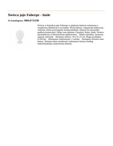 Świeca jajo Faberge - białe Nr katalogowy: 088,672338 Świeca w kształcie jaja Faberge w pięknym kolorze wykonana z wyjątkową dbałością o szczegóły. Wystrzałowa i elegancka dekoracja wnętrza, która przyciągnie uwagę każdego. Pomysł na niezwykły gadżet promocyjny. Długi czas palenia: 6 godzin. Kolor: biały. Świeca sprzedawana w kartonowym opakowaniu. Skład: parafina, stearyna, zapach, barwnik. Wymiary świecy: 10 x 6 x 6 cm. Waga produktu: 0,100 kg. Minimalne zamówienie: 1 sztuka. Dostępne również inne kolory. Istnieje także możliwość wykonania świecy według indywidualnego zamówienia klienta.