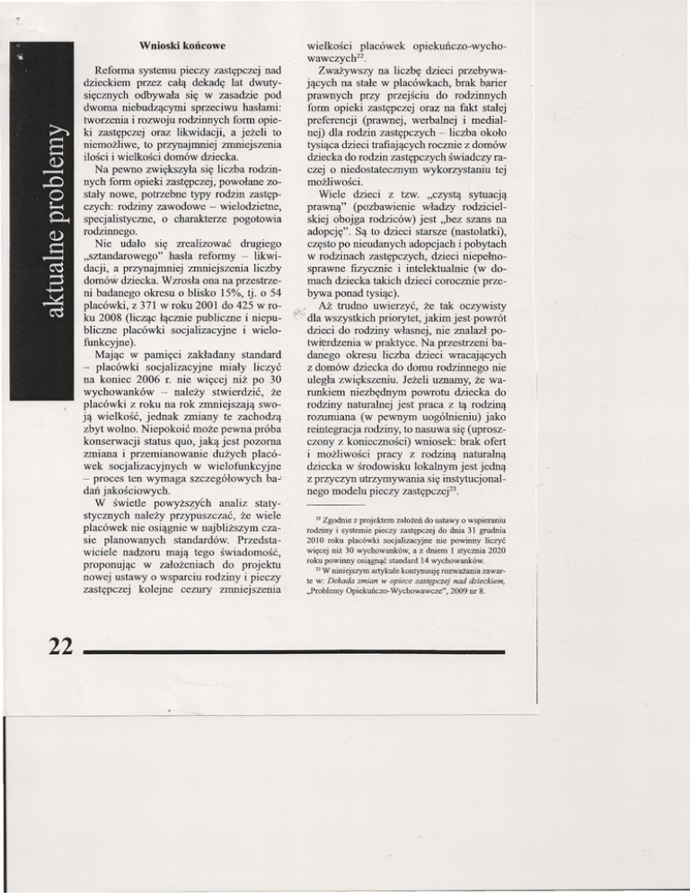 wielkości placówek opiekuńczo-wychowawczycłr". Zważywszy na liczbę dzieci przebywaReforma systemu pieczy zastępczej nad jących na stałe w placówkach, brak barier dzieckiem przez całą dekadę lat dwutyprawnych przy przejściu do rodzinnych sięcznych odbywała się 'IV zasadzie pod dwoma niebudzącymi sprzeciwu hasłami: form opieki zastępczej oraz na fakt stałej tworzenia i rozwoju rodzinnych form opiepreferencji (prawnej, werbalnej i medialki zastępczej oraz likwidacji, a jeżeli to nej) dla rodzin zastępczych - liczba około niemożliwe, to przynajmniej zmniejszenia tysiąca dzieci trafiających rocznie z domów dziecka do rodzin zastępczych świadczy railości i wielkości domów dziecka. Na pewno zwiększyła się liczba rodzinczej o niedostatecznym wykorzystaniu tej nych form opieki zastępczej, powołane zomożliwości. stały nowe, potrzebne typy rodzin zastępWiele dzieci z tzw. "czystą sytuacją czych: rodziny zawodowe - wielodzietne, prawną" (pozbawienie władzy rodzicielspecjalistyczne, o charakterze pogotowia skiej obojga rodziców) jest "bez szans na rodzinnego. adopcję". Są to dzieci starsze (nastolatki), Nie udało się zrealizować drugiego często po nieudanych adopcjach i pobytach w rodzinach zastępczych, dzieci niepełno"sztandarowego" hasła reformy - likwidacji, a przynajmniej zmniejszenia liczby sprawne fizycznie i intelektualnie (w dodomów dziecka. Wzrosła ona na przestrzemach dziecka takich dzieci corocznie przeni badanego okresu o blisko 15%, tj. 054 bywa ponad tysiąc). placówki, z 371 w roku 2001 do 425 w ro- .> Aż trudno uwierzyć, że tak oczywisty ku 2008 (licząc łącznie publiczne i niepu- :;Ć:} dla wszystkich priorytet, jakim jest-powrót bliczne placówki socjalizacyjne i wielodzieci do rodziny własnej, nie znalazł potwrerdzenia w praktyce. Na przestrzeni bafunkcyjne). danego okresu liczba dzieci wracających Mając w pamięci zakładany standard z domów dziecka do domu rodzinnego nie - placówki socjalizacyjne miały liczyć na koniec 2006 r. nie więcej niż po 30 uległa zwiększeniu. Jeżeli uznamy, że wawychowanków - należy stwierdzić, że runkiem niezbędnym ·powrotu dziecka do rodziny naturalnej jest praca z tą rodziną placówki z roku na rok zmniejszają swoją wielkość, jednak zmiany te zachodzą . rozumiana (w pewnym uogólnieniu) jako zbyt wolno. Niepokoić może pewnapróba reintegracja rodziny, to nasuwa się (uproszkonserwacji status quo, jaką jest pozorna czony z konieczności) wniosek: brak ofert zmiana i przemianowanie dużych placói możliwości pracy z rodziną naturalną dziecka w środowisku lokalnym jest jedną wek socjalizacyjnych w wielofunkcyjne z przyczyn utrzymywania się instytucjonal- proces ten wymaga .szczegółowych badań jakościowych. ' nego modelu pieczy zastępczej". W świetle powyższych analiz statystycznych należy przypuszczać, że wieje Zgodnie z projektem założeń do ustawy o wspieraniu placówek nie osiągnie w najbliższym czarodziny i systemie pieczy zastępczej do dnia 31 grudnia 20 l O roku placówki socjalizacyjne nie powinny liczyć sie planowanych standardów. Przedstawięcej niż 30 wychowanków, a z dniem l stycznia 2020 wiciele nadzoru mają tego świadomość, roku powinny osiągnąć standard 14 wychowanków. proponując w założeniach do projektu W niniejszym artykule kontynuuję rozważania zawarnowej ustawy o wsparciu rodziny i pieczy te w: Dekada zmian w opiece zastępczej nad dzieckiem, zastępczej kolejne cezury zmniejszenia "Problemy Opiekuńczo-Wycbowawcze", 2009 nr 8. Wnioski końcowe 22 23 22