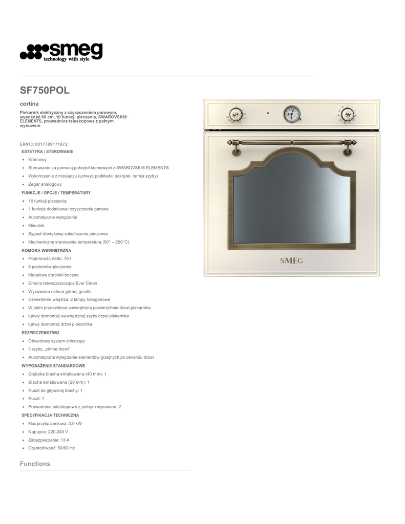 SF750POL cortina Piekarnik elektryczny z czyszczeniem parowym, wysokość 60 cm, 10 funkcji pieczenia, SWAROVSKI® ELEMENTS, prowadnice teleskopowe z pełnym wysuwem EAN13: 8017709171872 ESTETYKA / STEROWANIE Kremowy Sterowanie za pomocą pokręteł kremowych z SWAROVSKI® ELEMENTS Wykończenie z mosiądzu (uchwyt, podkładki pokręteł, ramka szyby) Zegar analogowy FUNKCJE / OPCJE / TEMPERATURY 10 funkcji pieczenia 1 funkcja dodatkowa: czyszczenie parowe Automatyczne wyłączenie Minutnik Sygnał dźwiękowy zakończenia pieczenia Mechaniczne sterowanie temperaturą (50° – 250°C) KOMORA WEWNĘTRZNA Pojemność netto: 70 l 5 poziomów pieczenia Metalowe drabinki boczne Emalia łatwoczyszcząca Ever Clean Wysuwana osłona górnej grzałki Oświetlenie wnętrza: 2 lampy halogenowe W pełni przeszklona wewnętrzna powierzchnia drzwi piekarnika Łatwy demontaż wewnętrznej szyby drzwi piekarnika Łatwy demontaż drzwi piekarnika BEZPIECZEŃSTWO Obwodowy system chłodzący 3 szyby, „zimne drzwi” Automatyczne wyłączenie elementów grzejnych po otwarciu drzwi WYPOSAŻENIE STANDARDOWE Głęboka blacha emaliowana (40 mm): 1 Blacha emaliowana (20 mm): 1 Ruszt do głębokiej blachy: 1 Ruszt: 1 Prowadnice teleskopowe z pełnym wysuwem: 2 SPECYFIKACJA TECHNICZNA Moc przyłączeniowa: 3,0 kW Napięcie: 220-240 V Zabezpieczenie: 13 A Częstotliwość: 50/60 Hz Functions Wersje SF750AO - antracyt, pokrętła z mosiądzu SF750AS - antracyt, pokrętła z postarzanego srebra SF750BS - biały, pokrętła z postarzanego srebra SF750OT - mosiądz, pokrętła z mosiądzu SF750PX - kremowy, srebrne pokrętła SF750PS - kremowy, pokrętła z postarzanego srebra SF750RA - miedź, miedziane pokrętła SF750RWX - czerwone wino, srebrne pokrętła SF750PO - kremowy, pokrętła z mosiądzu Smeg Polska Sp. z o.o. ul. Cybernetyki 9 02-677 Warszawa Tel. +48 22 276 14 00 SF750POL cortina czyszczenie parowe 60 cm kremowy klasa energochłonności A elektryczne Klasa A: Klasa A piekarnika zapewnia niskie zużycie energii. CHŁODNE DRZWI: Większość piekarników firmy SMEG posiada “chłodne drzwi”. Dzięki połączeniu systemu obwodowego chłodzenia i wewnętrznym szybom odbijającym ciepło, temperatura zewnętrznej powierzchni drzwi jest utrzymywana poniżej 50 ° C. Dodatkowo system ten chroni meble będące w kontakcie z piekarnikiem przed przegrzewaniem. POTRÓJNIE OSZKLONE DRZWI: Zewnętrzna powierzchnia nawet podczas długiego pieczenia pozostaje zimna, co zapewnia maksymalne bezpieczeństwo użytkowania. Natomiast dwie wewnętrzne szyby odbijają ciepło, co ma znaczenie dla efektywności używanej energii. POZIOMY PIEKARNIKA: Piekarniki firmy SMEG z maksymalna pojemnością 72 litrów posiadają 5 poziomów, co zapewnia maksymalną elastyczność w użytkowaniu. Pozwala to na oszczędność czasu potrzebnego do przyrządzenia kilku potraw w tym samym czasie albo konieczności przygotowania dużych ilości. DEMONTOWALNE SZKŁO WEWNĘTRZNE: W większości piekarników firmy SMEG szkło wewnątrz drzwi jest łatwe w demontażu, co również znacznie ułatwia utrzymanie w czystości urządzenia. JEDNOLITE SZKŁO WEWNĘTRZNE: W większości piekarników firmy SMEG zainstalowane w drzwiach szkło wewnętrzne posiada wyjątkowo gładką powierzchnię, bez żadnych wkrętów, co znacznie ułatwia utrzymanie w czystości urządzenia. STATYCZNY SYSTEM CHŁODZENIA: Innowacyjny STATYCZNY system chłodzenia pomaga chronić meble od nadmiernej temperatury podczas pracy urządzenia. PROWADNICE TELESKOPOWE: Łatwe w instalacji prowadnice teleskopowe znacznie ułatwiają wyciąganie potraw z piekarnika, bez ich przymocowywania. Zapewnia to maksymalne bezpieczeństwo w procesie gotowania. OŚWIETLENIE WNĘTRZA PIEKARNIKA: Piekarniki firmy Smeg o maksymalnej pojemności dla lepszego oświetlenia wnętrzna posiadają dwie lampy halogenowe umieszczone po bokach i na różnych poziomach. OSŁONA GÓRNEJ GRZAŁKI: Rozwiązanie to chroni górną część piekarnika przed zanieczyszczeniem. Element chroniący jest łatwy w demontażu i może być myty w zmywarce. EMALIA ŁATWOCZYSZCZĄCA EVER CLEAN: Emalia, którą jest pokryte wnętrze piekarników. Jest niezwykle łatwa w czyszczeniu, ze względu na znikomą interakcję z tłuszczami i odporność na różne kwasy. MAXI OBJĘTOŚĆ: Komora kuchni wolnostojącej 70 l (brutto is 90 l) GRZAŁKA DOLNA: Funkcja ta jest najbardziej odpowiednia do przygotowania potraw wymagających wysokiej temepratury od spodu, bez potrzeby przypiekania lub do powolnego pieczenia. Do ciast, pizzy, potrawek, lub zapiekanek. WENTYLATOR, GRZAŁKA DOLNA: Dodanie dolnej grzałki do wymuszonego obiegu podnosi temperaturę w dolnej części potrawy, zapewniając jej skuteczniejsze pieczenie środka bez przypiekania powierzchni. WENTYLATOR, GRZAŁKA GÓRNA I DOLNA: Grzałki w połączeniu z wentylatorem zapewniają równomierną temperaturę w całej komorze. Jest to metoda dająca podobne efekty do pieczenia tradycyjnego. Mniej wydajna od użycia wentylatora i 3 grzalek. Najlepsza do wypieku ciast. GRZAŁKA GÓRNA I DOLNA: Włączenie tych 2 grzałek stosuje się w pieczeniu tradycyjnym, odpowiednim do przygotowanie potraw wymagających delikatnego podgrzewania, jak np. pieczenie ciasta. Piekarnik powinien zostać wstępnie nagrzany do wymaganej temperatury, a naczynie ustawione po środku. Jest to metoda , która najlepiej sprawdza się w przypadku większych, pojedynczych wypieków. WENTYLATOR, GRZAŁKA PIERŚCIENIOWA: Grzałka w połączeniu z wentylatorem zapewniają równomierną temperaturę w całej komorze, na wszystkich półkach. Podczas pieczenia potraw ponad 20 minut, niepotrzebne jest stosowanie wstepnego rozgrzania piekarnika. Jest to metoda dająca oszczędność energii, kótszy czas podgrzewania. idealna do odgrzewania zimnych potraw. WENTYLATOR, GRZAŁKA PIERŚCIENIOWA, GÓRNA I DOLNA: Grzałki w połączeniu z wentylatorem zapewniają równomierną temperaturę w całej komorze, na 