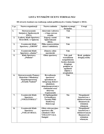 LISTA WYNIKÓW OCENY FORMALNEJ III otwarty konkurs na realizację zadań publicznych z Gminy Śmigiel w 2012r. L.p. 1. 2. Nazwa organizacji Nazwa zadania Stowarzyszenie Inicjatyw Społecznych INGA Ludowy Klub Sportowy MAS-ROL w Spławiu Aktywnie i zdrowo – z Inga zawsze wesoło Zagraj z nami Spławiakami 2012r. Piłka nauczycielem dzieci i młodzieży 3. Uczniowski Klub Sportowy „GROM” 4. Uczniowski Klub Sportowy „Junior” Klub Sportowy „Polonia” Zimowy obóz narciarski Obóz sportowy 6. Stowarzyszenie Pomocy Dzieciom i Młodzieży Niepełnosprawnej „Światło Nadziei” 7. Uczniowski Klub Sportowy „VOLLEYBALL” Rywalizacja sportowasposobem na integrację dzieci i młodzieży niepełnosprawnej z rodzinami oraz aktywny wypoczynek II Ogólnopolski Gwiazdkowy Turniej Piłki Siatkowej Dziewcząt 8. Uczniowski Klub Sportowy „VOLLEYBALL 5. Obóz rekreacyjnosportowy dla członków UKS VOLLEYVALL Śmigiel Spełnia wymogi formalne Tak Uwagi Tak Tak Tak Tak, pod warunkiem uzupełnienia braku złożenia drugiego podpisu za zgodność odpisu z oryginałem Tak Brak podpisu drugiej osoby Nie Niespójność kosztorysu z deklarowanym finansowym wkładem własnym Niespójność kosztorysu z deklarowanym finansowym wkładem własnym. Nie 9. Stowarzyszenie „Jesteśmy Wśród Was” „Trzy wyspy”wycieczka krajoznawcza dla osób niepełnosprawnych Nie Brak środków finansowych własnych Błędy należy poprawić w terminie do 19.01.2012r.W przypadku nie usunięcia braków formalnych oferty w oznaczonym terminie oferta zostanie odrzucona z przyczyn formalnych bez możliwości kolejnego jej uzupełnienia. Burmistrz Śmigla (-)Wiktor Snela