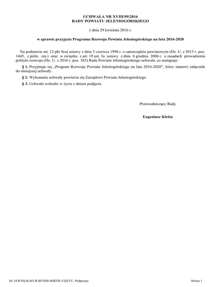 UCHWAŁA NR XVIII\99\2016 RADY POWIATU JELENIOGÓRSKIEGO z dnia 29 kwietnia 2016 r. w sprawie przyjęcia Programu Rozwoju Powiatu Jeleniogórskiego na lata 2016-2020 Na podstawie art. 12 pkt 9ca) ustawy z dnia 5 czerwca 1998 r. o samorządzie powiatowym (Dz. U. z 2015 r. poz. 1445, z późn. zm.) oraz w związku z art. 19 ust. 3a ustawy z dnia 6 grudnia 2006 r. o zasadach prowadzenia polityki rozwoju (Dz. U. z 2016 r. poz. 383) Rada Powiatu Jeleniogórskiego uchwala, co następuje: § 1. Przyjmuje się „Program Rozwoju Powiatu Jeleniogórskiego na lata 2016-2020”, który stanowi załącznik do niniejszej uchwały. § 2. Wykonanie uchwały powierza się Zarządowi Powiatu Jeleniogórskiego. § 3. Uchwała wchodzi w życie z dniem podjęcia. Przewodniczący Rady Eugeniusz Kleśta Id: IAWXQ-KAFLR-BYSDI-MJKFK-CQZYU. Podpisany Strona 1 Uzasadnienie Zgodnie art. 12 pkt 9ca) ustawy z dnia 5 czerwca 1998 r. o samorządzie powiatowym (Dz. U. z 2015 r. poz. 1445, z późn. zm.) do wyłącznej właściwości rady powiatu należy uchwalenie programów rozwoju w trybie określonym w przepisach o zasadach prowadzenia polityki rozwoju. Na podstawie z art. 18 ust. 3 ustawy z dnia 6 grudnia 2006 r. o zasadach prowadzenia polityki rozwoju (t.j. Dz. U. z 2016 r. poz. 383) projekt programu rozwoju opracowuje oraz uzgadnia zarząd powiatu. Natomiast art. 19 ust. 3a cytowanej wyżej ustawy stanowi, iż program rozwoju przyjmowany jest przez radę powiatu w drodze uchwały. Na podstawie art. 32 ust. 2 pkt 2a ustawy z dnia 5 czerwca 1998 roku o samorządzie powiatowym oraz art. 18 ust. 3 w związku z art. 19 ust. 3a ustawy z dnia 6 grudnia 2006 r. o zasadach prowadzenia polityki rozwoju uchwałą Nr 64/183/16 Zarząd Powiatu Jeleniogórskiego w dniu 25 lutego 2016 r. opracował projekt Programu Rozwoju Powiatu Jeleniogórskiego na lata 2016-2020. W okresie od 26 lutego do 31 marca 2016 r. przeprowadzono 35 dniowe konsultacje projektu programu z jednostkami samorządu terytorialnego, partnerami społecznymi i gospodarczymi oraz Komisją Wspólną Rządu i Samorządu Terytorialnego. Ponadto projekt programu stosownie do art. 6a ustawy o zasadach prowadzenia polityki rozwoju uzgodniono w zakresie oceny oddziaływania na środowisko. „Program Rozwoju Powiatu Jeleniogórskiego na lata 2016-2020” to najważniejszy dokument określający kierunki rozwoju Powiatu na najbliższe lata. Program rozwoju opracowany przez Zarząd Powiatu jest wynikiem prac grupy pracowników Starostwa Powiatowego w Jeleniej Górze oraz przedstawicieli Jednostek Organizacyjnych Powiatu przy udziale osób reprezentujących różne instytucje i organizacje. Jest dokumentem o znaczeniu strategicznym i planistycznym, będącym skutecznym narzędziem do zarządzania rozwojem naszego Powiatu. Program wyznacza cele, które będą realizowane poprzez wypracowane działania w latach 2016-2020 przy uwzględnieniu kontynuacji kierunków rozwoju jakie wyznaczyła „Strategia Zrównoważonego Rozwoju Powiatu Jeleniogórskiego na lata 2006-2014. Id: IAWXQ-KAFLR-BYSDI-MJKFK-CQZYU. Podpisany Strona 1 Załącznik do uchwały nr XVIII/99/2016 Rady Powiatu Jeleniogórskiego z dnia 29 kwietnia 2016 r. STAROSTWO POWIATOWE W JELENIEJ GÓRZE Program Rozwoju Powiatu Jeleniogórskiego na lata 2016-2020 Jelenia Góra, kwiecień 2016 r. Id: IAWXQ-KAFLR-BYSDI-MJKFK-CQZYU. Podpisany Strona 2 Program Rozwoju Powiatu Jeleniogórskiego na lata 2016 -2020 Strona 2 z 54 Id: IAWXQ-KAFLR-BYSDI-MJKFK-CQZYU. Podpisany Strona 3 Program Rozwoju Powiatu Jeleniogórskiego na lata 2016 -2020 Strona 3 z 54 SPISTREŚCI WSTĘP..............................................................................................................................................4 ROZDZIAŁI........................................................................................................................................6 1. CHARAKTERYSTYKAPOWIATU...........................................................................................................6 1.1. GminyPowiatuJeleniogórskiego................................................................................................6 1.2. Ludność.......................................................................................................................................8 1.3. Rynekpracy................................................................................................................................9 1.4. Rozwójgospodarczyazagospodarowanieprzestrzenne.........................................................10 1.5. Bezrobocie................................................................................................................................12 2. EDUKACJA........................................................................................................................................12 3. POMOCSPOŁECZNA.........................................................................................................................18 3.1. Pieczazastępcza.......................................................................................................................18 3.2. Niepełnosprawność..................................................................................................................21 3.3. Domypomocyspołecznej.........................................................................................................22 3.4. Przemocwrodzinie..................................................................................................................23 4. ŚRODOWISKOPRZYRODNICZE.........................................................................................................24 4.1. Wodypodziemneipowierzchniowe.........................................................................................25 4.2. Powietrzeatmosferyczne.........................................................................................................26 4.3. Gleby..................................