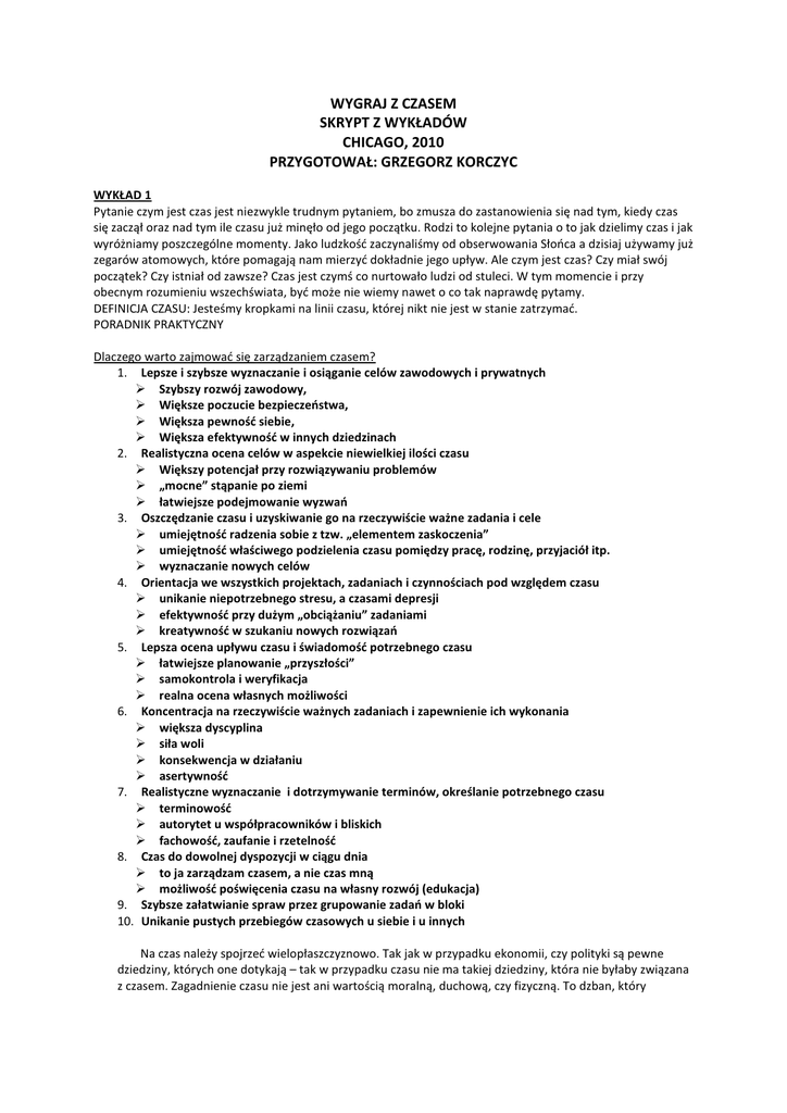 WYGRAJ Z CZASEM SKRYPT Z WYKŁADÓW CHICAGO, 2010