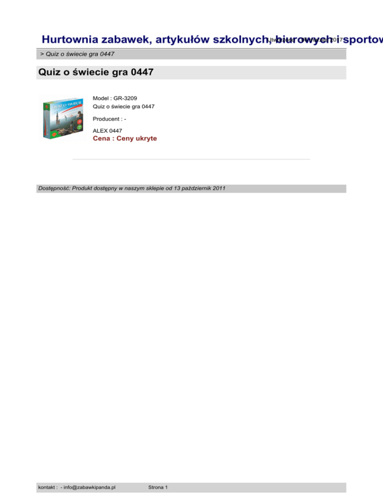 : 06 marzec 2017 Hurtownia zabawek, artykułów szkolnych,Utworzono biurowych i sportow > Quiz o świecie gra 0447 Quiz o świecie gra 0447 Model : GR-3209 Quiz o świecie gra 0447 Producent : ALEX 0447 Cena : Ceny ukryte Dostępność: Produkt dostępny w naszym sklepie od 13 październik 2011 kontakt : - [email protected] Strona 1