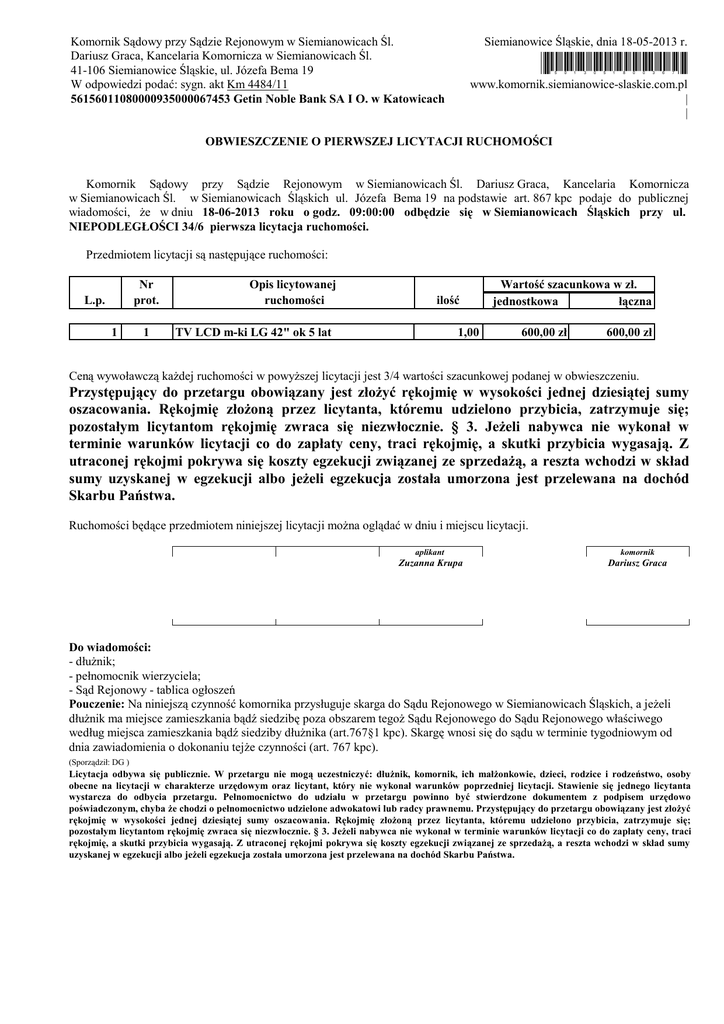 Komornik Sądowy przy Sądzie Rejonowym w Siemianowicach Śl. Dariusz Graca, Kancelaria Komornicza w Siemianowicach Śl. 41-106 Siemianowice Śląskie, ul. Józefa Bema 19 W odpowiedzi podać: sygn. akt Km 4484/11 56156011080000935000067453 Getin Noble Bank SA I O. w Katowicach Siemianowice Śląskie, dnia 18-05-2013 r. *5013051800367* www.komornik.siemianowice-slaskie.com.pl | | OBWIESZCZENIE O PIERWSZEJ LICYTACJI RUCHOMOŚCI Komornik Sądowy przy Sądzie Rejonowym w Siemianowicach Śl. Dariusz Graca, Kancelaria Komornicza w Siemianowicach Śl. w Siemianowicach Śląskich ul. Józefa Bema 19 na podstawie art. 867 kpc podaje do publicznej wiadomości, że w dniu 18-06-2013 roku o godz. 09:00:00 odbędzie się w Siemianowicach Śląskich przy ul. NIEPODLEGŁOŚCI 34/6 pierwsza licytacja ruchomości. Przedmiotem licytacji są następujące ruchomości: Nr prot. L.p. 1 1 Opis licytowanej ruchomości ilość TV LCD m-ki LG 42" ok 5 lat 1,00 Wartość szacunkowa w zł. jednostkowa łączna 600,00 zł 600,00 zł Ceną wywoławczą każdej ruchomości w powyższej licytacji jest 3/4 wartości szacunkowej podanej w obwieszczeniu. Przystępujący do przetargu obowiązany jest złożyć rękojmię w wysokości jednej dziesiątej sumy oszacowania. Rękojmię złożoną przez licytanta, któremu udzielono przybicia, zatrzymuje się; pozostałym licytantom rękojmię zwraca się niezwłocznie. § 3. Jeżeli nabywca nie wykonał w terminie warunków licytacji co do zapłaty ceny, traci rękojmię, a skutki przybicia wygasają. Z utraconej rękojmi pokrywa się koszty egzekucji związanej ze sprzedażą, a reszta wchodzi w skład sumy uzyskanej w egzekucji albo jeżeli egzekucja została umorzona jest przelewana na dochód Skarbu Państwa. Ruchomości będące przedmiotem niniejszej licytacji można oglądać w dniu i miejscu licytacji. aplikant komornik Zuzanna Krupa Dariusz Graca Do wiadomości: - dłużnik; - pełnomocnik wierzyciela; - Sąd Rejonowy - tablica ogłoszeń Pouczenie: Na niniejszą czynność komornika przysługuje skarga do Sądu Rejonowego w Siemianowicach Śląskich, a jeżeli dłużnik ma miejsce zamieszkania bądź siedzibę poza obszarem tegoż Sądu Rejonowego do Sądu Rejonowego właściwego według miejsca zamieszkania bądź siedziby dłużnika (art.767§1 kpc). Skargę wnosi się do sądu w terminie tygodniowym od dnia zawiadomienia o dokonaniu tejże czynności (art. 767 kpc). (Sporządził: DG ) Licytacja odbywa się publicznie. W przetargu nie mogą uczestniczyć: dłużnik, komornik, ich małżonkowie, dzieci, rodzice i rodzeństwo, osoby obecne na licytacji w charakterze urzędowym oraz licytant, który nie wykonał warunków poprzedniej licytacji. Stawienie się jednego licytanta wystarcza do odbycia przetargu. Pełnomocnictwo do udziału w przetargu powinno być stwierdzone dokumentem z podpisem urzędowo poświadczonym, chyba że chodzi o pełnomocnictwo udzielone adwokatowi lub radcy prawnemu. Przystępujący do przetargu obowiązany jest złożyć rękojmię w wysokości jednej dziesiątej sumy oszacowania. Rękojmię złożoną przez licytanta, któremu udzielono przybicia, zatrzymuje się; pozostałym licytantom rękojmię zwraca się niezwłocznie. § 3. Jeżeli nabywca nie wykonał w terminie warunków licytacji co do zapłaty ceny, traci rękojmię, a skutki przybicia wygasają. Z utraconej rękojmi pokrywa się koszty egzekucji związanej ze sprzedażą, a reszta wchodzi w skład sumy uzyskanej w egzekucji albo jeżeli egzekucja została umorzona jest przelewana na dochód Skarbu Państwa.