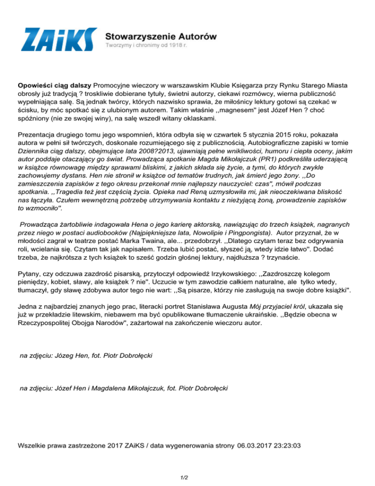 Opowieści ciąg dalszy Promocyjne wieczory w warszawskim Klubie Księgarza przy Rynku Starego Miasta obrosły już tradycją ? troskliwie dobierane tytuły, świetni autorzy, ciekawi rozmówcy, wierna publiczność wypełniająca salę. Są jednak twórcy, których nazwisko sprawia, że miłośnicy lektury gotowi są czekać w ścisku, by móc spotkać się z ulubionym autorem. Takim właśnie ,,magnesem'' jest Józef Hen ? choć spóźniony (nie ze swojej winy), na salę wszedł witany oklaskami. Prezentacja drugiego tomu jego wspomnień, która odbyła się w czwartek 5 stycznia 2015 roku, pokazała autora w pełni sił twórczych, doskonale rozumiejącego się z publicznością. Autobiograficzne zapiski w tomie Dziennika ciąg dalszy, obejmujące lata 2008?2013, ujawniają pełne wnikliwości, humoru i ciepła oceny, jakim autor poddaje otaczający go świat. Prowadząca spotkanie Magda Mikołajczuk (PR1) podkreśliła uderzającą w książce równowagę między sprawami bliskimi, z jakich składa się życie, a tymi, do których zwykle zachowujemy dystans. Hen nie stronił w książce od tematów trudnych, jak śmierć jego żony. ,,Do zamieszczenia zapisków z tego okresu przekonał mnie najlepszy nauczyciel: czas'', mówił podczas spotkania. ,,Tragedia też jest częścią życia. Opieka nad Reną uzmysłowiła mi, jak nieoczekiwana bliskość nas łączyła. Czułem wewnętrzną potrzebę utrzymywania kontaktu z nieżyjącą żoną, prowadzenie zapisków to wzmocniło''. Prowadząca żartobliwie indagowała Hena o jego karierę aktorską, nawiązując do trzech książek, nagranych przez niego w postaci audiobooków (Najpiękniejsze lata, Nowolipie i Pingpongista). Autor przyznał, że w młodości zagrał w teatrze postać Marka Twaina, ale... przedobrzył. ,,Dlatego czytam teraz bez odgrywania roli, wcielania się. Czytam tak jak napisałem. Trzeba lubić postać, słyszeć ją, wtedy idzie łatwo''. Dodać trzeba, że najkrótsza z tych książek to sześć godzin głośnej lektury, najdłuższa ? trzynaście. Pytany, czy odczuwa zazdrość pisarską, przytoczył odpowiedź Irzykowskiego: ,,Zazdroszczę kolegom pieniędzy, kobiet, sławy, ale książek ? nie''. Uczucie w tym zawodzie całkiem naturalne, ale tylko wtedy, tłumaczył, gdy sławę zdobywa autor tego nie wart: ,,Są pisarze, którzy nie zasługują na swoje dobre książki''. Jedna z najbardziej znanych jego prac, literacki portret Stanisława Augusta Mój przyjaciel król, ukazała się już w przekładzie litewskim, niebawem ma być opublikowane tłumaczenie ukraińskie. ,,Będzie obecna w Rzeczypospolitej Obojga Narodów'', zażartował na zakończenie wieczoru autor. na zdjęciu: Józeg Hen, fot. Piotr Dobrołęcki na zdjęciu: Józef Hen i Magdalena Mikołajczuk, fot. Piotr Dobrołęcki Wszelkie prawa zastrzeżone 2017 ZAiKS / data wygenerowania strony 06.03.2017 23:23:03 1/2 PDF ze strony: http://www.zaiks.org.pl/915,111 2/2