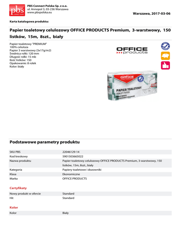 PBS Connect Polska Sp. z o.o. ul. Annopol 3, 03-236 Warszawa www.pbspolska.eu Warszawa, 2017-03-06 Karta katalogowa produktu: Papier toaletowy celulozowy OFFICE PRODUCTS Premium, 3-warstwowy, 150 listków, 15m, 8szt., biały Papier toaletowy "PREMIUM" 100% celuloza Papier 3 warstwowy (3x17g/m2) Średnica rolki: 120 mm Długość rolki: 15 mb Ilość listków: 150 Opakowanie: 8 rolek Kolor: biały Podstawowe parametry produktu SKU PBS 22046129-14 Kod kreskowy 5901503665022 Nazwa produktu Papier toaletowy celulozowy OFFICE PRODUCTS Premium, 3-warstwowy, 150 listków, 15m, 8szt., biały Kategoria Papiery toaletowe i dozowniki Klasa Ekonomiczne Marka OFFICE PRODUCTS Certyfikaty Nowy produkt w ofercie Standard Hit Standard Kolor Kolor Biały PBS Connect Polska Sp. z o.o. ul. Annopol 3, 03-236 Warszawa www.pbspolska.eu Warszawa, 2017-03-06 Karta katalogowa produktu cd. Papier toaletowy celulozowy OFFICE PRODUCTS Premium, 3-warstwowy, 150 listków, 15m, 8szt., biały Podstawowe parametry produktu Cecha Produkt Papier toaletowy Typ 3-warstwowy Rodzaj Premium W ofercie od 2015-01 Wymiary Gramatura (g/m2) 3x17 Rozmiar 8x15mb Ilość Ilość arkuszy 8x150 Wspólny słownik zamówień CPV 33761000-2 Jednostki logistyczne Opakowanie 1 10 op Opakowanie 2 220 op