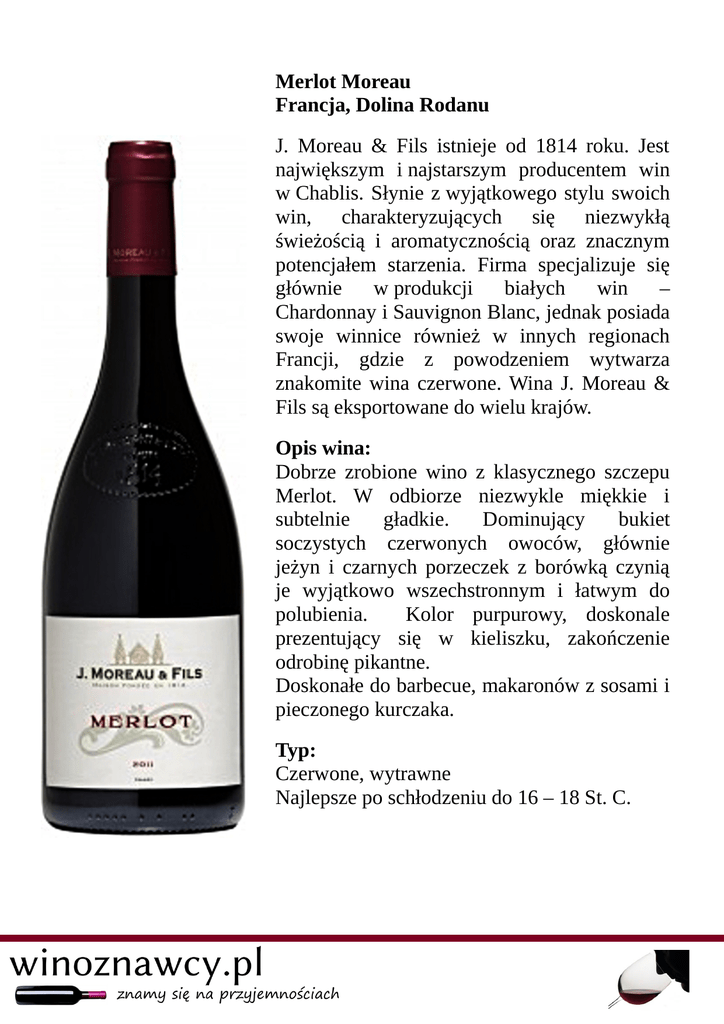 Merlot Moreau Francja, Dolina Rodanu J. Moreau & Fils istnieje od 1814 roku. Jest największym i najstarszym producentem win w Chablis. Słynie z wyjątkowego stylu swoich win, charakteryzujących się niezwykłą świeżością i aromatycznością oraz znacznym potencjałem starzenia. Firma specjalizuje się głównie w produkcji białych win – Chardonnay i Sauvignon Blanc, jednak posiada swoje winnice również w innych regionach Francji, gdzie z powodzeniem wytwarza znakomite wina czerwone. Wina J. Moreau & Fils są eksportowane do wielu krajów. Opis wina: Dobrze zrobione wino z klasycznego szczepu Merlot. W odbiorze niezwykle miękkie i subtelnie gładkie. Dominujący bukiet soczystych czerwonych owoców, głównie jeżyn i czarnych porzeczek z borówką czynią je wyjątkowo wszechstronnym i łatwym do polubienia. Kolor purpurowy, doskonale prezentujący się w kieliszku, zakończenie odrobinę pikantne. Doskonałe do barbecue, makaronów z sosami i pieczonego kurczaka. Typ: Czerwone, wytrawne Najlepsze po schłodzeniu do 16 – 18 St. C.