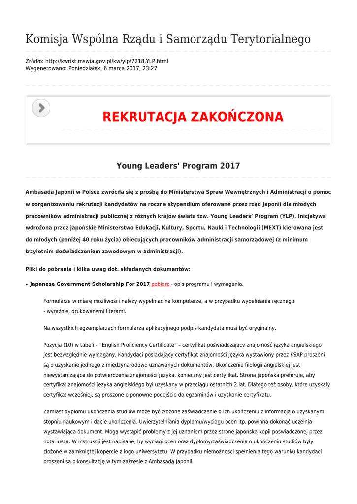 Komisja Wspólna Rządu i Samorządu Terytorialnego Źródło: http://kwrist.mswia.gov.pl/kw/ylp/7218,YLP.html Wygenerowano: Poniedziałek, 6 marca 2017, 23:27 REKRUTACJA ZAKOŃCZONA Young Leaders' Program 2017 Ambasada Japonii w Polsce zwróciła się z prośbą do Ministerstwa Spraw Wewnętrznych i Administracji o pomoc w zorganizowaniu rekrutacji kandydatów na roczne stypendium oferowane przez rząd Japonii dla młodych pracowników administracji publicznej z różnych krajów świata tzw. Young Leaders’ Program (YLP). Inicjatywa wdrożona przez japońskie Ministerstwo Edukacji, Kultury, Sportu, Nauki i Technologii (MEXT) kierowana jest do młodych (poniżej 40 roku życia) obiecujących pracowników administracji samorządowej (z minimum trzyletnim doświadczeniem zawodowym w administracji). Pliki do pobrania i kilka uwag dot. składanych dokumentów: ● Japanese Government Scholarship For 2017 pobierz - opis programu i wymagania. Formularze w miarę możliwości należy wypełniać na komputerze, a w przypadku wypełniania ręcznego - wyraźnie, drukowanymi literami. Na wszystkich egzemplarzach formularza aplikacyjnego podpis kandydata musi być oryginalny. Pozycja (10) w tabeli – “English Proficiency Certificate” – certyfikat poświadczający znajomość języka angielskiego jest bezwzględnie wymagany. Kandydaci posiadający certyfikat znajomości języka wystawiony przez KSAP proszeni są o uzyskanie jednego z międzynarodowo uznawanych dokumentów. Ukończenie filologii angielskiej jest niewystarczające do potwierdzenia znajomości języka, konieczny jest certyfikat. Strona japońska preferuje, aby certyfikat znajomości języka angielskiego był uzyskany w przeciągu ostatnich 2 lat. Dlatego też osoby, które uzyskały certyfikat wcześniej, są proszone o ponowne podejście do egzaminów i uzyskanie certyfikatu. Zamiast dyplomu ukończenia studiów może być złożone zaświadczenie o ich ukończeniu z informacją o uzyskanym stopniu naukowym i dacie ukończenia. Uwierzytelniania dyplomu/wyciągu ocen itp. powinna dokonać uczelnia wystawiająca dokument. Mogą wystąpić problemy z jej uznaniem przez stronę japońską kopii poświadczonej przez notariusza. W instrukcji jest napisane, by wyciągi ocen oraz dyplomy/zaświadczenia o ukończeniu studiów były złożone w zamkniętej kopercie z logo uniwersytetu. W przypadku niemożności spełnienia tego warunku kandydaci proszeni sa o konsultację w tym zakresie z Ambasadą Japonii. Jeżeli kandydat nie posiada ważnego paszportu, zamiast jego kopii można przedłożyć kopię dowodu osobistego. ● Application For Japanese Government Scholarship pobierz - formularz aplikacyjny. ● Essay Questions pobierz- pytania do eseju (punkt 11 z listy wymaganych dokumentów). Do napisania są dwa eseje: jeden o objętości 3 stron w dowolnym formacie - pozycja (8) w tabeli; drugi to odpowiedzi na pytania w powyższym formularzu - pozycja (11) w tabeli. ● Certificate Of Health pobierz - karta badań lekarskich - pozycji (6) w tabeli; Badania mogą być wykonane w dowolnej placówce służby zdrowia, zarówno publicznej, jak i prywatnej. ● Recommendation Form pobierz - formularz listów polecających od przełożonych; listy powinny być dwa, w tym jeden od bezpośredniego przełożonego; pozycja (5) w tabeli: „Recommendation Letter from the applicant's direct superior at work” oraz “Recommendation Letter from the applicant's superior at work, or supervising professor of the university”. ● Instrukcja dla instytucji polecającej pobierz, czyli jednej z organizacji samorządowych (Unii Metropolii Polskich, Unii Miasteczek Polskich, Związku Miast Polskich, Związku Województw RP, Związku Gmin Wiejskich RP, Związku Powiatów Polskich). Organizacja wystawia – w dowolnej formie – jeden list rekomendujący dla każdego z kandydatów; dot. pozycji (4) w tabeli. ● Dodatkowo każdy kandydat powinien do dokumentów dołączyć Oświadczenie pobierz (w jednym egzemplarzu). Wszystkie wymagane dokumenty przygotowane w języku angielskim oraz ponumerowane zgodnie z instrukcją i posegregowane w oddzielne zestawy (1 zestaw oryginałów i 4 zestawy kopii) powinny zostać dostarczone przez organizacje samorządowe do KWRiST do 10 października br. (decyduje data wpływu). Wydział Kultury i Edukacji Ambasady Japonii w Polsce www.pl.emb-japan.go.jp National Graduate Institute for Policy Studies w Tokio www.grips.ac.jp Starsze wersje dokumentu Wstecz Drukuj Generuj PDF Powiadom znajomego