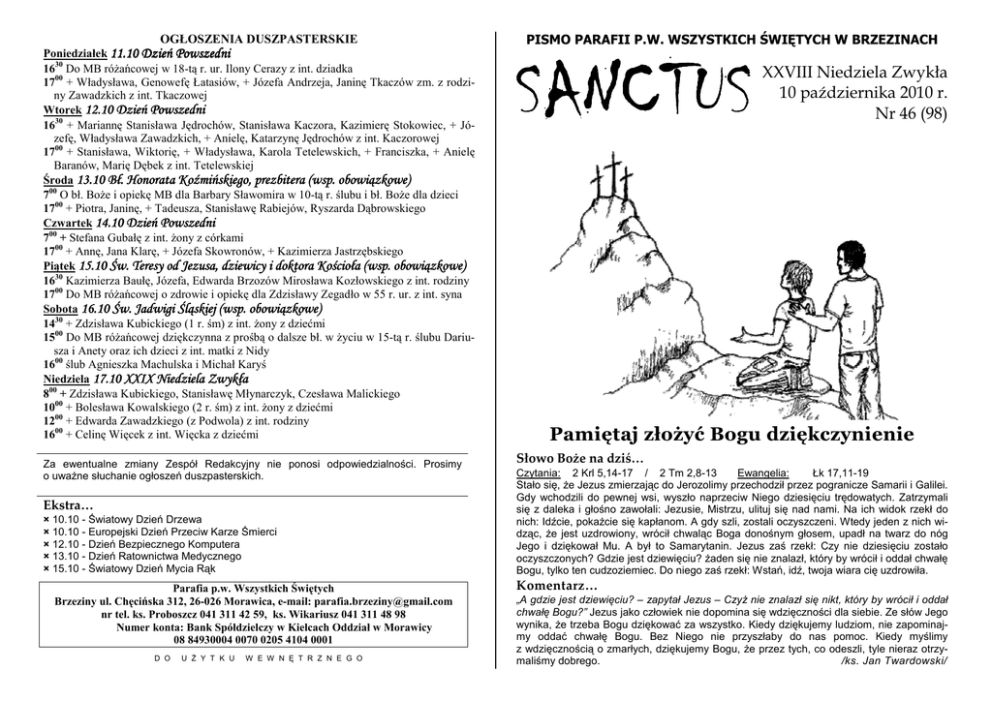 OGŁOSZENIA DUSZPASTERSKIE Poniedziałek 11.10 Dzień Powszedni 1630 Do MB różańcowej w 18-tą r. ur. Ilony Cerazy z int. dziadka 1700 + Władysława, Genowefę Łatasiów, + Józefa Andrzeja, Janinę Tkaczów zm. z rodziny Zawadzkich z int. Tkaczowej Wtorek 12.10 Dzień Dzień Powszedni 1630 + Mariannę Stanisława Jędrochów, Stanisława Kaczora, Kazimierę Stokowiec, + Józefę, Władysława Zawadzkich, + Anielę, Katarzynę Jędrochów z int. Kaczorowej 1700 + Stanisława, Wiktorię, + Władysława, Karola Tetelewskich, + Franciszka, + Anielę Baranów, Marię Dębek z int. Tetelewskiej Środa 13.10 Bł. Honorata Koźmińskiego, prezbitera (wsp. obowiązkowe) 700 O bł. Boże i opiekę MB dla Barbary Sławomira w 10-tą r. ślubu i bł. Boże dla dzieci 1700 + Piotra, Janinę, + Tadeusza, Stanisławę Rabiejów, Ryszarda Dąbrowskiego Czwartek 14.10 Dzień Powszedni 700 + Stefana Gubałę z int. żony z córkami 1700 + Annę, Jana Klarę, + Józefa Skowronów, + Kazimierza Jastrzębskiego Piątek 15.10 Św. Teresy od Jezusa, dziewicy i doktora Kościoła (wsp. obowiązkowe) 1630 Kazimierza Baułę, Józefa, Edwarda Brzozów Mirosława Kozłowskiego z int. rodziny 1700 Do MB różańcowej o zdrowie i opiekę dla Zdzisławy Zegadło w 55 r. ur. z int. syna Sobota 16.10 Św. Jadwigi Śląskiej (wsp. obowiązkowe) 1430 + Zdzisława Kubickiego (1 r. śm) z int. żony z dziećmi 1500 Do MB różańcowej dziękczynna z prośbą o dalsze bł. w życiu w 15-tą r. ślubu Dariusza i Anety oraz ich dzieci z int. matki z Nidy 1600 ślub Agnieszka Machulska i Michał Karyś Niedziela 17.10 XXIX Niedziela Zwykła 800 + Zdzisława Kubickiego, Stanisławę Młynarczyk, Czesława Malickiego 1000 + Bolesława Kowalskiego (2 r. śm) z int. żony z dziećmi 1200 + Edwarda Zawadzkiego (z Podwola) z int. rodziny 1600 + Celinę Więcek z int. Więcka z dziećmi Za ewentualne zmiany Zespół Redakcyjny nie ponosi odpowiedzialności. Prosimy o uważne słuchanie ogłoszeń duszpasterskich. Ekstra… × 10.10 - Światowy Dzień Drzewa × 10.10 - Europejski Dzień Przeciw Karze Śmierci × 12.10 - Dzień Bezpiecznego Komputera × 13.10 - Dzień Ratownictwa Medycznego × 15.10 - Światowy Dzień Mycia Rąk Parafia p.w. Wszystkich Świętych Brzeziny ul. Chęcińska 312, 26-026 Morawica, e-mail: [email protected] nr tel. ks. Proboszcz 041 311 42 59, ks. Wikariusz 041 311 48 98 Numer konta: Bank Spółdzielczy w Kielcach Oddział w Morawicy 08 84930004 0070 0205 4104 0001 D O U Ż Y T K U W E W N Ę T R Z N E G O PISMO PARAFII P.W. WSZYSTKICH ŚWIĘTYCH W BRZEZINACH SANC SANCTUS XXVIII Niedziela Zwykła 10 października 2010 r. Nr 46 (98) Pamiętaj złożyć Bogu dziękczynienie Słowo Boże na dziś… Czytania: 2 Krl 5,14-17 / 2 Tm 2,8-13 Ewangelia: Łk 17,11-19 Stało się, że Jezus zmierzając do Jerozolimy przechodził przez pogranicze Samarii i Galilei. Gdy wchodzili do pewnej wsi, wyszło naprzeciw Niego dziesięciu trędowatych. Zatrzymali się z daleka i głośno zawołali: Jezusie, Mistrzu, ulituj się nad nami. Na ich widok rzekł do nich: Idźcie, pokażcie się kapłanom. A gdy szli, zostali oczyszczeni. Wtedy jeden z nich widząc, że jest uzdrowiony, wrócił chwaląc Boga donośnym głosem, upadł na twarz do nóg Jego i dziękował Mu. A był to Samarytanin. Jezus zaś rzekł: Czy nie dziesięciu zostało oczyszczonych? Gdzie jest dziewięciu? żaden się nie znalazł, który by wrócił i oddał chwałę Bogu, tylko ten cudzoziemiec. Do niego zaś rzekł: Wstań, idź, twoja wiara cię uzdrowiła. Komentarz… „A gdzie jest dziewięciu? – zapytał Jezus – Czyż nie znalazł się nikt, który by wrócił i oddał chwałę Bogu?” Jezus jako człowiek nie dopomina się wdzięczności dla siebie. Ze słów Jego wynika, że trzeba Bogu dziękować za wszystko. Kiedy dziękujemy ludziom, nie zapominajmy oddać chwałę Bogu. Bez Niego nie przyszłaby do nas pomoc. Kiedy myślimy z wdzięcznością o zmarłych, dziękujemy Bogu, że przez tych, co odeszli, tyle nieraz otrzymaliśmy dobrego. /ks. Jan Twardowski/ A w parafii… Boży człowiek… - św. Małgorzata Maria Alacoque (14 października) ▪ Dziś na Mszy Świętej o godz. 16:00 odbędzie się poświęcenie różańców dla dzieci komunijnych ▪ 3 października rozpoczął się kurs przedmałżeński w parafii Bilcza. Spotkania co niedziela po Mszy Św. o godz. 16:00. Chętnych zapraszamy ▪ Pragniemy serdecznie poinformować, że z okazji 100 numeru SANCTUSA przygotowujemy dla Państwa konkurs. Kupon konkursowy wraz z regulaminem będzie dołączony do jubileuszowego numeru naszego pisma. Przewidziane atrakcyjne nagrody. Małgorzata Maria Alacoque przyszła na świat jako piąte dziecko w rodzinie Klaudiusza z Verosvres, notariusza i sędziego królewskiego. Po trzech dniach została ochrzczona, a podczas obrzędu nadano jej imię Małgorzata. W wieku czterech lat złożyła ślub dozgonnej czystości. Kiedy miała osiem lat, zmarł jej ojciec, zostawiając pod opieką żony siedmioro dzieci. Po śmierci ojca Małgorzata trafiła do kolegium w Charolles, prowadzonego przez siostry zakonne. Z powodu ciężkiej choroby musiała powrócić do domu. Trafiła na wychowanie do swych krewnych – surowego wuja i zgorzkniałych ponoć ciotek, od których cierpiała wiele przykrości. Choroba Małgorzaty ciągnęła się przez cztery lata, które upływały pod znakiem duchowego wzrastania. Dziewczyna chciała poświęcić swoje życie służbie zakonnej, ale ze względu na obowiązek pomocy w domu swoich opiekunów nie mogła pójść do klasztoru tak szybko, jak tego chciała. Wreszcie 25 maja 1671 r., w wieku 24 lat, wstąpiła do klasztoru Sióstr Nawiedzenia w Paray-le-Monial. Habit zakonny otrzymała 25 sierpnia tego samego roku. Już w początkowym okresie swego życia zakonnego doświadczała osobistych spotkań z Jezusem Chrystusem, który przekazał jej zadanie niesienia ludziom posłannictwa o Jego Najświętszym Sercu. Podcz