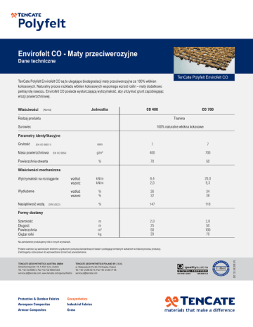 Envirofelt CO - Maty przeciwerozyjne Dane techniczne TenCate Polyfelt Envirofelt CO TenCate Polyfelt Envirofelt CO s¹ to ulegaj¹ce biodegradacji maty przeciwerozyjne ze 100% w³ókien kokosowych. Naturalny proces rozk³adu w³ókien kokosowych wspomaga wzrost roœlin – maty dodatkowo pe³ni¹ rolê nawozu. Envirofelt CO posiada wystarczaj¹c¹ wytrzyma³oœæ, aby utrzymaæ grunt zapobiegaj¹c erozji powierzchniowej. W³aœciwoœci Jednostka [Norma] CO 400 CO 700 Tkanina Rodzaj produktu 100% naturalne w³ókna kokosowe Surowiec Parametry identyfikacyjne Gruboœæ [EN ISO 9863-1] Masa powierzchniowa [EN ISO 9864] Powierzchnia otwarta mm 7 7 g/m² 400 700 % 70 50 W³aœciwoœci mechaniczne Wytrzyma³oœæ na rozci¹ganie wzd³u¿ wszerz kN/m kN/m 6,4 2,0 20,0 9,3 Wyd³u¿enie wzd³u¿ wszerz % % 26 32 34 38 % 147 116 m m m² kg 2,0 25 50 20 2,0 50 100 70 Nasi¹kliwoœæ wod¹ [DIN 53923] Formy dostawy Szerokoœæ D³ugoœæ Powierzchnia Ciê¿ar rolki Na zamówienie produkujemy rolki o innych wymiarach. TENCATE GEOSYNTHETICS AUSTRIA GMBH Schachermayerstr. 18, A-4021 Linz, Austria Tel. +43 732 6983 0, Fax +43 732 6983 5353 [email protected], www.tencate.com/geosynthetics TENCATE GEOSYNTHETICS POLAND SP. Z O.O. ul. Wadowicka 6, PL-30-415 Kraków, Poland Tel. +48 12 268 83 75, Fax +48 12 263 77 58 [email protected] Protective & Outdoor Fabrics Geosynthetics Aerospace Composites Industrial Fabrics Armour Composites Grass 502 133 | 08.2008 | PL Podane wartoœci s¹ wartoœciami œrednimi uzyskanymi podczas standardowych badañ i podlegaj¹ normalnym wahaniom w trakcie procesu produkcji. Zastrzegamy sobie prawo do wprowadzania zmian bez powiadamiania.