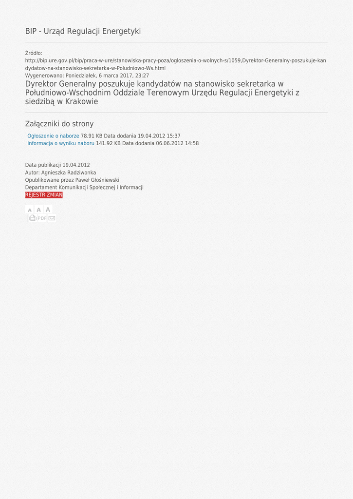 BIP - Urząd Regulacji Energetyki Źródło: http://bip.ure.gov.pl/bip/praca-w-ure/stanowiska-pracy-poza/ogloszenia-o-wolnych-s/1059,Dyrektor-Generalny-poszukuje-kan dydatow-na-stanowisko-sekretarka-w-Poludniowo-Ws.html Wygenerowano: Poniedziałek, 6 marca 2017, 23:27 Dyrektor Generalny poszukuje kandydatów na stanowisko sekretarka w Południowo-Wschodnim Oddziale Terenowym Urzędu Regulacji Energetyki z siedzibą w Krakowie Załączniki do strony Ogłoszenie o naborze 78.91 KB Data dodania 19.04.2012 15:37 Informacja o wyniku naboru 141.92 KB Data dodania 06.06.2012 14:58 Data publikacji 19.04.2012 Autor: Agnieszka Radziwonka Opublikowane przez Paweł Głośniewski Departament Komunikacji Społecznej i Informacji REJESTR ZMIAN