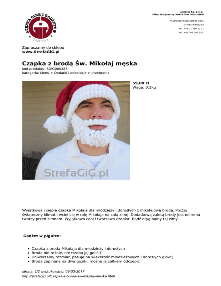 Jammas Sp. Z o.o. Sklep stacjonarny Strefa Gier i Gadżetów Al. Jerzego Waszyngtona 100A 04-015 Warszawa tel. +48 22 250 20 21 tel. +48 793 097 555 Zapraszamy do sklepu www.StrefaGiG.pl Czapka z brodą Św. Mikołaj męska kod produktu: SGiG000383 kategoria: Menu > Dodatki i dekoracje > przebrania 59,00 zł Waga: 0.1kg Wyjątkowa i ciepła czapka Mikołaja dla młodzieży i dorosłych z mikołajową brodą. Poczuj świąteczny klimat i wciel się w rolę Mikołaja na całą zimę. Dodatkową zaletą brody jest ochrona twarzy przed zimnem. Wyjątkowo cool i twarzowa czapka! Bądź oryginalny tej zimy. Gadżet w pigułce: Czapka z brodą Mikołaja dla młodzieży i dorosłych Broda nie rośnie, nie trzeba jej golić;) Uniwersalny rozmiar, pasuje na większość młodzieżowych i dorosłych głów:) Broda zapinana na dwa guziki, można ją całkiem odczepić strona: 1/2 wydrukowano: 06-03-2017 http://strefagig.pl/czapka-z-broda-sw-mikolaj-meska.html Wykonana ręcznie z miękkiej i przyjemnej w dotyku wełny Kolory czapki, jak na zdjęciu: czerwono-biała + biała broda strona: 2/2 wydrukowano: 06-03-2017 http://strefagig.pl/czapka-z-broda-sw-mikolaj-meska.html