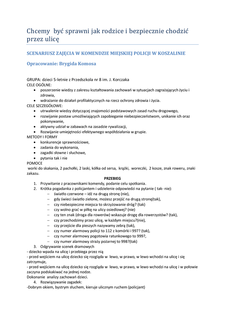Chcemy byc sprawni jak rodzice i bezpiecznie chodzic przez ulicę SCENARIUSZ ZAJĘCIA W KOMENDZIE MIEJSKIEJ POLICJI W KOSZALINIE Opracowanie: Brygida Komosa GRUPA: dzieci 5-letnie z Przedszkola nr 8 im. J. Korczaka CELE OGÓLNE: poszerzenie wiedzy z zakresu kształtowania zachowań w sytuacjach zagrażających życiu i zdrowia, wdrażanie do działań profilaktycznych na rzecz ochrony zdrowia i życia. CELE SZCZEGÓŁOWE: utrwalenie wiedzy dotyczącej znajomości podstawowych zasad ruchu drogowego, rozwijanie postaw umożliwiających zapobieganie niebezpieczeństwom, unikanie ich oraz pokonywanie, aktywny udział w zabawach na zasadzie rywalizacji, Rozwijanie umiejętności efektywnego współdziałania w grupie. METODY I FORMY konkurencje sprawnościowe, zadania do wykonania, zagadki słowne i słuchowe, pytania tak i nie POMOCE worki do skakania, 2 pachołki, 2 laski, kółka od sersa, krążki, woreczki, 2 kosze, znak roweru, znaki zakazu. PRZEBIEG 1. Przywitanie z pracownikami komendy, podanie celu spotkania. 2. Krótka pogadanka z policjantem i udzielenie odpowiedzi na pytanie ( tak- nie): światło czerwone – idź na drugą stronę (nie), gdy świeci światło zielone, możesz przejść na drugą stronę(tak), czy niebezpieczne miejsca to skrzyżowanie dróg? (tak) czy wolno grać w piłkę na ulicy osiedlowej? (nie) czy ten znak (droga dla rowerów) wskazuje drogę dla rowerzystów? (tak), czy przechodzimy przez ulicę, w każdym miejscu?(nie), czy przejście dla pieszych nazywamy zebrą (tak), czy numer alarmowy policji to 112 z komórki i 997? (tak), czy numer alarmowy pogotowia ratunkowego to 999?, czy numer alarmowy straży pożarnej to 998?(tak) 3. Odgrywanie scenek dramowych - dziecko wpada na ulicę i przebiega przez nią - przed wejściem na ulicę dziecko się rozgląda w lewo, w prawo, w lewo wchodzi na ulicę i się zatrzymuje, - przed wejściem na ulicę dziecko się rozgląda w lewo, w prawo, w lewo wchodzi na ulicę i w połowie zaczyna podskakiwać na jednej nodze. Dokonanie analizy zachowań dzieci. 4. Rozwiązywanie zagadek: -Dobrym okiem, bystrym słuchem, kieruje ulicznym ruchem (policjant) - Składam się z kierownicy, ramy i kół z oponami, może na mnie jechać człowiek, ruszając nogami (rower) - Całe okrągłe z czerwoną obwódką – jaki to znak? Kto odpowie krótko?) - Idzie ulicą dziecko chwat, a na ulicy stoi znak: okrągła tarcza z obwódką czerwoną, na niej stojący człowiek. Co to oznacza? Kto odpowie? (nie wolno poruszać się w takich miejscach) 5. Zawody sportowe Bieg w workach – do pachołka i powrót do drużyny Samochody – kierowanie slalomem samochodem do wyznaczonego punktu, przekazanie kierownicy kolejnej osobie rzut do celu – trafienie do kosza woreczkiem podrzut piłką dwa razy zaklaskać i złapać, czworakowanie pod stołem, bieg do pachołka, powrót biegiem do drużyny, czworakowanie pod stołem, bieg do pachołka, w drodze powrotnej przejście przez szarfę i powrót do drużyny, Bieg do pachołka, rzut woreczkiem do kosza, biegiem powrót do drużyny. 6. Spotkanie z Misiem – Policjantem – rozmowa o bezpieczeństwie podczas pobytu w lesie. Źródło: 1. bliżej przedszkola nr 7-8.142-3magazyn specjalny 2013 Opracowała: Brygida Komosa