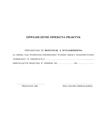 OŚWIADCZENIE OPIEKUNA PRAKTYK OŚWIADCZAM, ŻE REZYGNUJĘ Z WYNAGRODZENIA ZA OPIEKĘ NAD STUDENTEM POWSZECHNEJ WYŻSZEJ SZKOŁY HUMANISTYCZNEJ „POMERANIA” W CHOJNICACH, P. …………………………………………………...................... ODBYWAJĄCYM PRAKTYKĘ W TERMINIE OD ……………………. DO ……………………. ……………………………….... Miejscowość, data ..….………………………………. Imię i nazwisko Opiekuna praktyk