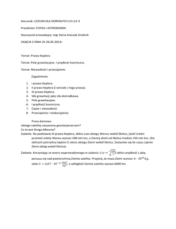 Kierunek: LICEUM DLA DOROSŁYCH LO L12-3 Przedmiot: FIZYKA I ASTRONOMIA Nauczyciel prowadzący: mgr Daria Antczak-Drobnik ZAJĘCIA Z DNIA 25-26.05.2013r. Temat: Prawa Keplera. Temat: Pole grawitacyjne. I prędkość kosmiczna. Temat: Nieważkość i przeciążenie. Zagadnienia: 1. 2. 3. 4. 5. 6. 7. 8. I prawo Keplera. II prawo Keplera (i wnioski z tego prawa). III prawo Keplera. Siła grawitacji jako siła dośrodkowa. Pole grawitacyjne. I prędkość kosmiczna. Ciężar i nieważkość. Przeciążenie i niedociążenie. Praca domowa Jakiego satelitę nazywamy geostacjonarnym? Co to jest Droga Mleczna? Zadanie. Na podstawie III prawa Keplera, oblicz czas obiegu Wenus wokół Słońca, jeżeli średni promień orbity Wenus wynosi 108 mln km, a Ziemię dzieli od Słońca średnio 150 mln km. (Do obliczeń potrzebny będzie Ci okres obiegu Ziemi wokół Słońca. Zastanów się ile czasu zajmie Ziemi obieg wokół Słońca). Zadanie. Korzystając ze wzoru wyprowadzonego w zadaniu 1 ( ) oblicz prędkość z jaką porusza się nad powierzchnią Ziemia satelita. Przyjmij, że masa Ziemi wynosi: stała , a odległość Ziemia satelita wynosi 6400 km. ,
