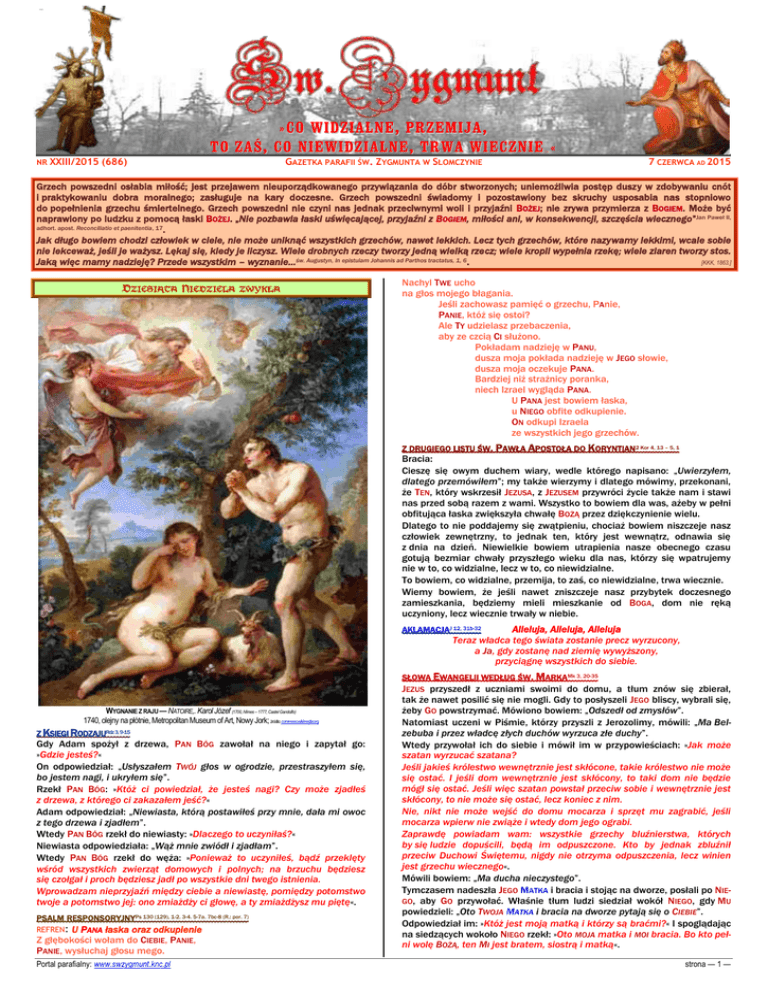WIDZIALNE, PRZEMIJA, TO ZAŚ, CO NIEWIDZIALNE, TRWA WIECZNIE »CO NR XXIII/2015 (686) … « GAZETKA PARAFII ŚW. ZYGMUNTA W SŁOMCZYNIE 7 CZERWCA AD 2015 Grzech powszedni osłabia miłość; jest przejawem nieuporządkowanego przywiązania do dóbr stworzonych; uniemożliwia postęp duszy w zdobywaniu cnót i praktykowaniu dobra moralnego; zasługuje na kary doczesne. Grzech powszedni świadomy i pozostawiony bez skruchy usposabia nas stopniowo do popełnienia grzechu śmiertelnego. Grzech powszedni nie czyni nas jednak przeciwnymi woli i przyjaźni BOŻEJ; nie zrywa przymierza z BOGIEM. Może być naprawiony po ludzku z pomocą łaski BOŻEJ. „Nie pozbawia łaski uświęcającej, przyjaźni z BOGIEM, miłości ani, w konsekwencji, szczęścia wiecznego”Jan Paweł II, adhort. apost. Reconciliatio et paenitentia, 17. Jak długo bowiem chodzi człowiek w ciele, nie może uniknąć wszystkich grzechów, nawet lekkich. Lecz tych grzechów, które nazywamy lekkimi, wcale sobie nie lekceważ, jeśli je ważysz. Lękaj się, kiedy je liczysz. Wiele drobnych rzeczy tworzy jedną wielką rzecz; wiele kropli wypełnia rzekę; wiele ziaren tworzy stos. Jaką więc mamy nadzieję? Przede wszystkim – wyznanie…św. Augustyn, In epistulam Johannis ad Parthos tractatus, 1, 6. [KKK, 1863.] DZIESIĄTA NIEDZIELA ZWYKŁA Nachyl TWE ucho na głos mojego błagania. Jeśli zachowasz pamięć o grzechu, PAnie, PANIE, któż się ostoi? Ale TY udzielasz przebaczenia, aby ze czcią CI służono. Pokładam nadzieję w PANU, dusza moja pokłada nadzieję w JEGO słowie, dusza moja oczekuje PANA. Bardziej niż strażnicy poranka, niech Izrael wygląda PANA. U PANA jest bowiem łaska, u NIEGO obfite odkupienie. ON odkupi Izraela ze wszystkich jego grzechów. Z DRUGIEGO LISTU ŚW. PAWŁA APOSTOŁA DO KORYNTIAN2 Kor 4, 13 – 5, 1 Bracia: Cieszę się owym duchem wiary, wedle którego napisano: „Uwierzyłem, dlatego przemówiłem”; my także wierzymy i dlatego mówimy, przekonani, że TEN, który wskrzesił JEZUSA, z JEZUSEM przywróci życie także nam i stawi nas przed sobą razem z wami. Wszystko to bowiem dla was, ażeby w pełni obfitująca łaska zwiększyła chwałę BOŻĄ przez dziękczynienie wielu. Dlatego to nie poddajemy się zwątpieniu, chociaż bowiem niszczeje nasz człowiek zewnętrzny, to jednak ten, który jest wewnątrz, odnawia się z dnia na dzień. Niewielkie bowiem utrapienia nasze obecnego czasu gotują bezmiar chwały przyszłego wieku dla nas, którzy się wpatrujemy nie w to, co widzialne, lecz w to, co niewidzialne. To bowiem, co widzialne, przemija, to zaś, co niewidzialne, trwa wiecznie. Wiemy bowiem, że jeśli nawet zniszczeje nasz przybytek doczesnego zamieszkania, będziemy mieli mieszkanie od BOGA, dom nie ręką uczyniony, lecz wiecznie trwały w niebie. Alleluja, Alleluja, Alleluja Teraz władca tego świata zostanie precz wyrzucony, a Ja, gdy zostanę nad ziemię wywyższony, przyciągnę wszystkich do siebie. AKLAMACJAJ 12, 31b-32 SŁOWA EWANGELII WEDŁUG ŚW. MARKAMk 3, 20-35 WYGNANIE Z RAJU — NATOIRE,. Karol Józef (1700, Nîmes – 1777, Castel Gandolfo) 1740, olejny na płótnie, Metropolitan Museum of Art, Nowy Jork; źródło: commons.wikimedia.org Z KSIĘGI RODZAJURdz 3, 9-15 Gdy Adam spożył z drzewa, PAN BÓG zawołał na niego i zapytał go: »Gdzie jesteś?« On odpowiedział: „Usłyszałem TWÓJ głos w ogrodzie, przestraszyłem się, bo jestem nagi, i ukryłem się”. Rzekł PAN BÓG: »Któż ci powiedział, że jesteś nagi? Czy może zjadłeś z drzewa, z którego ci zakazałem jeść?« Adam odpowiedział: „Niewiasta, którą postawiłeś przy mnie, dała mi owoc z tego drzewa i zjadłem”. Wtedy PAN BÓG rzekł do niewiasty: »Dlaczego to uczyniłaś?« Niewiasta odpowiedziała: „Wąż mnie zwiódł i zjadłam”. Wtedy PAN BÓG rzekł do węża: »Ponieważ to uczyniłeś, bądź przeklęty wśród wszystkich zwierząt domowych i polnych; na brzuchu będziesz się czołgał i proch będziesz jadł po wszystkie dni twego istnienia. Wprowadzam nieprzyjaźń między ciebie a niewiastę, pomiędzy potomstwo twoje a potomstwo jej: ono zmiażdży ci głowę, a ty zmiażdżysz mu piętę«. PSALM RESPONSORYJNYPs 130 (129), 1-2. 3-4. 5-7a. 7bc-8 (R.: por. 7) REFREN: U PANA łaska oraz odkupienie Z głębokości wołam do CIEBIE, PANIE, PANIE, wysłuchaj głosu mego. Portal parafialny: www.swzygmunt.knc.pl JEZUS przyszedł z uczniami swoimi do domu, a tłum znów się zbierał, tak że nawet posilić się nie mogli. Gdy to posłyszeli JEGO bliscy, wybrali się, żeby GO powstrzymać. Mówiono bowiem: „Odszedł od zmysłów”. Natomiast uczeni w Piśmie, którzy przyszli z Jerozolimy, mówili: „Ma Belzebuba i przez władcę złych duchów wyrzuca złe duchy”. Wtedy przywołał ich do siebie i mówił im w przypowieściach: »Jak może szatan wyrzucać szatana? Jeśli jakieś królestwo wewnętrznie jest skłócone, takie królestwo nie może się ostać. I jeśli dom wewnętrznie jest skłócony, to taki dom nie będzie mógł się ostać. Jeśli więc szatan powstał przeciw sobie i wewnętrznie jest skłócony, to nie może się ostać, lecz koniec z nim. Nie, nikt nie może wejść do domu mocarza i sprzęt mu zagrabić, jeśli mocarza wpierw nie zwiąże i wtedy dom jego ograbi. Zaprawdę powiadam wam: wszystkie grzechy bluźnierstwa, których by się ludzie dopuścili, będą im odpuszczone. Kto by jednak zbluźnił przeciw Duchowi Świętemu, nigdy nie otrzyma odpuszczenia, lecz winien jest grzechu wiecznego«. Mówili bowiem: „Ma ducha nieczystego”. Tymczasem nadeszła JEGO MATKA i bracia i stojąc na dworze, posłali po NIEGO, aby GO przywołać. Właśnie tłum ludzi siedział wokół NIEGO, gdy MU powiedzieli: „Oto TWOJA MATKA i bracia na dworze pytają się o CIEBIE”. Odpowiedział im: »Któż jest moją matką i którzy są braćmi?« I spoglądając na siedzących wokoło NIEGO rzekł: »Oto MOJA matka i MOI bracia. 