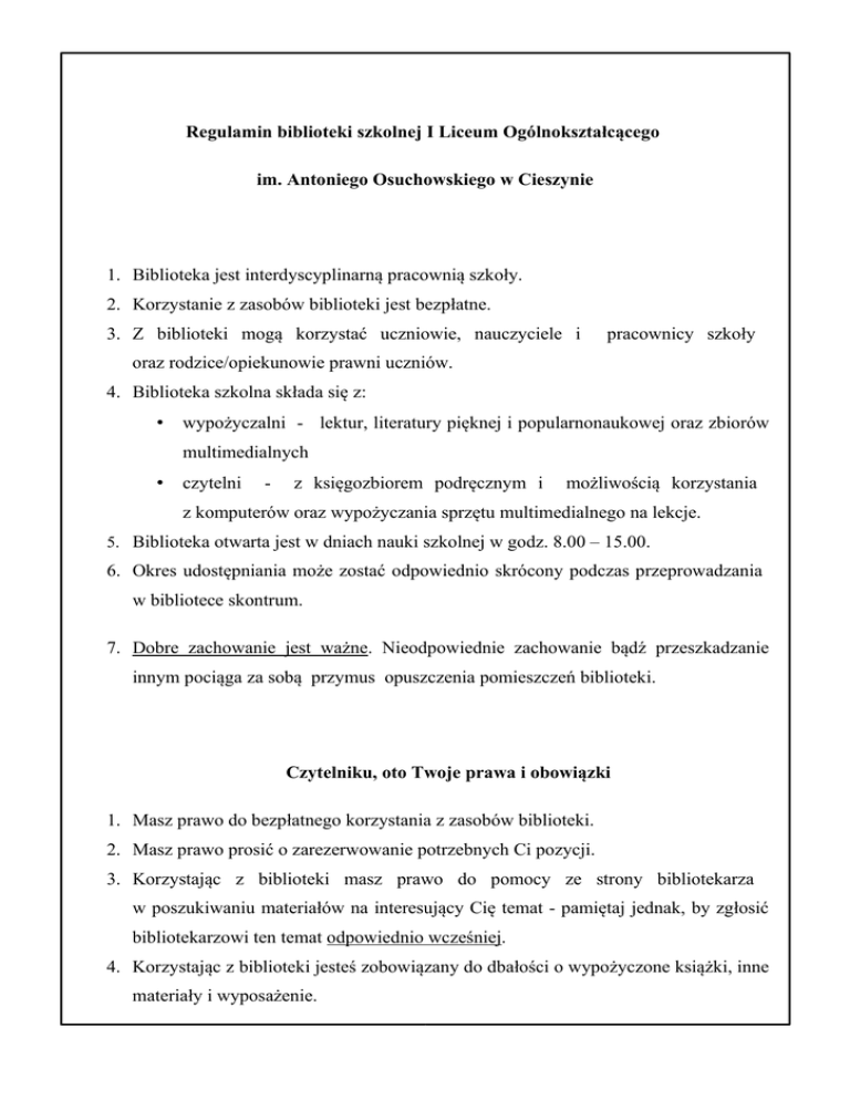 Regulamin biblioteki szkolnej I Liceum Ogólnokształcącego im. Antoniego Osuchowskiego w Cieszynie 1. Biblioteka jest interdyscyplinarną pracownią szkoły. 2. Korzystanie z zasobów biblioteki jest bezpłatne. 3. Z biblioteki mogą korzystać uczniowie, nauczyciele i pracownicy szkoły oraz rodzice/opiekunowie prawni uczniów. 4. Biblioteka szkolna składa się z: • wypożyczalni - lektur, literatury pięknej i popularnonaukowej oraz zbiorów multimedialnych • czytelni - z księgozbiorem podręcznym i możliwością korzystania z komputerów oraz wypożyczania sprzętu multimedialnego na lekcje. 5. Biblioteka otwarta jest w dniach nauki szkolnej w godz. 8.00 – 15.00. 6. Okres udostępniania może zostać odpowiednio skrócony podczas przeprowadzania w bibliotece skontrum. 7. Dobre zachowanie jest ważne. Nieodpowiednie zachowanie bądź przeszkadzanie innym pociąga za sobą przymus opuszczenia pomieszczeń biblioteki. Czytelniku, oto Twoje prawa i obowiązki 1. Masz prawo do bezpłatnego korzystania z zasobów biblioteki. 2. Masz prawo prosić o zarezerwowanie potrzebnych Ci pozycji. 3. Korzystając z biblioteki masz prawo do pomocy ze strony bibliotekarza w poszukiwaniu materiałów na interesujący Cię temat - pamiętaj jednak, by zgłosić bibliotekarzowi ten temat odpowiednio wcześniej. 4. Korzystając z biblioteki jesteś zobowiązany do dbałości o wypożyczone książki, inne materiały i wyposażenie. 5. Aby uniknąć nieporozumień, osobiście wypożyczaj interesujące cię książki i inne materiały na podstawie legitymacji szkolnej lub dowodu osobistego. 6. Jesteś odpowiedzialny finansowo za książki, inne materiały biblioteczne i sprzęt z których korzystasz. 7. Jeśli zgubisz lub zniszczysz wypożyczone książki, inne materiały, bądź sprzęt, jesteś zobowiązany do odkupienia ich lub zwrócenia wskazanego przez bibliotekarza ekwiwalentu. 8. Jeśli opuszczasz naszą szkołę (uczniowie, pracownicy), jesteś zobowiązany do pobrania z biblioteki zaświadczenia potwierdzającego zwrot wypożyczonych książek i materiałów. 9. Każdy czytelnik, również TY, ma prawo udzielania się w wolontariacie bibliotecznym. A teraz poznaj zasady korzystania z wypożyczalni, czytelni i komputerów WYPOŻYCZALNIA 1. Jednorazowo możesz wypożyczyć 5 książek na 1 miesiąc. Pamiętaj o tym, że istnieje możliwość przedłużenia terminu na dalsze 2 tygodnie, jeśli te materiały nie są potrzebne innym czytelnikom. Biblioteka zastrzega sobie prawo do skrócenia czasu wypożyczenia. 2. Staraj się oddać jak najszybciej wypożyczone przez Ciebie książki i inne materiały, by także mogli z nich skorzystać inni czytelnicy. 3. Pamiętaj, że wszystkie wypożyczone przez ciebie książki, czasopisma i inne materiały muszą być zwrócone przed końcem roku szkolnego. CZYTELNIA 1. Czytelnia jest miejscem cichej pracy. 2. Mogą korzystać z niej wszyscy czytelnicy. Jednakże informujemy, że ilość miejsc jest ograniczona. 3. Korzystając z czytelni, masz obowiązek wpisania się do zeszytu odwiedzin. 4. W naszej czytelni umożliwiamy wolny dostęp do półek. 5. Bibliotekarz ma prawo (a nawet obowiązek) sprawdzić, czy przebywając w czytelni, nie powinieneś być w tym czasie na lekcji. 6. Z księgozbioru podręcznego oraz czasopism skorzystasz wyłącznie na miejscu. Jednak za zgodą bibliotekarza możesz wypożyczyć je na lekcję. Istnieje też możliwość wypożyczenia na dobę - tzn. tuż przed zamknięciem czytelni do rana następnego dnia - lub na weekend. KORZYSTANIE Z KOMPUTERÓW 1. W czytelni umożliwiamy dostęp do komputerów stacjonarnych i laptopów - laptopy udostępniane są na podstawie legitymacji szkolnej jedynie na miejscu, nie ma możliwości wypożyczeń ich do domu. 2. Pamiętaj, że komputery w bibliotece szkolnej służą wyłącznie celom edukacyjnym. 3. Praca przy komputerze jest możliwa po otrzymaniu zgody nauczyciela bibliotekarza, po zapoznaniu się z regulaminem i wpisaniu się do „Zeszytu korzystających z komputera”. 4. Twój czytelny wpis w „Zeszycie korzystających z komputera” (imię i nazwisko, klasa, data, lekcja i tematyka) jest przez nas traktowany jako zobowiązanie do przestrzegania niniejszych zasad. 5. Przy komputerze może znajdować się 1 osoba. Dla bezpieczeństwa Twojego i komputera, przy którym pracujesz, nie spożywaj napojów i posiłków podczas korzystania z komputera. 6. Możesz korzystać tylko z zainstalowanych programów. Nie wolno instalować innych programów i dokonywać zmian w już istniejących oprogramowaniach i ustawieniach systemowych. 7. Na miejscu możesz skorzystać z programów multimedialnych, które posiada biblioteka. 8. Nie wolno korzystać z komputera w celach zarobkowych, wykonywać czynności naruszających prawa autorskie twórców lub dystrybutorów oprogramowania i danych. 9. Wszelkie uszkodzenia lub nieprawidłowości w pracy komputera natychmiast zgłoś nauczycielowi bibliotekarzowi. 10. Za wszelkie mechaniczne uszkodzenia sprzętu komputerowego i oprogramowania odpowiadasz finansowo. Jeśli jesteś niepełnoletni, wówczas odpowiedzialność poniosą Twoi opiekunowie prawni. 11. Zauważ, że jeśli naruszasz powyższe zasady, nauczyciel bibliotekarz natychmiast przerwie Twoją pracę. 12. Nie stosowanie się do punktów regulaminu spowoduje zakaz korzystania ze stanowiska komputerowego na okres wskazany przez nauczyciela bibliotekarza. 13. Pamiętaj, że nauczyciel bibliotekarz zawsze chętnie służy pomocą, jednakże nie ma obowiązku obsługiwania programów i tworzenia potrzebnych Tobie dokumentów. WYPOŻYCZANIE SPRZĘTU MULTIMEDIALNEGO 1. W bibliotece wypożyczamy nauczycielom i uczniom sprzęt multimedialny na lekcje (laptopy, rzutniki, ekrany, głośniki i przedłużacze). 2. Wypożyczenie jest możliwe po otrzymaniu zgody nauczyciela bibliotekarza, po zapoznaniu się z regulaminem i wpisaniu się do „Zeszytu korzystających z komputera”. 3. Twój czytel