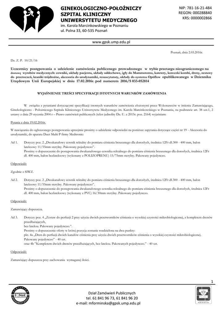 GINEKOLOGICZNO-POŁOŻNICZY SZPITAL KLINICZNY UNIWERSYTETU MEDYCZNEGO NIP: 781-16-21-484 REGON: 000288840 KRS: 0000002866 im. Karola Marcinkowskiego w Poznaniu ul. Polna 33, 60-535 Poznań www.gpsk.ump.edu.pl Poznań, dnia 2.03.2016r. Dz. Z. P. 10/21/16 Uczestnicy postępowania o udzielenie zamówienia publicznego prowadzonego w trybie przetargu nieograniczonego na dostawę wyrobów medycznych: cewniki, układy pacjenta, układy oddechowe, igły do Mammotomu, katetery, koreczki kombi, dreny, zestawy do przetoczeń, kraniki trójdrożne, akcesoria do urodynamiki, resuscytatory, układy do systemu Optiflow opublikowanego w Dzienniku Urzędowym Unii Europejskiej w dniu 17.02.2016r. pod numerem 2016/S 033-052814 WYJAŚNIENIE TREŚCI SPECYFIKACJI ISTOTNYCH WARUNKÓW ZAMÓWIENIA W związku z pytaniami dotyczącymi specyfikacji istotnych warunków zamówienia złożonymi przez Wykonawców w imieniu Zamawiającego, Ginekologiczno - Położniczego Szpitala Klinicznego Uniwersytetu Medycznego im. Karola Marcinkowskiego w Poznaniu, na podstawie art. 38 ust.1, 2 ustawy z dnia 29 stycznia 2004 r – Prawo zamówień publicznych (tekst jednolity Dz. U. z 2015r. poz. 2164) wyjaśniam: Pytania z dnia 19.02.2016r. W nawiązaniu do ogłoszonego postępowania uprzejmie prosimy o udzielenie odpowiedzi na poniższe zapytania dotyczące części nr 19 - Akcesoria do urodynamiki, do aparatu Duet Multi P firmy Medtronic: Ad 1. Dotyczy poz. 2 „Dwukanałowy cewnik rektalny do pomiaru ciśnienia brzusznego dla dorosłych, średnica 12Fr dł.300 - 400 mm, balon lateksowy 11/55mm sterylny. Pakowany pojedynczo”. Prosimy o dopuszczenie do postępowania dwukanałowego cewnika rektalnego do pomiaru ciśnienia brzusznego dla dorosłych, średnica 12Fr dł. 400 mm, balon bezlateksowy (wykonany z POLIZOPRENU) 15/75mm sterylny. Pakowany pojedynczo. Odpowiedź: Zgodnie z SIWZ. Ad 2. Dotyczy poz. 2 „Dwukanałowy cewnik rektalny do pomiaru ciśnienia brzusznego dla dorosłych, średnica 12Fr dł.300 - 400 mm, balon lateksowy 11/55mm sterylny. Pakowany pojedynczo”. Prosimy o dopuszczenie do postępowania dwukanałowego cewnika rektalnego do pomiaru ciśnienia brzusznego dla dorosłych, średnica 12Fr dł. 400 mm, balon bezlateksowy (wykonany z PVC) 16/30mm sterylny. Pakowany pojedynczo. Odpowiedź: Zamawiający dopuszcza. Ad 3. Dotyczy poz. 4 „Zestaw do perfuzji 2 przy użyciu dwóch przetworników ciśnienia o wysokiej czystości mikrobiologicznej, z kompletem drenów przedłużających, bez lateksu. Pakowany pojedynczo.”. Prosimy o dopuszczenie oferty w której pozycja zostanie rozdzielona na dwa punkty: pkt. 4a „Dren do perfuzji dwóch kanałów ciśnienia przy użyciu dwóch przetworników ciśnienia o wysokiej czystości mikrobiologicznej. Pakowany pojedynczo” - 40 szt. oraz 4b ”Kompletem dwóch drenów przedłużających, bez lateksu. Pakowanych pojedynczo.” - 40 szt. Odpowiedź: Zamawiający dopuszcza przy zachowaniu wymaganej ilości. 1 Dział Zamówień Publicznych tel. 61 841 96 73, 61 841 96 20 e-mail: [email protected]