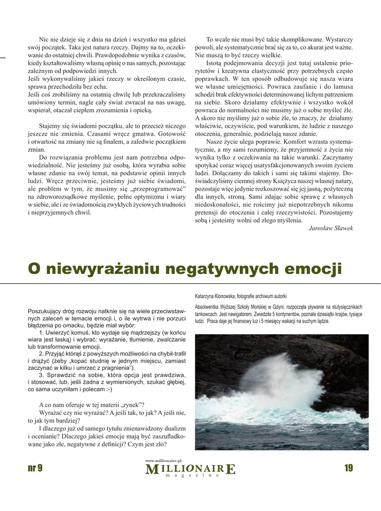 Nic nie dzieje się z dnia na dzień i wszystko ma gdzieś swój początek. Taka jest natura rzeczy. Dajmy na to, oczekiwanie do ostatniej chwili. Prawdopodobnie wynika z czasów, kiedy kształtowaliśmy własną opinię o nas samych, pozostając zależnym od podpowiedzi innych. Jeśli wykonywaliśmy jakieś rzeczy w określonym czasie, sprawa przechodziła bez echa. Jeśli coś zrobiliśmy na ostatnią chwilę lub przekraczaliśmy umówiony termin, nagle cały świat zwracał na nas uwagę, wspierał, otaczał ciepłem zrozumienia i opieką. Stajemy się świadomi początku, ale to przecież niczego jeszcze nie zmienia. Czasami wręcz gmatwa. Gotowość i otwartość na zmiany nie są finałem, a zaledwie początkiem zmian. Do rozwiązania problemu jest nam potrzebna odpowiedzialność. Nie jesteśmy już osobą, która wyrabia sobie własne zdanie na swój temat, na podstawie opinii innych ludzi. Wręcz przeciwnie, jesteśmy już siebie świadomi, ale problem w tym, że musimy się „przeprogramować” na zdroworozsądkowe myślenie, pełne optymizmu i wiary w siebie, ale i ze świadomością zwykłych życiowych trudności i nieprzyjemnych chwil. To wcale nie musi być takie skomplikowane. Wystarczy powoli, ale systematycznie brać się za to, co akurat jest ważne. Nie muszą to być rzeczy wielkie. Istotą podejmowania decyzji jest tutaj ustalenie priorytetów i kreatywna elastyczność przy potrzebnych często poprawkach. W ten sposób odbudowuje się nasza wiara we własne umiejętności. Powraca zaufanie i do lamusa schodzi brak efektywności determinowanej lichym patrzeniem na siebie. Skoro działamy efektywnie i wszystko wokół powraca do normalności nie musimy już o sobie myśleć źle. A skoro nie myślimy już o sobie źle, to znaczy, że działamy właściwie, oczywiście, pod warunkiem, że ludzie z naszego otoczenia, generalnie, podzielają nasze zdanie. Nasze życie ulega poprawie. Komfort wzrasta systematycznie, a my sami rozumiemy, że przyjemność z życia nie wynika tylko z oczekiwania na takie warunki. Zaczynamy spotykać coraz więcej usatysfakcjonowanych swoim życiem ludzi. Dołączamy do takich i sami się takimi stajemy. Doświadczyliśmy ciemnej strony Księżyca naszej własnej natury, pozostaje więc jedynie rozkoszować się jej jasną, pożyteczną dla innych, stroną. Sami zdając sobie sprawę z własnych niedoskonałości, nie rościmy już niepotrzebnych nikomu pretensji do otoczenia i całej rzeczywistości. Pozostajemy sobą i jesteśmy wolni od złego myślenia. Jarosław Sławek O niewyrażaniu negatywnych emocji Katarzyna Klonowska, fotografie archiwum autorki Poszukujący dróg rozwoju natknie się na wiele przeciwstawnych zaleceń w temacie emocji i, o ile wytrwa i nie porzuci błądzenia po omacku, będzie miał wybór: 1. Uwierzyć komuś, kto wydaje się mądrzejszy (w końcu wiara jest łaską) i wybrać: wyrażanie, tłumienie, zwalczanie lub transformowanie emocji. 2. Przyjąć którąś z powyższych możliwości na chybił-trafił i drążyć (żeby „kopać studnię w jednym miejscu, zamiast zaczynać w kilku i umrzeć z pragnienia”). 3. Sprawdzić na sobie, która opcja jest prawdziwa, i stosować, lub, jeśli żadna z wymienionych, szukać głębiej, co sama uczyniłam i polecam :-) Absolwentka Wyższej Szkoły Morskiej w Gdyni, rozpoczęła pływanie na stutysięcznikach tankowcach. Jest nawigatorem. Zwiedziła 5 kontynentów, poznała dziesiątki krajów, tysiące ludzi. Praca daje jej finansowy luz i 5 miesięcy wakacji na suchym lądzie. A co nam oferuje w tej materii „rynek”? Wyrażać czy nie wyrażać? A jeśli tak, to jak? A jeśli nie, to jak tym bardziej? I dlaczego już od samego tytułu znienawidzony dualizm i ocenianie? Dlaczego jakieś emocje mają być zaszufladkowane jako złe, negatywne z definicji? Czym jest zło? nr 9 19 I tu się z pustym umysłem nie da. Trzeba coś założyć. Można, za religiami, że „złe” jest to, co nieposłuszne, ale jest tyle pomysłów na interpretacje listy zakazów, że łatwo się zgubić lub zgłupieć... Mnie się przydaje robocze założenie zapożyczone od Gurdżijewa, a więc definicja zła w odniesieniu do celu, czyli do pracy nad sobą. Złem jest wszystko, co mnie od celu odsuwa, zwalnia, Dobrem – co zbliża, pomaga. Z tej perspektywy złe lub negatywne emocje to te, które mnie odsuwają od samoświadomości, rozwoju. Dobrze, a rozwój? Czy coś takiego w ogóle istnieje? Czy to nie kolejny mit, marzenie, iluzja? Czy można to zweryfikować? Zmierzyć? Czym miałby się taki charakteryzować? Dlaczego ktoś rozwinięty lub rozwijający się miałby być oceniony jako lepszy? I kto się nie rozwija? Nawet mysz nabywa nowych umiejętności... A jeśli właśnie stałam się Furią i się właśnie wyrażam? I to brzydko? Wyzwałam męża, rzuciłam komórką, trzasnęłam drzwiami... Albo się stałam Rozpaczą i biegnę popłakać do przyjaciółki. (Na pewno zapłacze ze mną). To krzywdzę... Ech, te zakazy... A jeśli na głębszych poziomach oni to ja i Jezus miał rację, żeby ich kochać jak siebie? Tylko JA ich widzę i interpretuję w taki sposób. To może to JA ich przyciągam lub nawet stwarzam? W takim razie nic nie wyraziłam. Skopałam samą siebie. Lustra. Może i mi lżej, ale jeśli oni to ja, to suma w najlepszym razie wychodzi na zero. Czy na zero? 1. Gniew to negatywna emocja w ośrodku działania: I tu znowu, pomaga mi robocze założenie o jedności wnętrza i zewnętrza (jak w górze, tak na dole), które zrównuje własną interpretację z pseudo-obiektywną oceną. Zatem to JA oceniam efekty „pracy”. Po owocach. Po jakości mojego życia. Standardy wyznaczam sama. Nie porównuję się do innych ani do wzorca miar. Mam pewne podpowiedzi, słucham Nauczycieli, którzy mówią o wzroście współczucia, miłości, spokoju i czystej radości bycia i wierzę im, bo tak chcę, więc tak dla mnie jest :-) Wzrost szacuję już sama :-) n