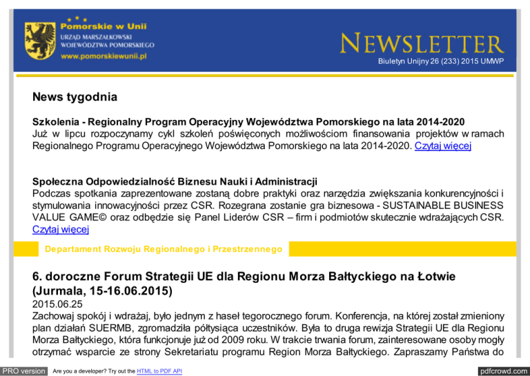 Biuletyn Unijny 26 (233) 2015 UMWP News tygodnia Szkolenia - Regionalny Program Operacyjny Województwa Pomorskiego na lata 2014-2020 Już w lipcu rozpoczynamy cykl szkoleń poświęconych możliwościom finansowania projektów w ramach Regionalnego Programu Operacyjnego Województwa Pomorskiego na lata 2014-2020. Czytaj więcej Społeczna Odpowiedzialność Biznesu Nauki i Administracji Podczas spotkania zaprezentowane zostaną dobre praktyki oraz narzędzia zwiększania konkurencyjności i stymulowania innowacyjności przez CSR. Rozegrana zostanie gra biznesowa - SUSTAINABLE BUSINESS VALUE GAME© oraz odbędzie się Panel Liderów CSR – firm i podmiotów skutecznie wdrażających CSR. Czytaj więcej Departament Rozwoju Regionalnego i Przestrzennego 6. doroczne Forum Strategii UE dla Regionu Morza Bałtyckiego na Łotwie (Jurmala, 15-16.06.2015) 2015.06.25 Zachowaj spokój i wdrażaj, było jednym z haseł tegorocznego forum. Konferencja, na której został zmieniony plan działań SUERMB, zgromadziła półtysiąca uczestników. Była to druga rewizja Strategii UE dla Regionu Morza Bałtyckiego, która funkcjonuje już od 2009 roku. W trakcie trwania forum, zainteresowane osoby mogły otrzymać wsparcie ze strony Sekretariatu programu Region Morza Bałtyckiego. Zapraszamy Państwa do PRO version Are you a developer? Try out the HTML to PDF API pdfcrowd.com zapoznania się ze szczegółami. Czytaj więcej Departament Programów Regionalnych Zmieniony harmonogram naboru wniosków RPO WP 2014-2020 2015.06.24 Zarząd Województwa Pomorskiego zmienił dla Regionalnego Programu Operacyjnego Województwa Pomorskiego harmonogram naborów wniosków w trybie konkursowym na 2015 rok. Czytaj więcej Nowa publikacja. JESSICA - doświadczenia z realizacji w województwie pomorskim 2015.06.24 Zapraszamy do lektury publikacji Case study (Urban Developement Fund in Pomorskie), przygotowanej przez platformę doradczą Komisji Europejskiej fi-compass. Czytaj więcej Odpowiedzi na pytania dotyczące Działania 8.3 RPO WP 2014-2020 2015.06.24 Na stronie internetowej Regionalnego Programu Operacyjnego Województwa Pomorskiego na lata 20142020 opublikowaliśmy odpowiedzi na pytania dotyczące Działania 8.3 Materialne i niematerialne dziedzictwo kulturowe. Czytaj więcej Główny Punkt Informacyjny Funduszy Europejskich POWER 3.4 - wsparcie dla szkół wyższych w zakresie obsługi systemów antyplagiatowych 2015.06.25 Od 22 czerwca do 22 lipca br. trwa nabór wniosków w ramach działania 3.4 Zarządzanie w instytucjach szkolnictwa wyższego, w ramach Programu Wiedza Edukacja Rozwój. Nabór dotyczy działań w zakresie obsługi systemów antyplagiatowych. Beneficjentami wsparcia mogą być szkoły wyższe (publiczne bądź niepubliczne) oraz grupy uczelni pod przewodnictwem lidera. Czytaj więcej PRO version Are you a developer? Try out the HTML to PDF API pdfcrowd.com niepubliczne) oraz grupy uczelni pod przewodnictwem lidera. Czytaj więcej POWER 3.1 - wsparcie szkół wyższych na kształtowanie kompetencji oczekiwanych przez pracodawców od kandydatów do pracy 2015.06.25 Od 22 czerwca do 22 lipca br. trwa nabór wniosków w ramach działania 3.1 Kompetencje w szkolnictwie wyższym, Programu Wiedza Edukacja Rozwój. Wsparcie w ramach konkursu dotyczy kształtowania kompetencji oczekiwanych przez pracodawców od kandydatów do pracy. Beneficjentami wsparcia mogą być szkoły wyższe (publiczne bądź niepubliczne), kształcące co najmniej 100 studentów na studiach stacjonarnych, oraz grupy uczelni pod przewodnictwem lidera. Czytaj więcej Konkurs dla przedsiębiorców w ramach poddziałania 1.1.1 Programu Inteligentny Rozwój 2015.06.25 Trwa nabór wniosków na dofinansowanie projektów w ramach Działania 1.1 „Projekty B+R przedsiębiorstw”, Poddziałanie 1.1.1 „Badania przemysłowe i prace rozwojowe realizowane przez przedsiębiorstwa” Programu Inteligentny Rozwój. Nabór trwa do 31.12.2015 r. Czytaj więcej Szkolenie w Tczewie: „Zasady aplikowania o Fundusze Europejskie - Generator Wniosków Aplikacyjnych SOWA” 2015.06.24 Lokalny Punkt Informacyjny Funduszy Europejskich W Malborku zaprasza na szkolenie poświęcone zagadnieniom prawidłowego tworzenia projektów w ramach funduszy UE. Czytaj więcej Spotkanie informacyjne w Gdańsku: „Możliwości finansowania działalności gospodarczej z Funduszy Europejskich w latach 2014-2020” 2015.06.24 Lokalny Punkt Informacyjny Funduszy Europejskich w Gdańsku zaprasza na spotkanie informacyjne poświęcone zagadnieniom związanym z Funduszami Europejskimi w nowej perspektywie finansowej na lata 2014-2020. Czytaj więcej PRO version Are you a developer? Try out the HTML to PDF API pdfcrowd.com Spotkanie informacyjne „Możliwości pozyskania wsparcia z Funduszy Europejskich na doskonalenie zawodowe” 2015.06.24 Lokalny Punkt Informacyjny Funduszy Europejskich w Gdańsku zaprasza na spotkanie informacyjne poświęcone zagadnieniom związanym z Funduszami Europejskimi na doskonalenie zawodowe. Czytaj więcej Spotkania informacyjne: „Środa z Funduszami dla organizacji pozarządowych” 2015.06.24 Punkty Informacyjne Funduszy Europejskich w województwie pomorskim w ramach cyklu „Środa z Funduszami" zapraszają na spotkania informacyjne poświęcone zagadnieniom związanym ze wsparciem organizacji pozarządowych w zakresie aktywizacji społecznej i zawodowej z Funduszy Europejskich w perspektywie finansowej na lata 2014-2020. Czytaj więcej Mobilne Punkty Informacyjne na Pomorzu - CZERWIEC 2015 2015.06.24 Serdecznie zapraszamy do skorzystania z działań Mobilnych Punktów Informacyjnych na Pomorzu. Czytaj więcej Uwaga! Jeżeli po otrzymaniu newslettera mają Państwo problem z otwarciem zdjęć prosimy wybrać kursorem myszy zamknięte zdjęcie, nacisnąć prawy klawisz i w zależności od potrzeb zaznaczyć jedną ze wskazanych opcji. PRO version Are you a developer? Try out the HTML to PDF API pdfcrowd.com Jeśli nie chcesz otrzymy