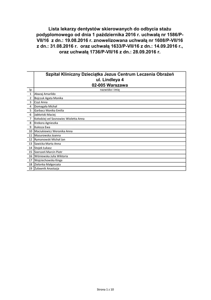 Lista lekarzy dentystów skierowanych do odbycia stażu podyplomowego od dnia 1 października 2016 r. uchwałą nr 1586/PVII/16 z dn.: 19.08.2016 r. znowelizowana uchwałą nr 1608/P-VII/16 z dn.: 31.08.2016 r. oraz uchwałą 1633/P-VII/16 z dn.: 14.09.2016 r., oraz uchwałą 1736/P-VII/16 z dn.: 28.09.2016 r. Szpital Kliniczny Dzieciątka Jezus Centrum Leczenia Obrażeń ul. Lindleya 4 02-005 Warszawa lp 1 2 3 4 5 6 7 8 9 10 11 12 13 14 15 16 17 18 19 nazwisko i imię Abazaj Amarildo Bojczuk Agata Monika Czyż Anna Domagała Michał Garbacz Monika Emilia Jabłoński Maciej Kołodziej vel Sosnowiec Wioletta Anna Krekora Agnieszka Kulesza Ewa Maciukiewicz Weronika Anna Mazurowska Joanna Rymanowski Michał Jan Sawicka Marta Anna Stojek Łukasz Szerszeń Marcin Piotr Wiśniewska Julia Wiktoria Wojciechowska Kinga Zielonka Małgorzata Żuławnik Anastazja Strona 1 z 10 Mazowieckie Centrum Stomatologii Sp. z o.o. ul. Nowy Zjazd 1 00-301 Warszawa lp 1 2 3 4 5 6 7 8 9 10 11 12 13 14 15 16 17 18 19 20 21 22 23 24 25 26 27 28 29 30 31 32 33 34 35 nazwisko i imię Chmielewska Justyna Daczewska Katarzyna Anna Derewońko Karolina Drężek Anna Dygas Sebastian Dymkowski Paweł Krzysztof Dziedzic Alina Głaszczka Marta Godowski Janusz Piotr Grzywna Karolina Janas Dominika Janczewska Joanna Jurkowska Malwina Kacprzyk Milena Kaczyński Karol Amadeusz Kapica Anna Kołodziejska Magdalena Kruk Klaudia Leszak Sylwia Katarzyna Łukasik Katarzyna Mateusiak Daria Kamila Mikutel Marta Naumowska Katarzyna Pap Magdalena Piorun Natalia Weronika Pogorzelski Bartłomiej Piotr Sosnowska Paulina Środa Marcin Paweł Świętorzecka Julita Barbara Trawińska Sylwia Trojanowska Zuzanna Magdalena Truszyńska Ewelina Walkiewicz Magdalena Zawadka Dominika Zborzyńska Aleksandra Samodzielny Zespół Publicznych Zakładów Lecznictwa Otwartego Warszawa Praga Północ ul. Jagiellońska 34 03-719 Warszawa lp 1 Ługowska Aleksandra nazwisko i imię Strona 2 z 10 Niepubliczny Zakład Opieki Zdrowotnej Centrum Medyczne Fundacji "Zdrowie" al. Dzieci Polskich 17 04-730 Warszawa PORADNIA STOMATOLOGICZNA ul. Roentgena 23 lok.2 02-781 Warszawa lp 1 2 3 4 5 nazwisko i imię Bielecka Agata Kicka Małgorzata Łuczak Marta Wiktor Aleksandra Magdalena Wiktor Piotr Przychodnia Lekarska Wojskowej Akademii Technicznej SPZOZ ul. Kartezjusza 2 01-480 Warszawa lp 1 2 3 4 5 6 7 8 9 10 nazwisko i imię Czajka Karol Maciej Kaczyńska Agnieszka Kamiński Konrad Kowalczyk Jakub Kruk Magdalena Paulina Pastuszko Anna Agnieszka Piasecka Joanna Dorota Sipińska Aleksandra Suwiński Arkadiusz Wilk Aleksandra Dominika Centralna Wojskowa Przychodnia Lekarska „CePeLek” SPZOZ ul. Koszykowa 78 00-911 Warszawa lp 1 2 3 4 5 6 7 8 9 10 11 12 13 14 15 16 17 18 19 20 21 22 nazwisko i imię Andrzejewicz Anna Bartosik Jonatan Jakub Bikiewicz Katarzyna Borawska Joanna Anna Chojnowska Agnieszka Ciok Anna Maria Czerwata Magdalena Agnieszka Dąbkowska Magdalena Dymitrowa Georgiewa Renata Frelek Joanna Aleksandra Gruchała Anna Elżbieta Kargol Joanna Michalski Jakub Panasiewicz Paulina Beata Piotrowska Milena Anita Pochroń Natalia Rytlewska Agnieszka Siniarski Piotr Bogdan Siuciak Karolina Edyta Skrzat Anna Stolarczyk Agnieszka Wioleta Wojtasiak Sebastian Czesław Strona 3 z 10 Niepubliczny Zakład Opieki Zdrowotnej „CITImedical” Ul. Młynarska 26/28 01-171 Warszawa lp 1 Siejek Katarzyna Anna 2 Szymańska Katarzyna Olga nazwisko i imię Niepubliczny Zakład Opieki Zdrowotnej Poradnia Stomatologiczna „De Wu” Ul. Różana 8, 05-270 Marki Filia nr 1 Warszawa ul. Jagiellońska 34 Filia nr 2 Warszawa ul. Otwocka 1 lp 1 Jarosiewicz Dajana Roksana 2 Skieresz Sylwia Justyna nazwisko i imię Indywidualna Specjalistyczna Praktyka Lekarsko Stomatologiczna IMARI Ul. Walecznych 57 m. 31 03-926 Warszawa lp 1 Biernat Magda Alicja nazwisko i imię Instytut „ Pomnik Centrum Zdrowia Dziecka” al. Dzieci Polskich 20 04-730 Warszawa lp 1 Lipiec Maja nazwisko i imię Wojskowy Instytut Medycyny Lotniczej Publiczny Zakład Opieki Zdrowotnej ul. Krasińskiego 54 01-755 Warszawa lp 1 2 3 4 nazwisko i imię Grot Kacper Filip Karczmarczyk Karolina Piwowarska Karolina Rytel Magdalena Lecznica „GOCŁAW” Maria Kamela ul. Fieldorfa 5 03-984 Warszawa lp 1 Łukasz Karolina 2 Orzechowska Izabela 3 Pacak Maria Zofia nazwisko i imię Strona 4 z 10 Niepubliczny Zakład Opieki Zdrowotnej Centrum Stomatologiczne SKOROSZE ul. Chełmońskiego 2 lok. 1 02-495 Warszawa Filia STOMATOLOGIA NAD UTRATĄ ul. Kręta 3B 05-802 Pruszków lp 1 Pałyga Mateusz nazwisko i imię Centrum Medyczne Corten Medic Tomasz Sikora Przychodnia Lekarska Nr 1 ul. Modzelewskiego 58, 02-679 Warszawa Przychodnia Lekarska nr 2 ul. Pasaż Ursynowski 9, 02-784 Warszawa Przychodnia lekarska nr 4 ul. Makolągwy 21 lok.U-4, 02-811 Warszawa Przychodnia Lekarska nr 3 ul. Wł. Beliny Prażmowskiego 33A, 26-600 Radom Przychodnia Lekarska nr 5 ul. Krakowskie Przedmieście 24/26, 00-071 Warszawa Przychodnia Lekarska nr 6 ul. Etiudy Rewolucyjnej 48, 02-643 Warszawa lp 1 2 3 4 5 6 7 8 9 nazwisko i imię Celuch Zbigniew Hir Katarzyna Karwat Marlena Lewandowska Katarzyna Małyszek Ewa Struzik Sabrina Beata Syvak Julian Wasąg Natalia Grażyna Wojcieszko Katarzyna Zofia Niepubliczny Zakład Opieki Zdrowotnej Przychodnia Medyczna ul. Kochanowskiego 45 paw. 1 01-864 Warszawa lp 1 Mikicin Marta Anna nazwisko i imię DENTAL STUDIO ul. Sokratesa 2B lok. 1 01-909 Warszawa lp 1 Andrzejewska Anna nazwisko i imię Strona 5 z 10 Niepubliczny Zakład Opieki Zdrowotnej „ELEKTORALNA DENTAL CLINIC” ul. Elektoralna 28 00-892 Warszawa lp 1 2 3 4 5 nazwisko i imię Chybalska Katarzyna Maria Lewińska Agnieszka Mashynska Natalia Szymański Maciej Piotr Wysocka Katarzyna „LASER-DENT” PRZYCHODNIA STOMATOLOGICZNA ul. Grochowska 354 03-838 Warszawa lp 1 Orlik Justyna nazwisko i imię STOMATOLOGIA RAFAŁOWICZ- BARBARA RAFAŁOWICZ ul. Ćmielowska 15 lok. użyt. 8 03-127 Warszawa lp 1 Bączek Iwona Judyta 2 Jachimczyk Olga 3 Szymańska Olga nazwisko i im