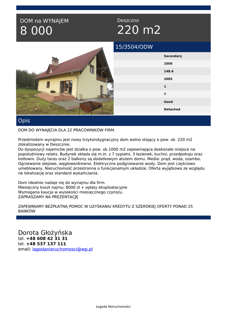 Deszczno DOM na WYNAJEM 220 m2 8 000 15/3504/ODW Secondary 1000 148.6 2005 1 7 Good Detached Opis DOM DO WYNAJĘCIA DLA 22 PRACOWNIKÓW FIRM. Przedmiotem wynajmu jest nowy trzykondygnacyjny dom wolno stojący o pow. ok. 220 m2 zlokalizowany w Deszcznie. Do dyspozycji najemców jest działka o pow. ok.1000 m2 zapewniająca doskonałe miejsce na popołudniowy relaks. Budynek składa się m.in. z 7 sypialni, 3 łazienek, kuchni, przedpokoju oraz kotłowni. Duży taras oraz 2 balkony są dodatkowym atutem domu. Media: prąd, woda, szambo. Ogrzewanie olejowe, węglowe/drewno. Elektryczne podgrzewanie wody. Dom jest częściowo umeblowany. Nieruchomość przestronna o funkcjonalnym układzie. Oferta wyjątkowa ze względu na lokalizację oraz standard wykańczania. Dom idealnie nadaje się do wynajmu dla firm. Miesięczny koszt najmu: 8000 zł + opłaty eksploatacyjne Wymagana kaucja w wysokości miesięcznego czynszu. ZAPRASZAMY NA PREZENTACJĘ ZAPEWNIAMY BEZPŁATNĄ POMOC W UZYSKANIU KREDYTU Z SZEROKIEJ OFERTY PONAD 25 BANKÓW Dorota Głożyńska tel. +48 608 42 31 31 tel. +48 537 137 111 email: [email protected] Łagoda Nieruchomości Powered by TCPDF (www.tcpdf.org)