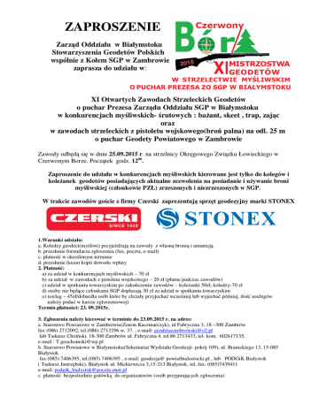 ZAPROSZENIE Zarząd Oddziału w Białymstoku Stowarzyszenia Geodetów Polskich wspólnie z Kołem SGP w Zambrowie zaprasza do udziału w: XI Otwartych Zawodach Strzeleckich Geodetów o puchar Prezesa Zarządu Oddziału SGP w Białymstoku w konkurencjach myśliwskich- śrutowych : bażant, skeet , trap, zając oraz w zawodach strzeleckich z pistoletu wojskowego(broń palna) na odl. 25 m o puchar Geodety Powiatowego w Zambrowie Zawody odbędą się w dniu 25.09.2015 r. na strzelnicy Okręgowego Związku Łowieckiego w Czerwonym Borze. Początek godz. 1200. Zaproszenie do udziału w konkurencjach myśliwskich kierowane jest tylko do kolegów i koleżanek geodetów posiadających aktualne zezwolenia na posiadanie i używanie broni myśliwskiej (członkowie PZŁ) zrzeszonych i niezrzeszonych w SGP. W trakcie zawodów goście z firmy Czerski zaprezentują sprzęt geodezyjny marki STONEX 1.Warunki udziału: a. Koledzy geodeci(myśliwi) przyjeżdżają na zawody z własną bronią i amunicją. b. przesłanie formularza zgłoszenia (fax, poczta, e-mail) c. płatność w określonym terminie d. przesłanie faxem kopii dowodu wpłaty 2. Płatność: a) za udział w konkurencjach myśliwskich – 70 zł b) za udział w zawodach z pistoletu wojskowego – 20 zł (płatne podczas zawodów) c) udział w spotkaniu towarzyskim po zakończeniu zawodów – koleżanki 50zł, koledzy-70 zł d) osoby nie będące członkami SGP dopłacają 30 zł za udział w spotkaniu towarzyskim e) nocleg – 45zł/doba(dla osób które by chciały przyjechać wcześniej lub wyjechać później, ilość noclegów należy podać w karcie zgłoszeniowej) Termin płatności: 23. 09.2015r. 3. Zgłoszenia należy kierować w terminie do 23.09.2015 r. na adres: a. Starostwo Powiatowe w Zambrowie(Zenon Kaczmarczyk), ul Fabryczna 3, 18 –300 Zambrów fax (086) 2712092, tel.(086) 2713296 w. 37. , e-mail: [email protected] lub Tadeusz Choiński, 18-300 Zambrów ul. Fabryczna 4, tel.86 2713433, tel. kom. 602617135, e-mail : [email protected] b. Starostwo Powiatowe w Białymstoku(Sekretariat Wydziału Geodezji- pokój 109), ul. Branickiego 13, 15-085 Białystok fax (085) 7406395, tel.(085) 7406395 , e-mail: geodezja@ powiatbialostocki.pl , lub PODGiK Białystok ( Tadeusz Jastrzębski), Białystok ul. Mickiewicza 3,15-213 Białystok, tel, fax: (085)7439411 e-mail: [email protected] c. płatność bezpośrednio gotówką do organizatorów (osób przyjmujących zgłoszenia) PROGRAM ZEBRANIA ZARZĄDU ODDZIAŁU SGP I ZAWODÓW STRZELECKICH GEODETÓW W CZERWONYM BORZE w dniu 25.09.2015 r. ZAWODY STRZELECKIE i MYŚLIWSKIE BĘDĄ MIAŁY CHARAKTER OTWARTY DLA GEODETÓW ZRZESZONYCH I NIEZRZESZONYCH W SGP OSTATECZNY TERMIN ZGŁOSZEŃ DO 23.09.2015r. POCZĄTEK ZAWODÓW W OBU KATEGORIACH O GODZ 1200 W DNIU 20.09.2015r. 1. Geodeci – myśliwi do dnia 23.09. 2015 r. uiszczają wpisowe w wysokości 70 zł ( koszty obsługi strzelnicy ,komisji sędziowskiej, materiałów typu rzutki, tarcze itp.) przyjeżdżają z własnym sprzętem i amunicją 2. Geodeci inni- chętni do udziału w zawodach strzeleckich z pistoletu sportowego uiszczają wpisowe w wysokości 20 zł bezpośrednio na strzelnicy. 3. Geodeci zamiejscowi, którzy zgłosili udział z noclegiem kwaterują się w dniu przyjazdu w hotelu prowadzonym przez IGB „Pomerania” w Czerwonym Borze do godz. 21(pobranie kluczy do pokoju od obsługi w barze „Leśnym”) tel.86 2162615 4. Konkurencje: a) myśliwskie śrutowe: - trap -skeet (krąg) - bażant - zając b) zawody strzeleckie – pistolet wojskowy (25 m) 4. Porządek dnia: 1. 900 - odjazd autokaru z Białegostoku zaparkowanego obok pomnika ks. Popiełuszki 2. 1030 – 1200 Zebranie Zarządu Oddziału SGP w Białymstoku bezpośrednio przed zawodami w wiacie myśliwych na strzelnicy. 3. 1200– 1530 zawody myśliwskie i strzeleckie, stół wiejski, ognisko (równolegle). 4. 1530 – 1600 przejście do lokalu baru „Leśnego” 5. 1600 - wręczenie pucharów, spotkanie towarzyskie W czasie zebrania i zawodów odbędzie się prezentacja sprzętu geodezyjnego marki STONEX przez zaproszonych gości z firmy Czerski.