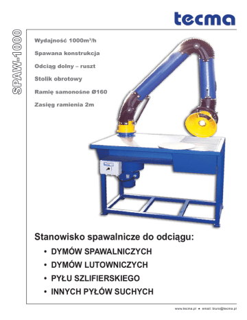 SPAW-1000 Wydajność 1000m3/h Spawana konstrukcja Odciąg dolny – ruszt Stolik obrotowy Ramię samonośne Ø160 Zasięg ramienia 2m Stanowisko spawalnicze do odciągu: • DYMÓW SPAWALNICZYCH • DYMÓW LUTOWNICZYCH • PYŁU SZLIFIERSKIEGO • INNYCH PYŁÓW SUCHYCH www.tecma.pl ● email: [email protected] SPAW-1000 Stanowisko spawalnicze SPAW-1000 Stanowisko przeznaczone jest do prac na powierzchni stołu lub stolika obrotowego oraz w promieniu działania rękawa samonośnego (standardowo Rmax=2m). Ograniczeniem w zastosowaniu są opary i gazy wybuchowe oraz agresywne chemicznie. Stanowisko wyposażone jest w dwa odciągi: ramię samonośne RS 2-160 oraz ruszt na powierzchni stołu z przepustnicą. Wbudowany wentylator ZWA-3 odsysa dymy spawalnicze przez jeden lub oba odciągi, a następnie przetłacza je na zewnątrz pomieszczenia. W tym celu niezbędne jest podłączenie instalacji wywiewnej (tłocznej) – do 10m Ø200. W zależności od prac wykonywanych na powierzchni stołu, za pomocą przepustnic reguluje się ilość powietrza zasysanego przez każdy z odciągów. Ramiak stołu wykonany jest z grubych profili kwadratowych dzięki czemu jego konstrukcja jest bardzo stabilna. Zasięg pracy Wymiary Wymiary Jednostka L 4 [mm] 1260 S [mm] 860 H [mm] 855 L1 [mm] 400 D1 [mm] 160 D2 [mm] 350 [m] 2 R max (dla RS 2-160) Standardowa konfiguracja • • • • 2 • • 3 • 1 • 5 solidna spawana konstrukcja stolik obrotowy (6) odciąg dolny – ruszt (5) i górny – ramię (4) regulacja przepływu za pomocą przepustnicy w stole (3) oraz w ramieniu wentylator promieniowy 0.75kW (1) zabezpieczenie przeciwprzepięciowe silnika (2) możliwość podłączenia do centralnego systemu filtracji ramię RS 2-160 o zasięgu 2m (4) Dane techniczne SPAW-1000 Wydajność 6 [m3/h] 1000 [kg] 120 Masa bez ramienia Masa z ramieniem 1620P [kg] 140 [V] / [Hz] 3x400 / 50 Hałas dB(A) 76 Moc silnika [kW] 0.75 Zasilanie Wyposażenie dodatkowe Oznaczenie Oświetlenie w ssawce Uruchamianie wentylatora L Tak – zestaw MOD-L Manualne A Tak – zestaw MOD-A Automatyczne (ZAR-A) Zasięg pracy z ramieniem RS 2-160 Na życzenie możliwe jest wykonanie stanowiska z ramieniem o większym zasięgu działania (3m lub 4m), z wentylatorem o innych parametrach (np. z silnikiem jednofazowym) lub zastosowanie wariantu bez wentylatora – z przyłączem do instalacji wyciągowej lub urządzenia filtracyjnego. www.tecma.pl ● email: [email protected]