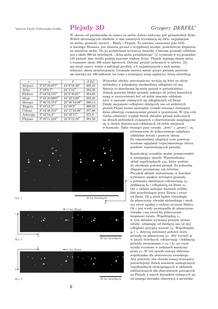 ∗ Instytut Fizyki, Politechnika Łódzka Plejady 3D Grzegorz DERFEL* W okresie od października do marca na niebie dobrze widoczny jest gwiazdozbiór Byka. Wśród interesujących obiektów w nim zawartych wyróżniają się dwie, najjaśniejsze na niebie, gromady otwarte – Hiady i Plejady. Ta ostatnia, oznaczona jako M45 w katalogu Messiera, jest zbiorem gwiazd o wyjątkowej urodzie, prawdziwym klejnotem na zimowym niebie. Do jej podziwiania wystarczy lornetka. Centrum gromady oddalone jest o około 390 lat świetlnych. „Atlas nieba gwiaździstego” [1] wymienia w tej gromadzie 145 gwiazd; inne źródła podają znacznie większe liczby. Plejady zajmują obszar nieba o rozmiarze około 100 minut kątowych. Dziesięć gwiazd (zebranych w tabelce, [2]) ma swoje nazwy wzięte z mitologii greckiej, a 6 najjaśniejszych z nich można zobaczyć okiem nieuzbrojonym. Gromada zawiera młode gorące gwiazdy powstałe nie dawniej niż 100 milionów lat temu z istniejącej wciąż mgławicy, którą oświetlają. ∗ Alcjona Atlas Elektra Maja Meropa Tajgeta Celena Asteropa Plejona α 3 47 29,077′′ 3h 49′ 9,7′′ 3h 44′ 52,537′′ 3h 45′ 49,0607′′ 3h 46′ 19,574′′ 3h 45′ 12,5′′ 3h 44′ 48,215′′ 3h 45′ 54,4′′ 3h 49′ 11,216′′ h ′ δ 24 6 18,49′′ 24◦ 3′ 12′′ 24◦ 6′ 48,01′′ 24◦ 22′ 3,89′′ 23◦ 56′ 54,09′′ 24◦ 28′ 2′′ 24◦ 17′ 22,09′′ 24◦ 33′ 17′′ 24◦ 8′ 12,16′′ ◦ ′ d [ly] 403,16 382,36 404,66 383,26 380,14 409,23 377,06 371,9 381,92 Wszystkie obiekty astronomiczne wydają się leżeć na sferze niebieskiej w jednakowej nieokreślonej odległości od nas. Sprzyja to dowolnemu łączeniu gwiazd w gwiazdozbiory. Jednak pozornie bliskie gwiazdy należące do jednej konstelacji mogą w rzeczywistości być od siebie znacznie oddalone, leżeć w znacznie różniących się odległościach od Ziemi. Dzięki znajomości odległości dzielących nas od niektórych gwiazd Plejad można sporządzić rysunki tworzące stereoparę, która zilustruje rozmieszczenie gwiazd w przestrzeni. W tym celu trzeba odtworzyć wygląd dwóch układów gwiazd widocznych na sferach niebieskich związanych z obserwatorami znajdującymi się w dwóch dostatecznie oddalonych od siebie miejscach w kosmosie. Takie tworzące parę rysunki, „lewy” i „prawy”, są przeznaczone do jednoczesnego oglądania oddzielnie lewym i prawym okiem. Po odpowiedniej adaptacji oczu powstaje wrażenie oglądania trójwymiarowego zbioru punktów reprezentujących gwiazdy. Konstrukcję rysunków można przeprowadzić w następujący sposób. Wprowadzamy układ współrzędnych xyz, który posłuży do określenia położeń gwiazd. Za jednostkę długości przyjmiemy rok świetlny. Początek układu umieszczamy w dowolnie wybranym punkcie wewnątrz gromady, o położeniu określonym rektascensją α0 , deklinacją δ0 i odległością od Ziemi x0 . Osi x układu nadajmy kierunek wzdłuż linii przechodzącej przez Ziemię i zwrot od Ziemi. Oś y niech będzie równoległa do płaszczyzny równika niebieskiego i niech ma zwrot zgodny z ruchem rocznym Słońca. Oś z jest wtedy prostopadła do płaszczyzny równika i ma zwrot ku północnemu biegunowi świata. Współrzędną xi w tym układzie wybranej gwiazdy można ustalić, odejmując od dzielącej nas od niej odległości przyjętą wartość x0 . Współrzędne yi i zi dotyczą natomiast położeń rzutu gwiazdy na płaszczyznę yz. Aby wyrazić je w latach świetlnych, rektascensję i deklinację gwiazdy zmniejszamy o α0 i δ0 , po czym wyniki wyrażone w radianach mnożymy przez x0 . W ten sposób zostają obliczone współrzędne dla obserwatora ziemskiego. Aby powstały oba obrazki naszej stereopary, potrzebujemy dwóch zestawów analogicznych współrzędnych obowiązujących w układach zdefiniowanych dla obserwatorów patrzących na Plejady z innych kierunków różniących się od naszego kierunku obserwacji o niewielkie 6