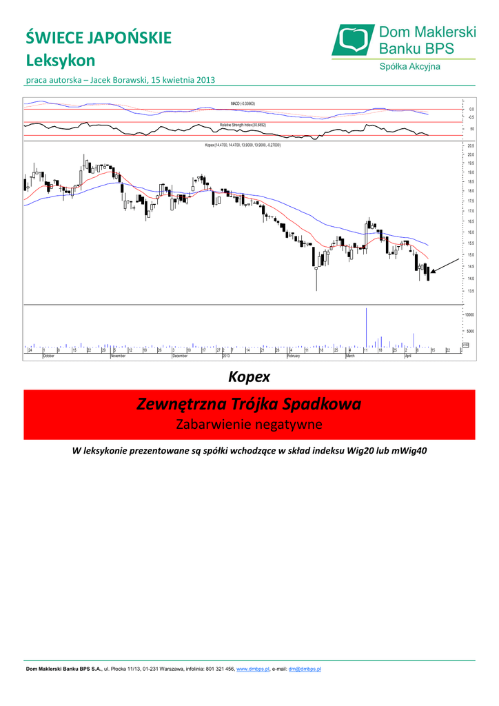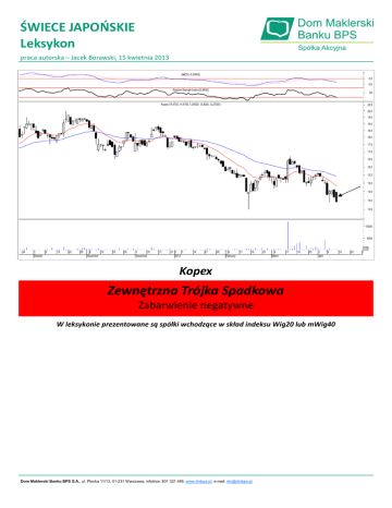 ŚWIECE JAPOŃSKIE Leksykon praca autorska – Jacek Borawski, 15 kwietnia 2013 MACD (-0.33663) 0.0 -0.5 Relative Strength Index (30.6892) 50 Kopex (14.4700, 14.4700, 13.9000, 13.9000, -0.27000) 20.5 20.0 19.5 19.0 18.5 18.0 17.5 17.0 16.5 16.0 15.5 15.0 14.5 14.0 13.5 10000 5000 x100 24 1 8 October 15 22 29 5 12 November 19 26 3 10 December 17 27 2 7 2013 14 21 28 4 February 11 18 25 4 March 11 18 25 2 April 8 Kopex Zewnętrzna Trójka Spadkowa Zabarwienie negatywne W leksykonie prezentowane są spółki wchodzące w skład indeksu Wig20 lub mWig40 Dom Maklerski Banku BPS S.A., ul. Płocka 11/13, 01-231 Warszawa, infolinia: 801 321 456, www.dmbps.pl, e-mail: [email protected] 15 22 29 ŚWIECE JAPOŃSKIE Leksykon praca autorska – Jacek Borawski, 15 kwietnia 2013 MACD (-0.32694) -0.5 -1.0 Relative Strength Index (43.3139) 40 30 20 10 TPSA (6.36000, 6.67000, 6.36000, 6.63000, +0.29000) 7.9 7.8 7.7 7.6 7.5 7.4 7.3 7.2 7.1 7.0 6.9 6.8 6.7 6.6 6.5 6.4 6.3 6.2 15000 10000 5000 x1000 14 15 18 19 20 21 22 25 26 27 28 1 4 March 5 6 7 8 11 12 13 14 15 18 19 20 21 22 25 26 27 28 2 3 April 4 5 8 9 10 11 12 15 16 17 18 19 22 23 TPSA Duży Biały Korpus na niskim poziomie cenowym Zabarwienie pozytywne W leksykonie prezentowane są spółki wchodzące w skład indeksu Wig20 lub mWig40 Dom Maklerski Banku BPS S.A., ul. Płocka 11/13, 01-231 Warszawa, infolinia: 801 321 456, www.dmbps.pl, e-mail: [email protected] 24 25 26 29 ŚWIECE JAPOŃSKIE Leksykon praca autorska – Jacek Borawski, 15 kwietnia 2013 MACD (-0.00823) 0.5 0.0 Relative Strength Index (46.9242) 70 60 50 40 TVN (9.60000, 9.60000, 9.36000, 9.36000, -0.24000) 10.2 10.1 10.0 9.9 9.8 9.7 9.6 9.5 9.4 9.3 9.2 9.1 9.0 8.9 8.8 8.7 8.6 8.5 8.4 50000 40000 30000 20000 10000 x100 27 2 2013 7 14 21 28 4 February 11 18 25 4 March 11 18 25 2 April 8 15 TVN Objęcie Bessy Zabarwienie negatywne W leksykonie prezentowane są spółki wchodzące w skład indeksu Wig20 lub mWig40 Dom Maklerski Banku BPS S.A., ul. Płocka 11/13, 01-231 Warszawa, infolinia: 801 321 456, www.dmbps.pl, e-mail: [email protected] 22 29 ŚWIECE JAPOŃSKIE Leksykon praca autorska – Jacek Borawski, 15 kwietnia 2013 Dom Maklerski Banku BPS SA ul. Płocka 11 /13 01-231 Warszawa, tel.: +48 22 53 95 555, fax.: +48 22 53 95 556 www.dmbps.pl [email protected] Biuro Analiz i Doradztwa Inwestycyjnego: Departament Operacji: Łukasz Kopeć - przemysł elektromaszynowy, górnictwo, Dyrektor Biura Analiz i Doradztwa Inwestycyjnego [email protected] tel.: (22) 53 95 527 Bogdan Dzimira, MPW, Doradca Inwestycyjny [email protected] Tel.: (22) 53 95 523 Marcin Stebakow, MPW – handel, przemysł spożywczy [email protected] tel.: (22) 53 95 548 Grzegorz Kołcz, MPW - banki [email protected] Tel.: (22) 53 95 503 Kamil Artyszuk – obligacje [email protected] tel.: (22) 53 95 535 Damian Szparaga – MPW [email protected] tel.: (22) 53 95 516 Analitycy techniczni: Jacek Borawski Biuro Sprzedaży: Jan Woźniak, MPW [email protected] tel.: (22) 53 95 536 Artur Kobos, MPW [email protected] Tel.: (22) 53 95 511 Grzegorz Górski , MPW [email protected] tel.: (22) 53 95 540 Bartosz Szaniawski [email protected] tel.: (22) 53 95 525 Bartosz Walczak [email protected] tel.: (22) 53 95 559 Lech Kucharski [email protected] tel.: (22) 53 95 522 Beata Zbrzezna, MPW [email protected] tel.: (22) 53 95 544 Wyjaśnienia dotyczące stosowanej terminologii fachowej i wskaźników: MACD (Moving Average Convergence / Divergence) – wskaźnik badający zbieżność i rozbieżność średnich ruchomych; jest różnicą wartości długoterminowej i krótkoterminowej średniej wykładniczej; wykorzystywany do badania sygnałów kupna i sprzedaży akcji RSI (Relative Strength Index) – wskaźnik siły względnej; oscylator określający siłę trendu STS (Stochastic Oscillator) – oscylator stochastyczny; wskaźnik momentum używany do porównania cen zamknięcia do zakresu cen w danym okresie Opracowanie wyraża wiedzę oraz poglądy jego autorów według stanu na dzień sporządzenia niniejszego opracowania. Materiał został sporządzony z zachowaniem należytej staranności i rzetelności przy zachowaniu zasad metodologicznej poprawności na podstawie ogólnodostępnych informacji, w dniu publikacji opracowania, pozyskanych ze źródeł wiarygodnych dla Domu Maklerskiego Banku BPS S.A. Dom Maklerski Banku BPS S.A. nie gwarantuje ich kompletności i dokładności. Organem sprawującym nadzór nad działalnością Domu Maklerskiego Banku BPS S.A. jest Komisja Nadzoru Finansowego z siedzibą w Warszawie, przy Placu Powstańców Warszawy 1. Informacje zawarte w niniejszym raporcie nie stanowią rekomendacji w rozumieniu Rozporządzenia Ministra Finansów z 19 października 2005 roku w sprawie informacji stanowiących rekomendacje dotyczące instrumentów finansowych, ich emitentów lub wystawców (Dz. U. z 19 października 2005 r. Nr 206, poz. 1715). DM Banku BPS SA nie ponosi odpowiedzialności za decyzje inwestycyjne podjęte na podstawie niniejszego opracowania ani za szkody poniesione w wyniku tych decyzji inwestycyjnych. Powielanie bądź publikowanie w jakiejkolwiek formie niniejszego opracowania, lub jego części, oraz zwartych w nim zaleceń, oraz wykorzystywanie materiału do własnych opracowań celem publikacji, bez pisemnej zgody DM Banku BPS S.A. jest zabronione. Niniejsze opracowanie stanowi publikację handlową i jest prawnie chronione zgodnie z Ustawą z 4 lutego 1994 r. o prawie autorskim i prawach pokrewnych (Dz. U. 1994 nr 24 poz. 83 z późn. zm.). Jest prawdopodobne, iż DM Banku BPS S.A. świadczył, świadczy lub będzie świadczył usługi na rzecz przedsiębiorców i innych podmiotów wymienionych w niniejszym opracowaniu. DM Banku BPS S.A., jego akcjonariusze i pracownicy mogą posiadać długie lub krótkie pozycje w akcjach emitentów lub innych instrumentach finansowych powiązanych z akcjami emitentów wymienionych w opracowaniu. DM Banku BPS S.A. pełni funkcję animatora emitenta dla nast