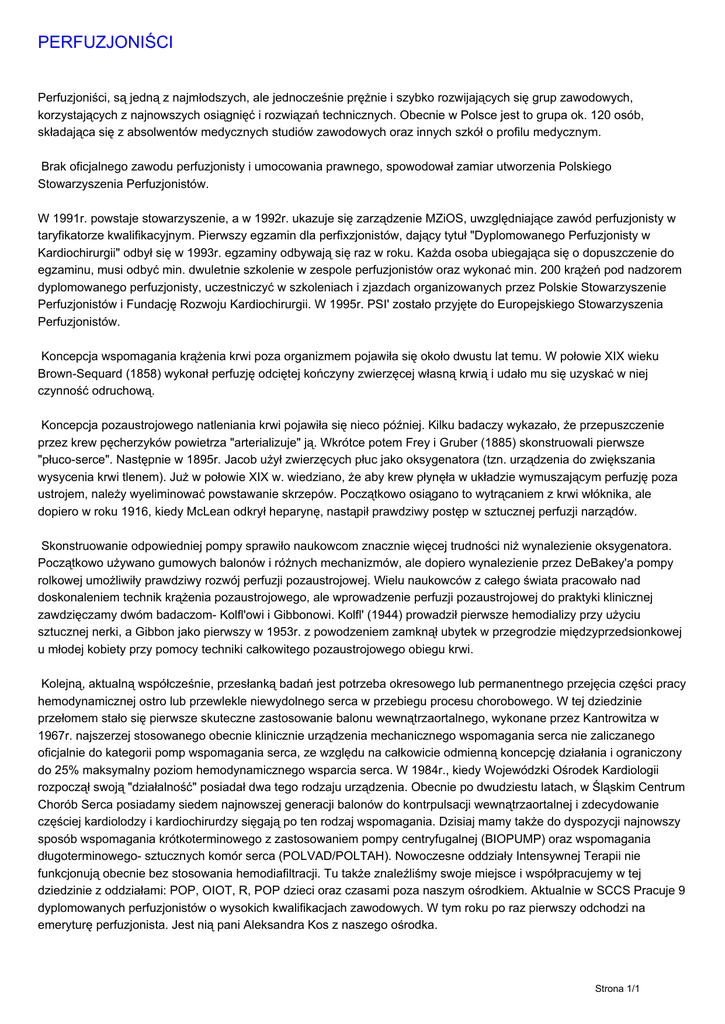 PERFUZJONIŚCI Perfuzjoniści, są jedną z najmłodszych, ale jednocześnie prężnie i szybko rozwijających się grup zawodowych, korzystających z najnowszych osiągnięć i rozwiązań technicznych. Obecnie w Polsce jest to grupa ok. 120 osób, składająca się z absolwentów medycznych studiów zawodowych oraz innych szkół o profilu medycznym. Brak oficjalnego zawodu perfuzjonisty i umocowania prawnego, spowodował zamiar utworzenia Polskiego Stowarzyszenia Perfuzjonistów. W 1991r. powstaje stowarzyszenie, a w 1992r. ukazuje się zarządzenie MZiOS, uwzględniające zawód perfuzjonisty w taryfikatorze kwalifikacyjnym. Pierwszy egzamin dla perfixzjonistów, dający tytuł "Dyplomowanego Perfuzjonisty w Kardiochirurgii" odbył się w 1993r. egzaminy odbywają się raz w roku. Każda osoba ubiegająca się o dopuszczenie do egzaminu, musi odbyć min. dwuletnie szkolenie w zespole perfuzjonistów oraz wykonać min. 200 krążeń pod nadzorem dyplomowanego perfuzjonisty, uczestniczyć w szkoleniach i zjazdach organizowanych przez Polskie Stowarzyszenie Perfuzjonistów i Fundację Rozwoju Kardiochirurgii. W 1995r. PSI' zostało przyjęte do Europejskiego Stowarzyszenia Perfuzjonistów. Koncepcja wspomagania krążenia krwi poza organizmem pojawiła się około dwustu lat temu. W połowie XIX wieku Brown-Sequard (1858) wykonał perfuzję odciętej kończyny zwierzęcej własną krwią i udało mu się uzyskać w niej czynność odruchową. Koncepcja pozaustrojowego natleniania krwi pojawiła się nieco później. Kilku badaczy wykazało, że przepuszczenie przez krew pęcherzyków powietrza "arterializuje" ją. Wkrótce potem Frey i Gruber (1885) skonstruowali pierwsze "płuco-serce". Następnie w 1895r. Jacob użył zwierzęcych płuc jako oksygenatora (tzn. urządzenia do zwiększania wysycenia krwi tlenem). Już w połowie XIX w. wiedziano, że aby krew płynęła w układzie wymuszającym perfuzję poza ustrojem, należy wyeliminować powstawanie skrzepów. Początkowo osiągano to wytrącaniem z krwi włóknika, ale dopiero w roku 1916, kiedy McLean odkrył heparynę, nastąpił prawdziwy postęp w sztucznej perfuzji narządów. Skonstruowanie odpowiedniej pompy sprawiło naukowcom znacznie więcej trudności niż wynalezienie oksygenatora. Początkowo używano gumowych balonów i różnych mechanizmów, ale dopiero wynalezienie przez DeBakey'a pompy rolkowej umożliwiły prawdziwy rozwój perfuzji pozaustrojowej. Wielu naukowców z całego świata pracowało nad doskonaleniem technik krążenia pozaustrojowego, ale wprowadzenie perfuzji pozaustrojowej do praktyki klinicznej zawdzięczamy dwóm badaczom- Kolfl'owi i Gibbonowi. Kolfl' (1944) prowadził pierwsze hemodializy przy użyciu sztucznej nerki, a Gibbon jako pierwszy w 1953r. z powodzeniem zamknął ubytek w przegrodzie międzyprzedsionkowej u młodej kobiety przy pomocy techniki całkowitego pozaustrojowego obiegu krwi. Kolejną, aktualną współcześnie, przesłanką badań jest potrzeba okresowego lub permanentnego przejęcia części pracy hemodynamicznej ostro lub przewlekle niewydolnego serca w przebiegu procesu chorobowego. W tej dziedzinie przełomem stało się pierwsze skuteczne zastosowanie balonu wewnątrzaortalnego, wykonane przez Kantrowitza w 1967r. najszerzej stosowanego obecnie klinicznie urządzenia mechanicznego wspomagania serca nie zaliczanego oficjalnie do kategorii pomp wspomagania serca, ze względu na całkowicie odmienną koncepcję działania i ograniczony do 25% maksymalny poziom hemodynamicznego wsparcia serca. W 1984r., kiedy Wojewódzki Ośrodek Kardiologii rozpoczął swoją "działalność" posiadał dwa tego rodzaju urządzenia. Obecnie po dwudziestu latach, w Śląskim Centrum Chorób Serca posiadamy siedem najnowszej generacji balonów do kontrpulsacji wewnątrzaortalnej i zdecydowanie częściej kardiolodzy i kardiochirurdzy sięgają po ten rodzaj wspomagania. Dzisiaj mamy także do dyspozycji najnowszy sposób wspomagania krótkoterminowego z zastosowaniem pompy centryfugalnej (BIOPUMP) oraz wspomagania długoterminowego- sztucznych komór serca (POLVAD/POLTAH). Nowoczesne oddziały Intensywnej Terapii nie funkcjonują obecnie bez stosowania hemodiafiltracji. Tu także znaleźliśmy swoje miejsce i współpracujemy w tej dziedzinie z oddziałami: POP, OIOT, R, POP dzieci oraz czasami poza naszym ośrodkiem. Aktualnie w SCCS Pracuje 9 dyplomowanych perfuzjonistów o wysokich kwalifikacjach zawodowych. W tym roku po raz pierwszy odchodzi na emeryturę perfuzjonista. Jest nią pani Aleksandra Kos z naszego ośrodka. Strona 1/1